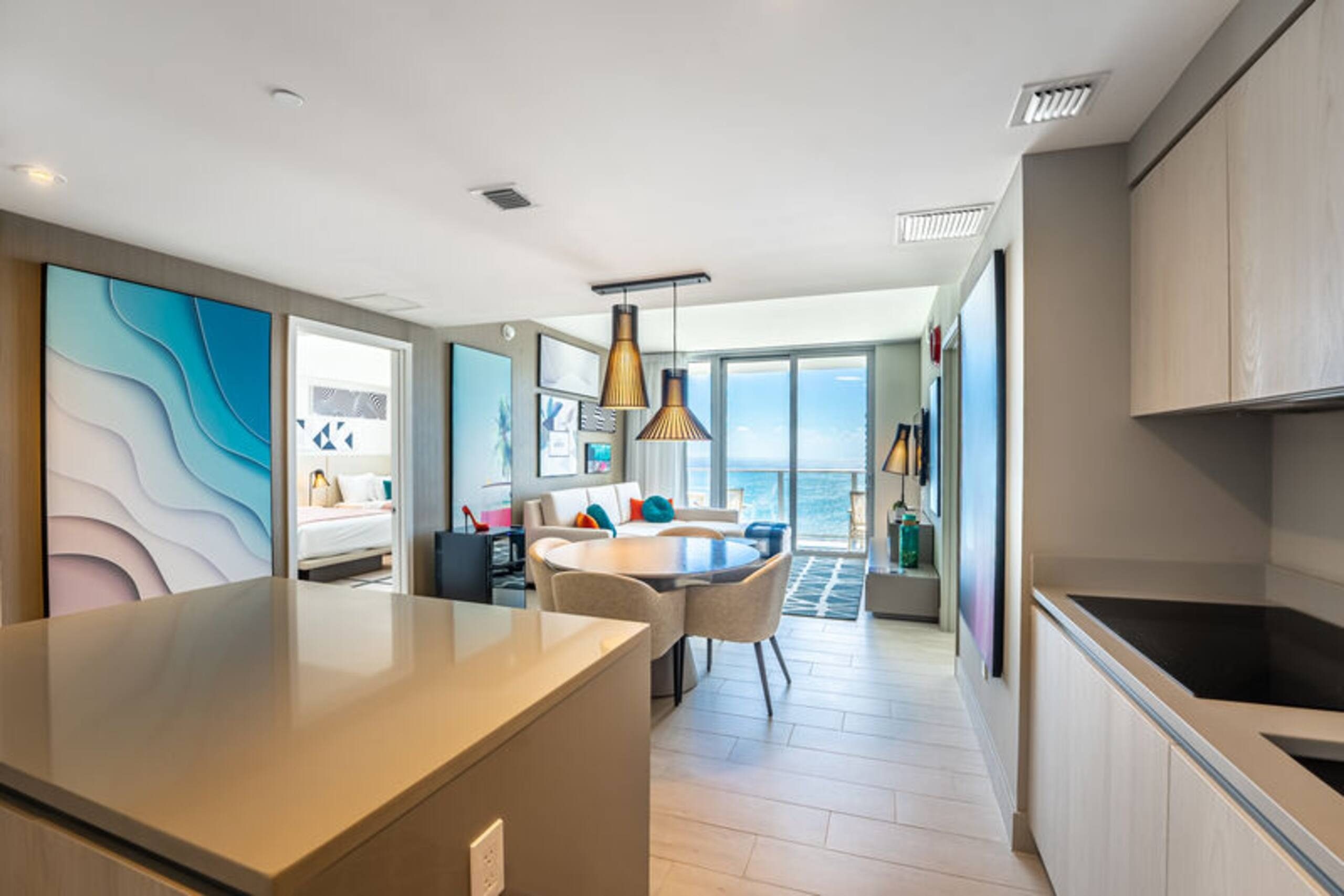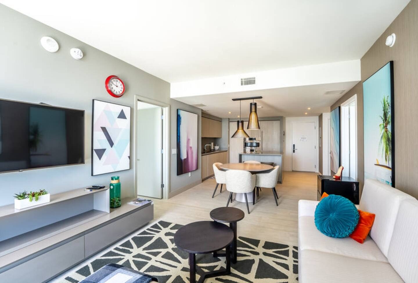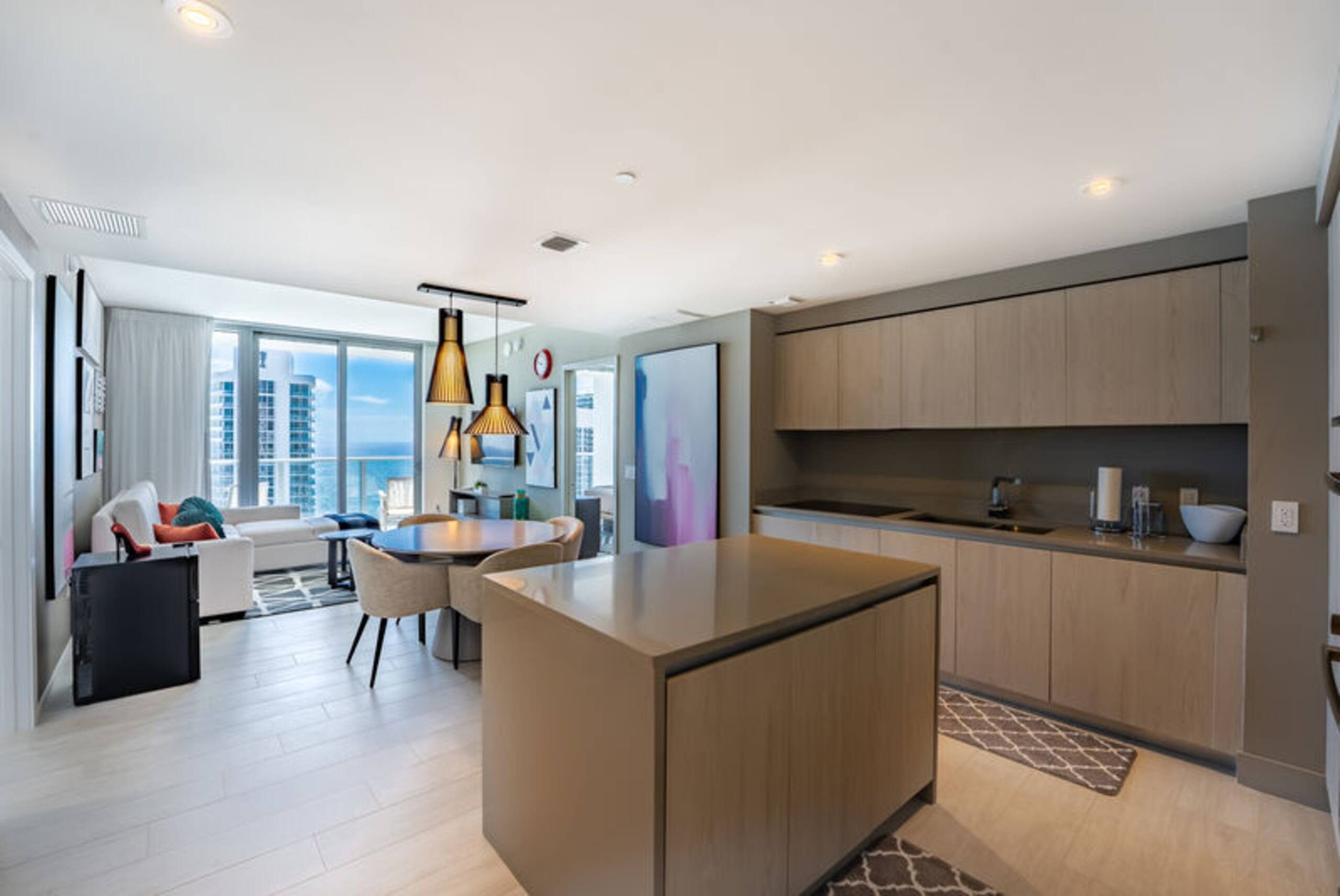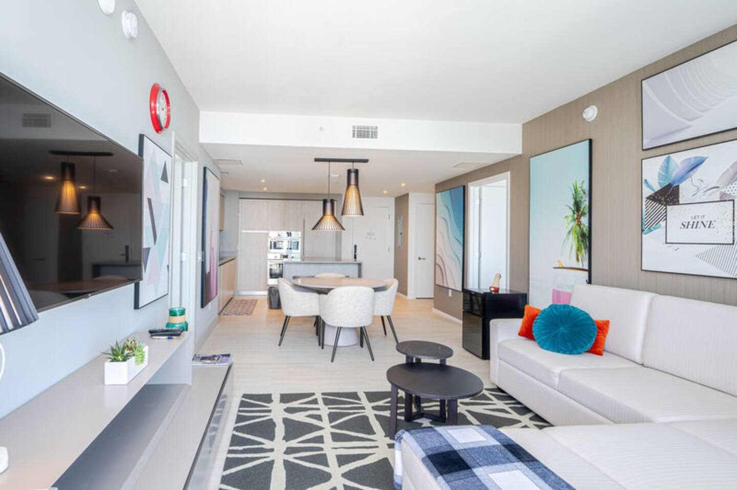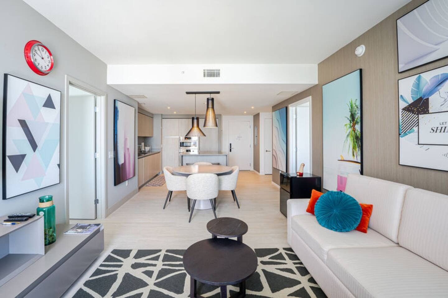 The apartment features a bright, open living and dining area with sleek furnishings, clean architectural lines, and a layout that supports both relaxation and social engagement.