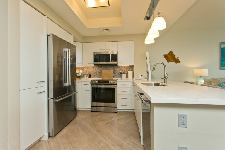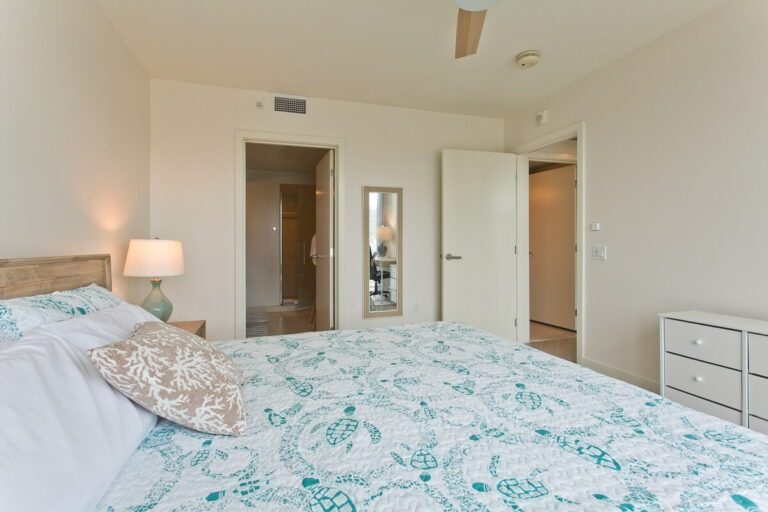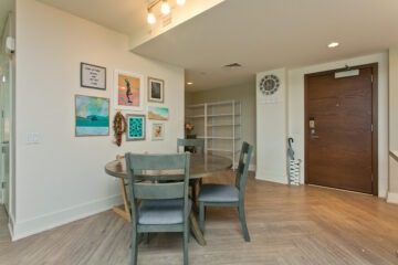 Inside, you’ll find a bright open living area with stylish coastal décor, floor-to-ceiling windows, and a private lanai — ideal for enjoying your morning coffee or sunset drink. The modern kitchen features stainless steel appliances, and both bedrooms are designed for comfort with soft linens, plenty of storage, and spa-style bathrooms.