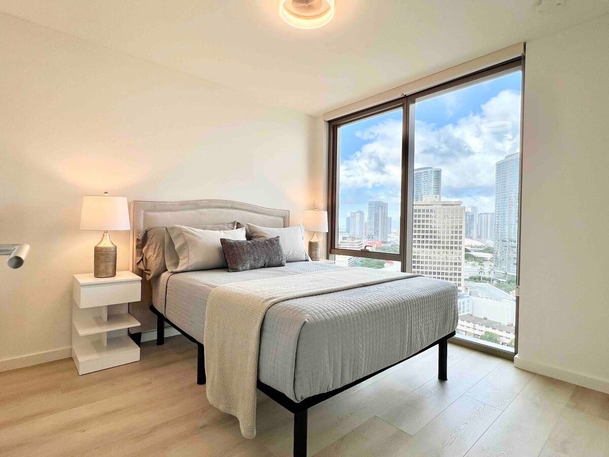 Two beautifully appointed bedrooms: the primary suite features an en-suite bathroom, premium bedding, and blackout curtains; the second bedroom is perfect for guests or children and includes easy access to the second bathroom.