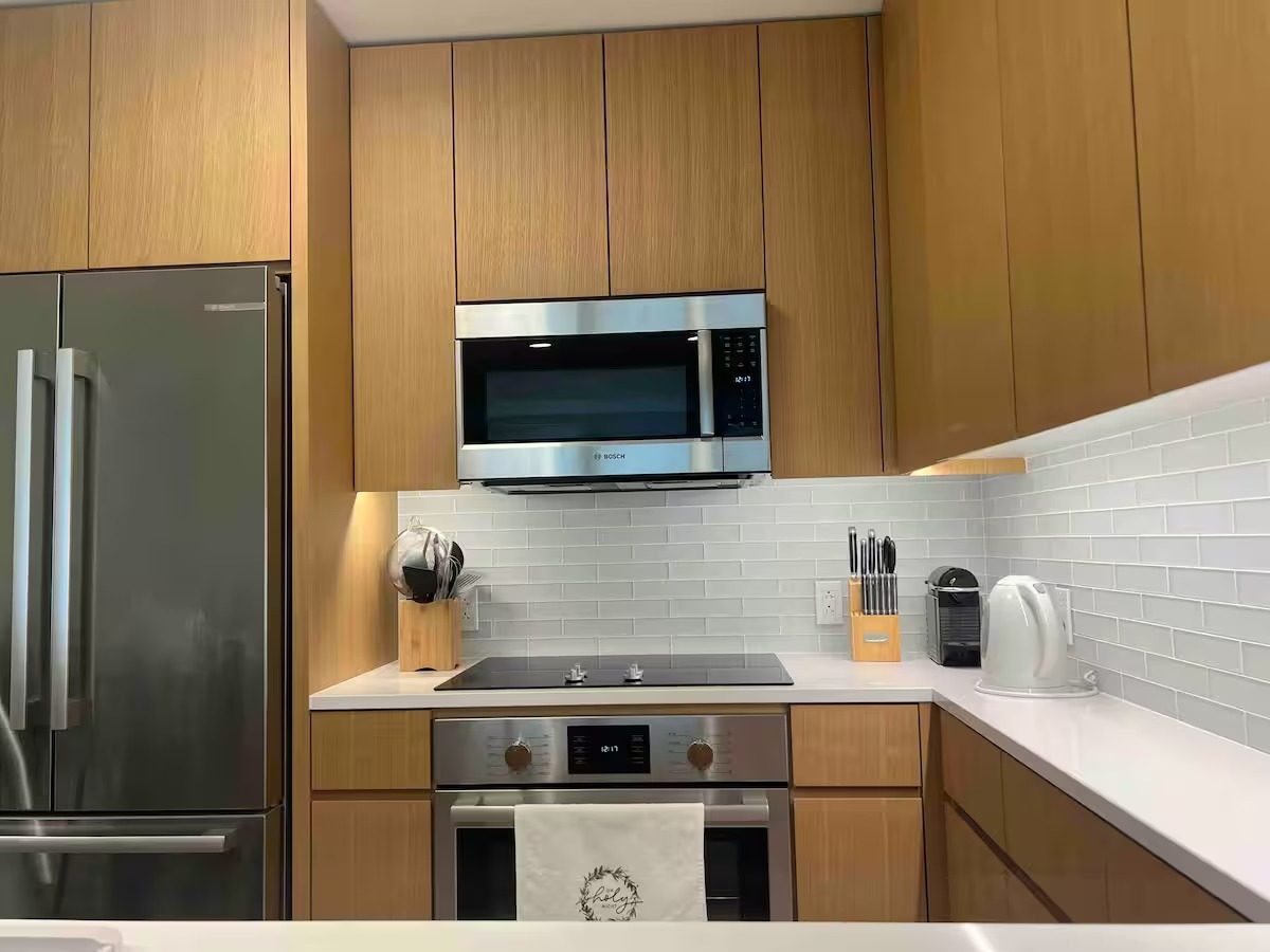 A fully equipped kitchen with stainless steel appliances, quartz countertops, a breakfast bar, and everything you need to whip up gourmet meals.