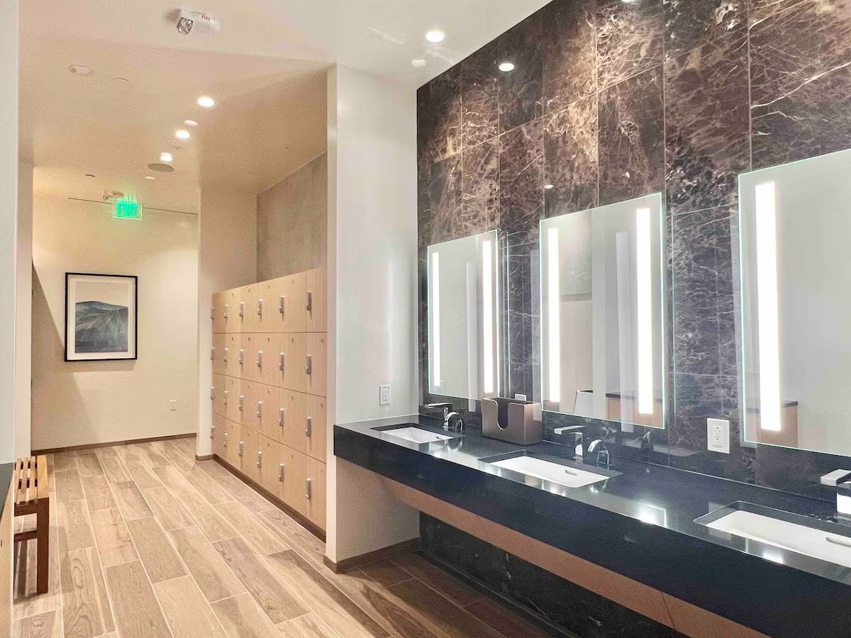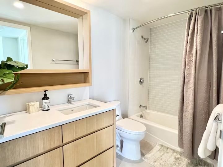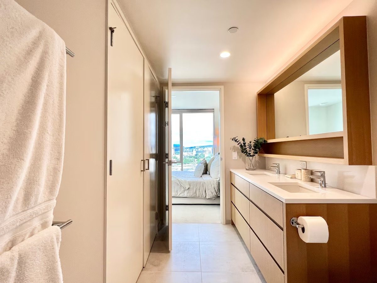 Two modern bathrooms finished with sleek fixtures, walk-in showers (or tub/shower combo if applicable), plush towels, and complimentary toiletries.