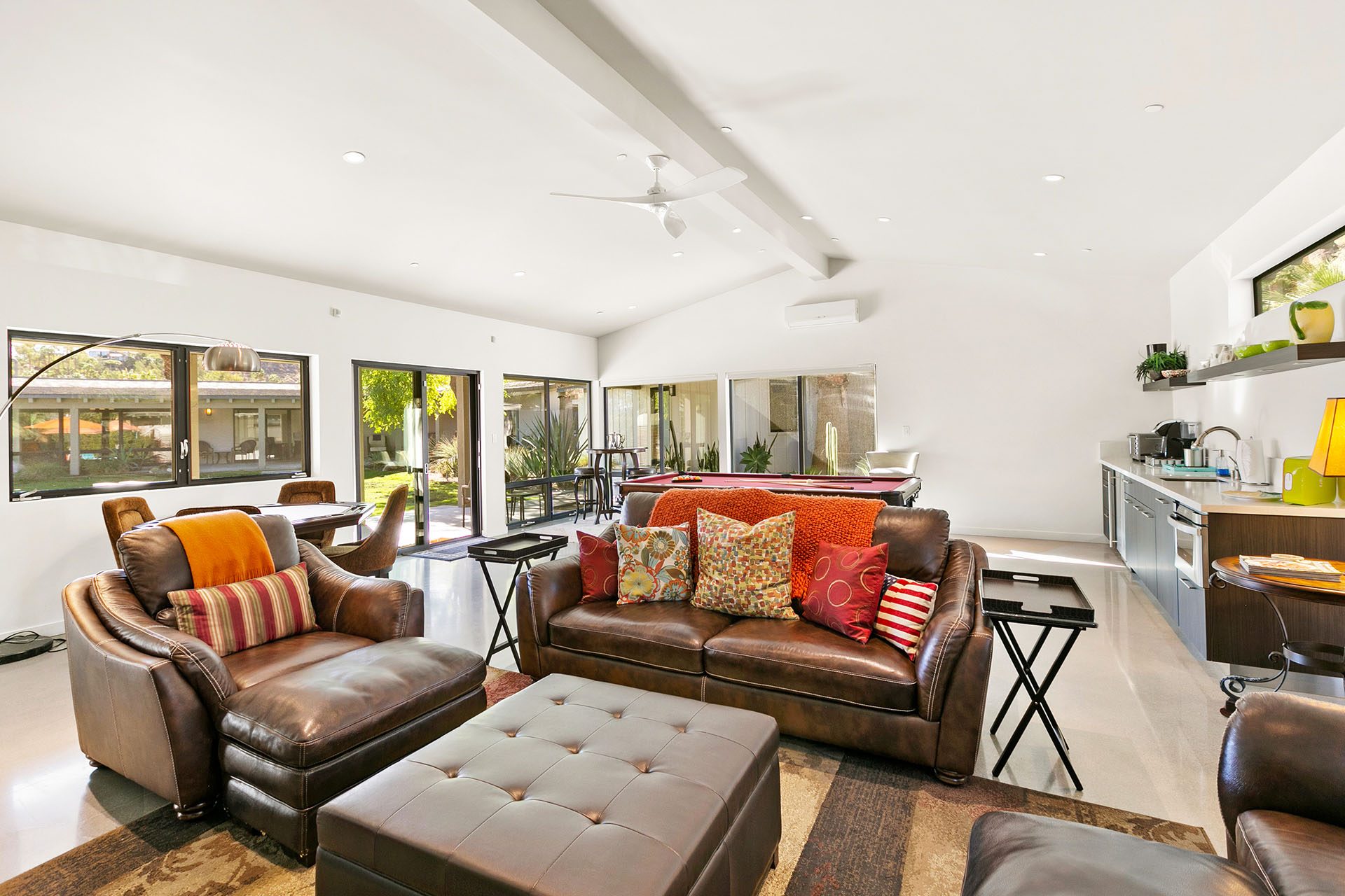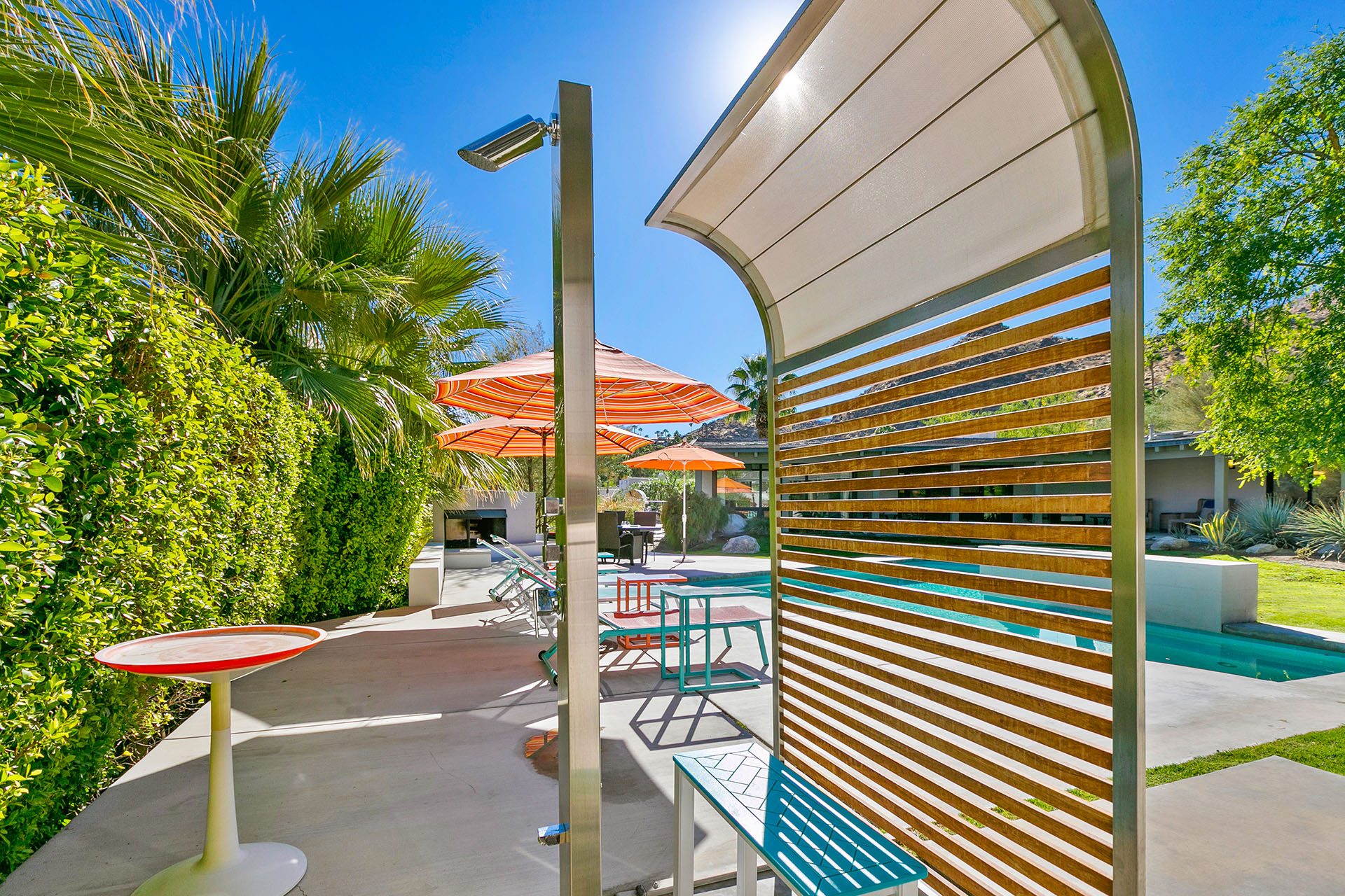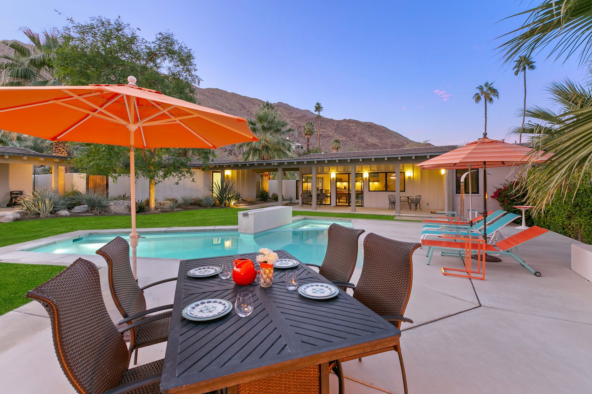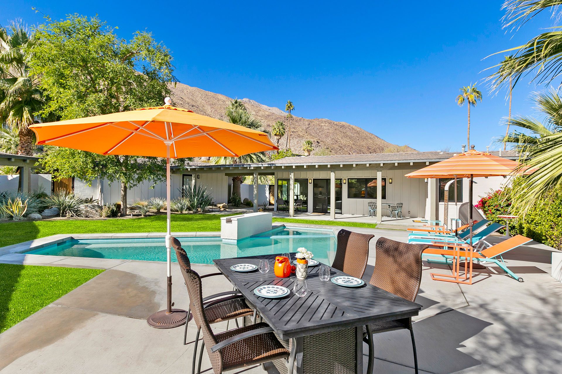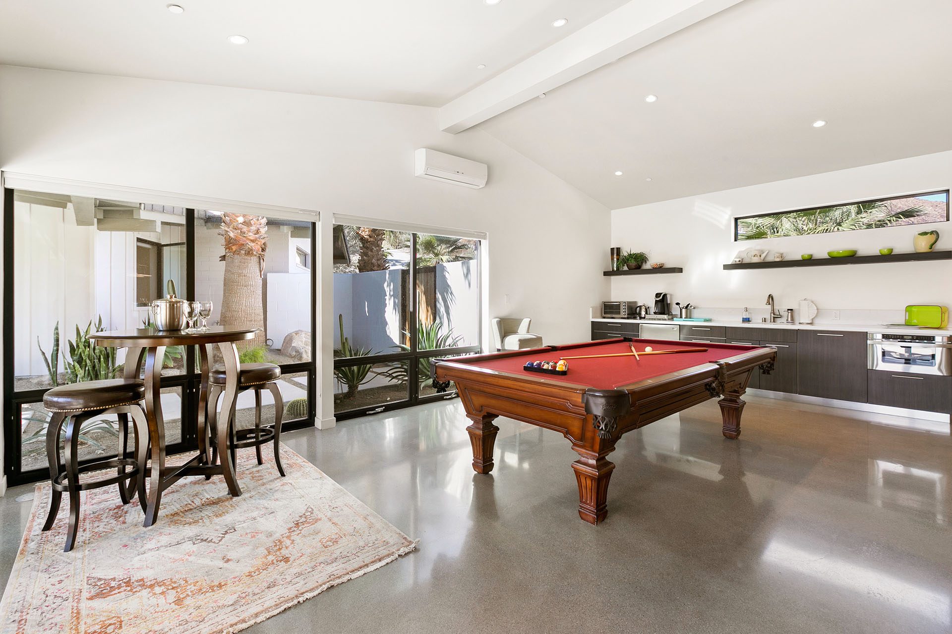 Mesa Ranch is a 4-bedroom compound on over an acre in Palm Springs historic Mesa neighborhood. Walled and gated for privacy, with landscaping, pool, spa, outdoor fireplace, outdoor shower, and close mountain views. The main house offers a gourmet kitchen, 3 bedrooms, and 3 baths. The guest house includes a pool table, poker table, kitchenette, and a private bedroom and bath.