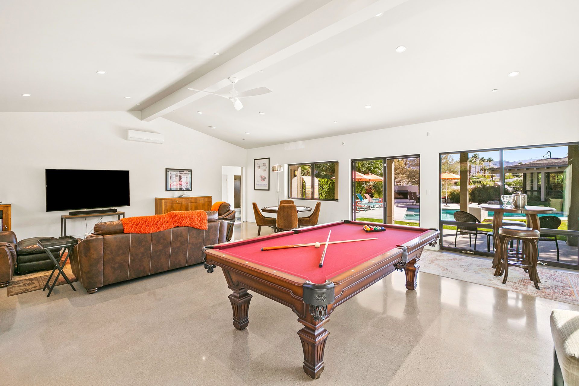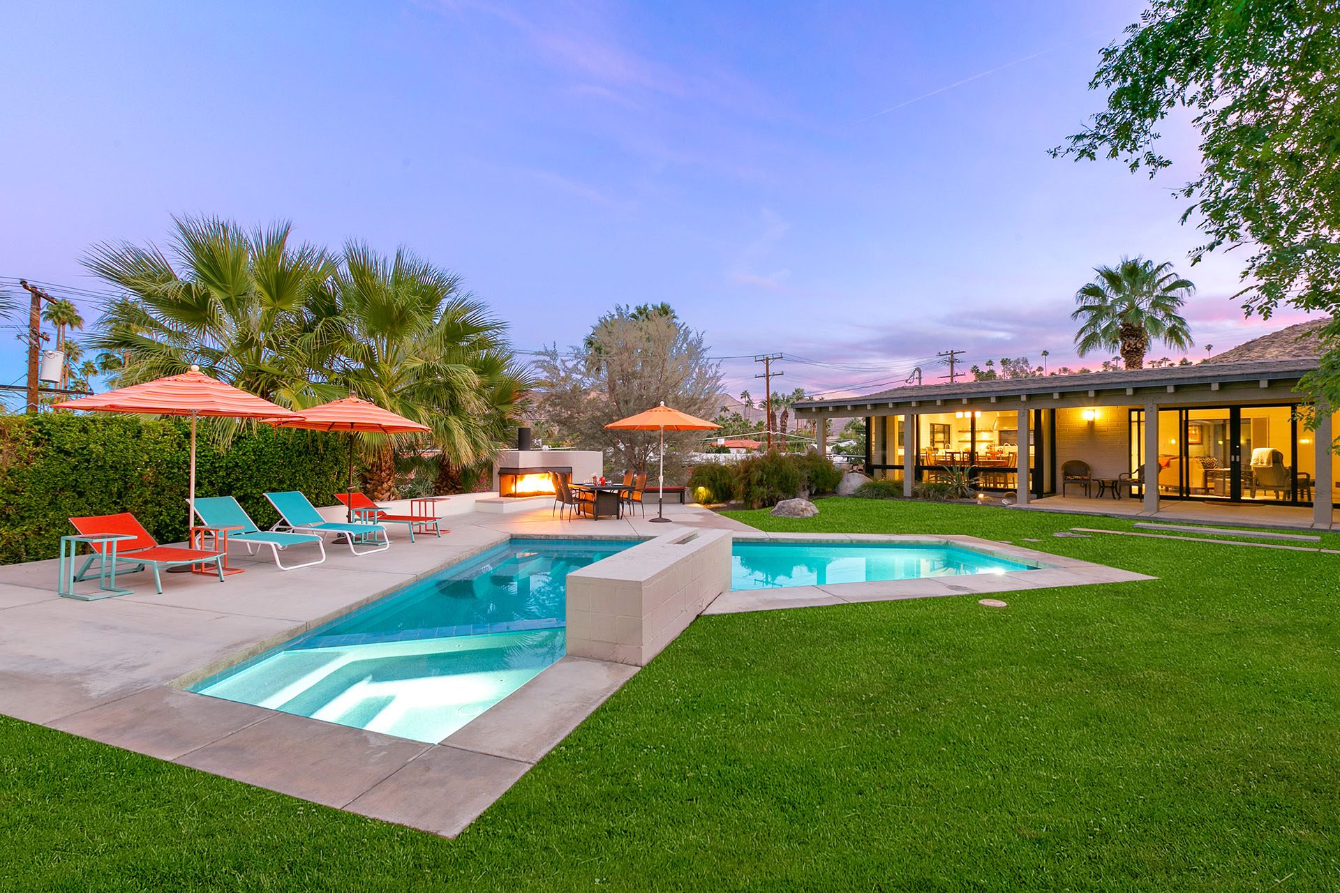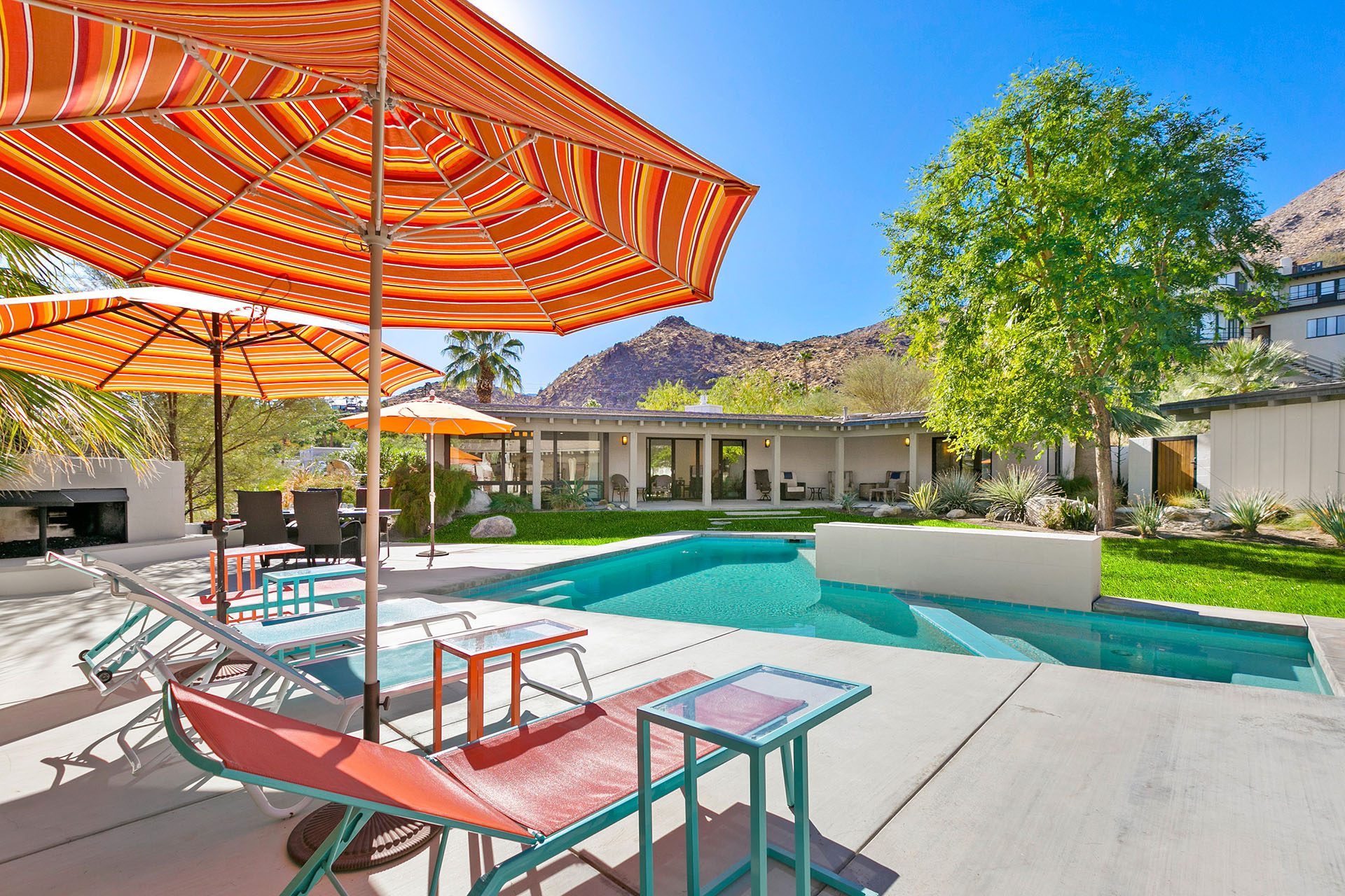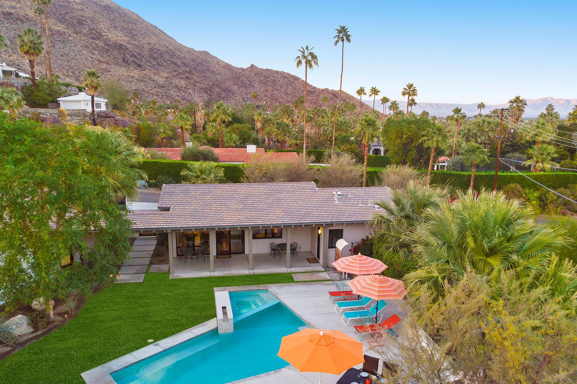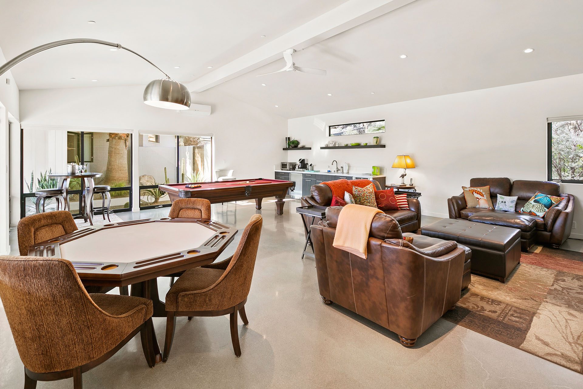 Mesa Ranch is a 4-bedroom compound on over an acre in Palm Springs historic Mesa neighborhood. Walled and gated for privacy, with landscaping, pool, spa, outdoor fireplace, outdoor shower, and close mountain views. The main house offers a gourmet kitchen, 3 bedrooms, and 3 baths. The guest house includes a pool table, poker table, kitchenette, and a private bedroom and bath.