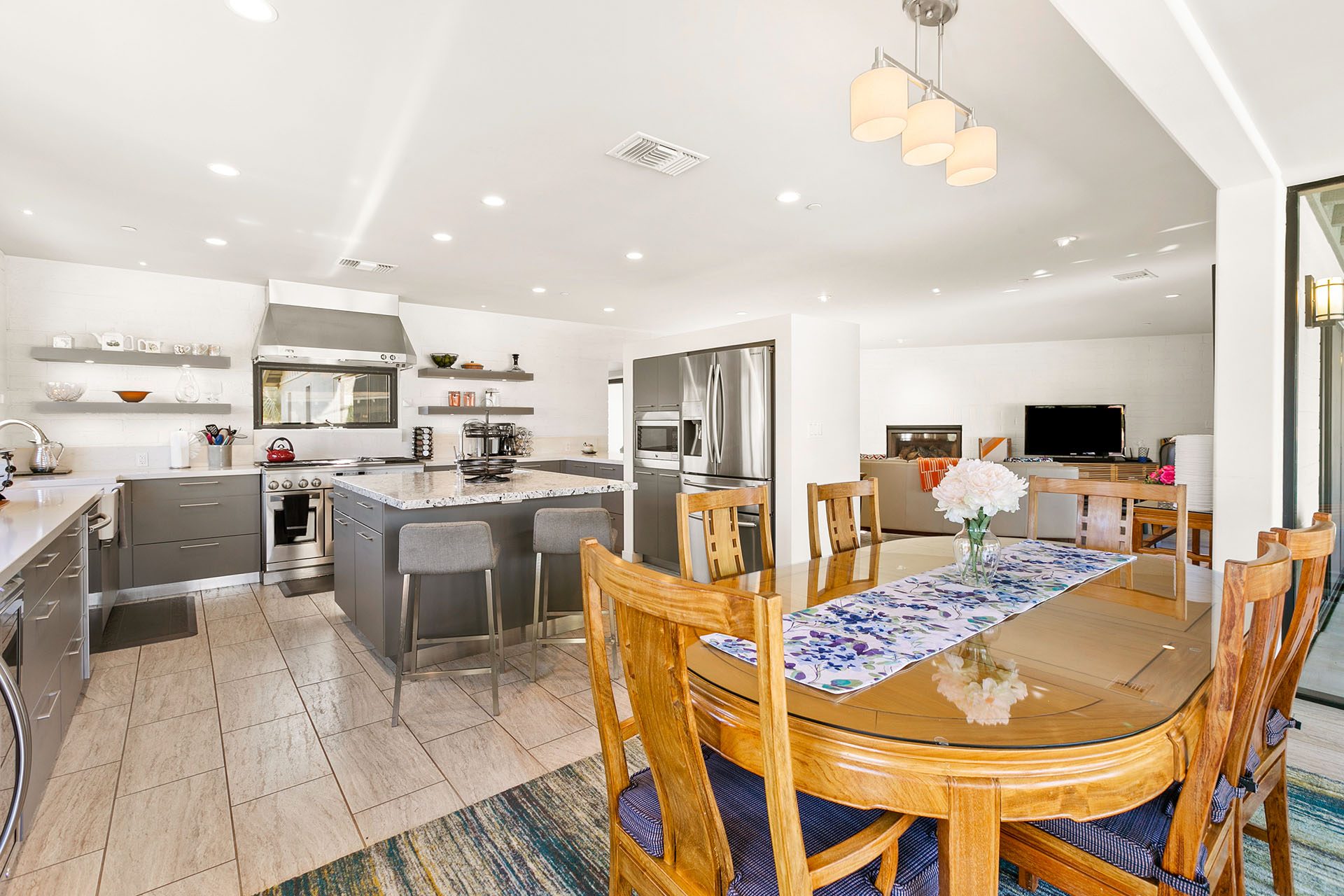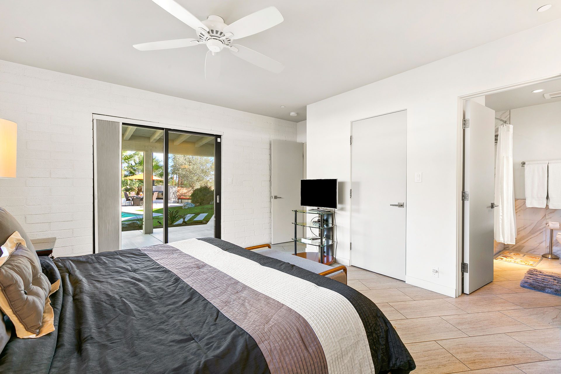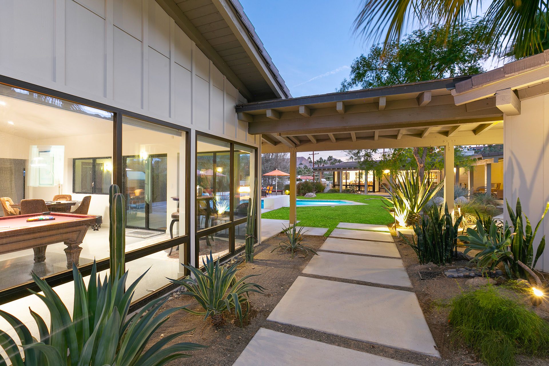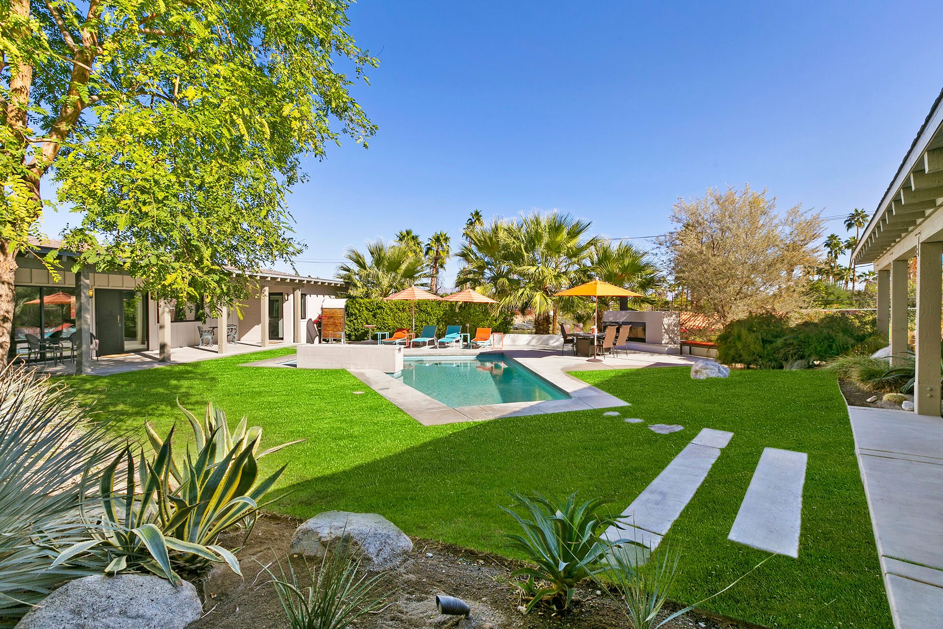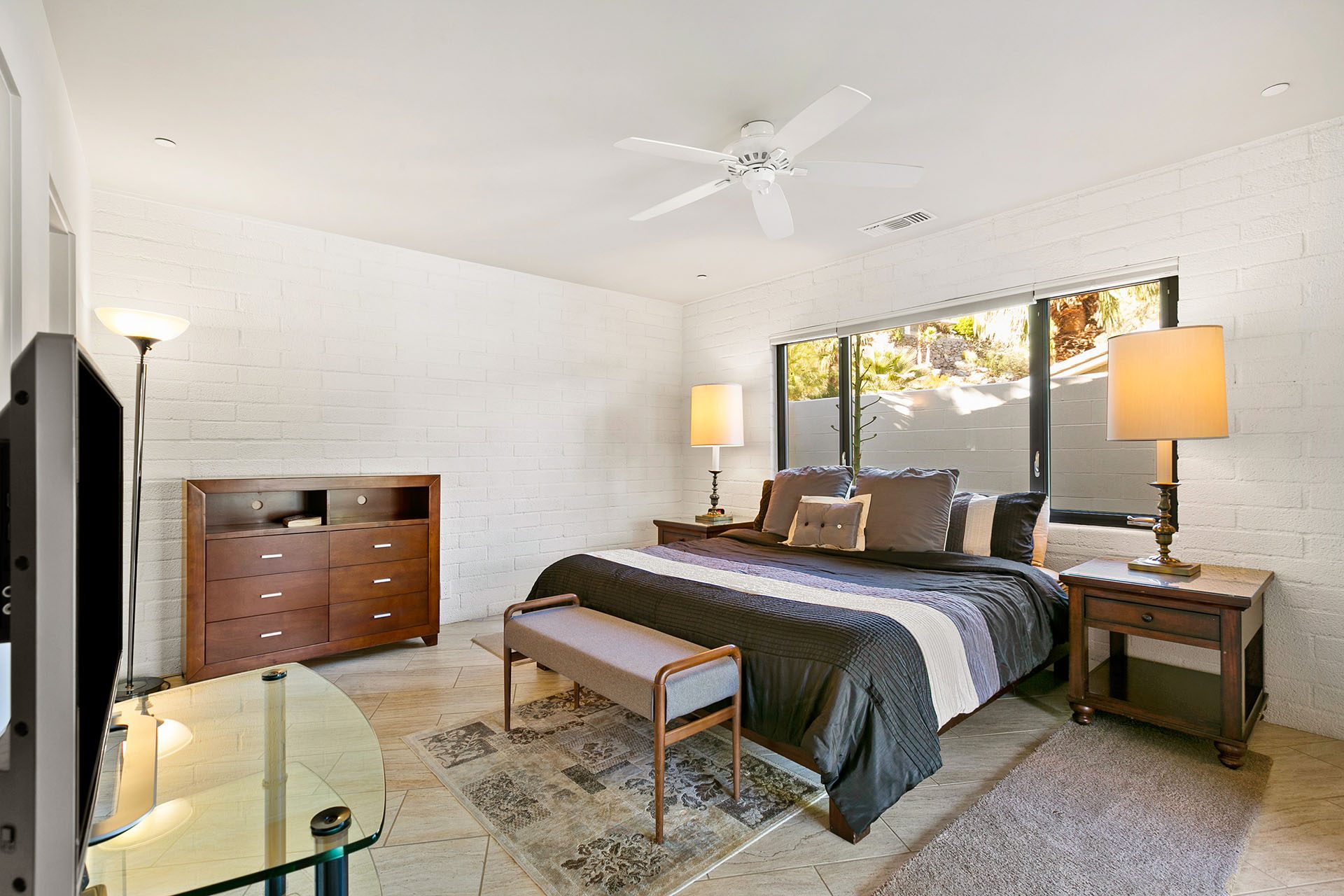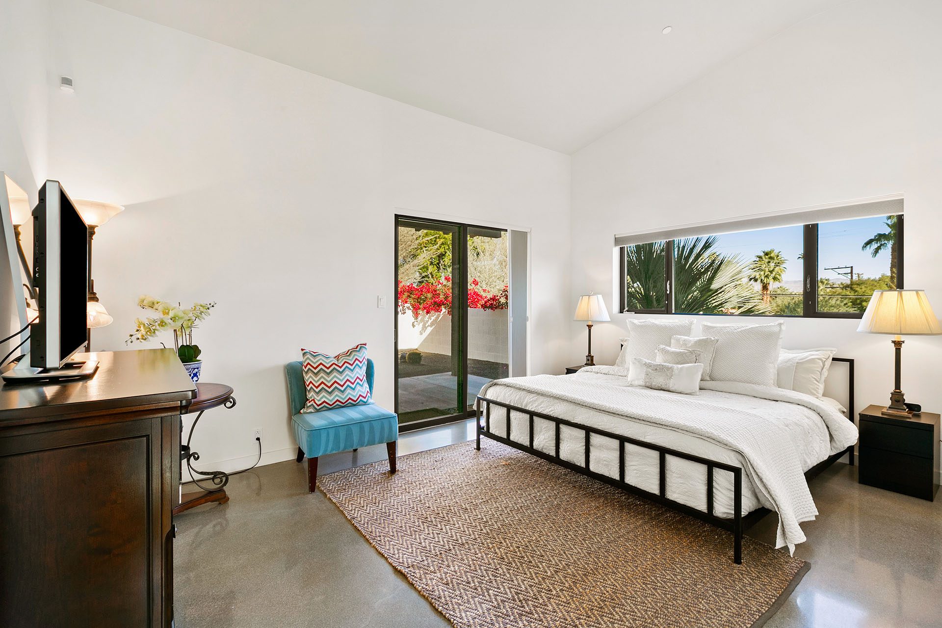 Mesa Ranch is a 4-bedroom compound on over an acre in Palm Springs historic Mesa neighborhood. Walled and gated for privacy, with landscaping, pool, spa, outdoor fireplace, outdoor shower, and close mountain views. The main house offers a gourmet kitchen, 3 bedrooms, and 3 baths. The guest house includes a pool table, poker table, kitchenette, and a private bedroom and bath.