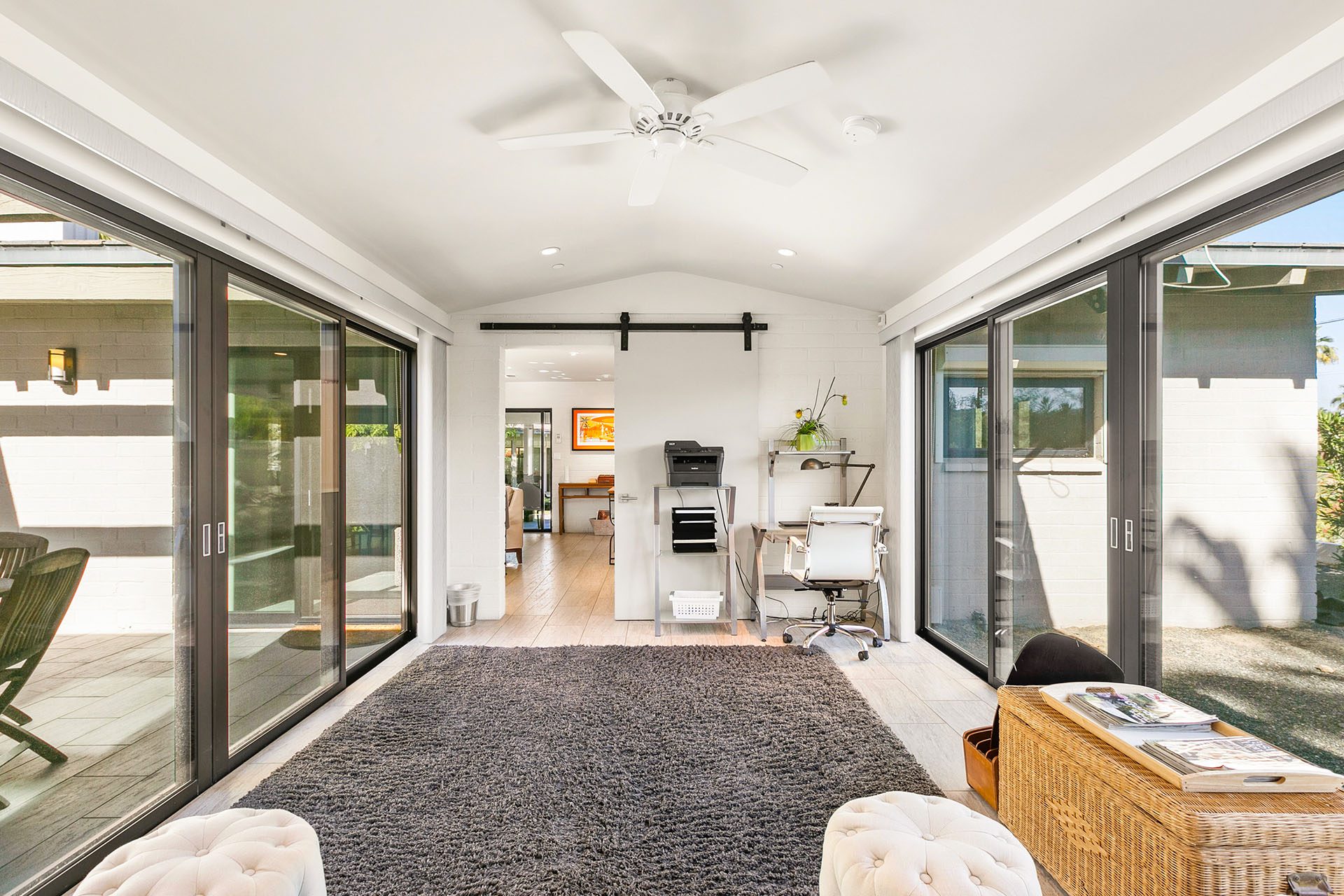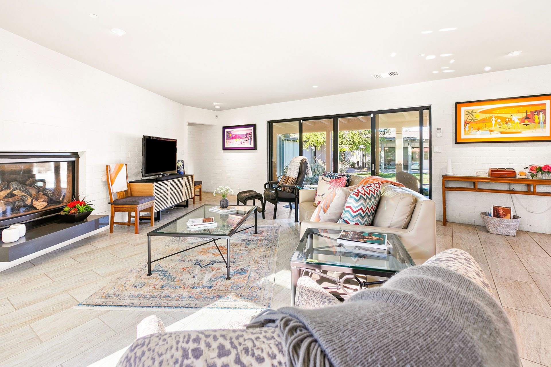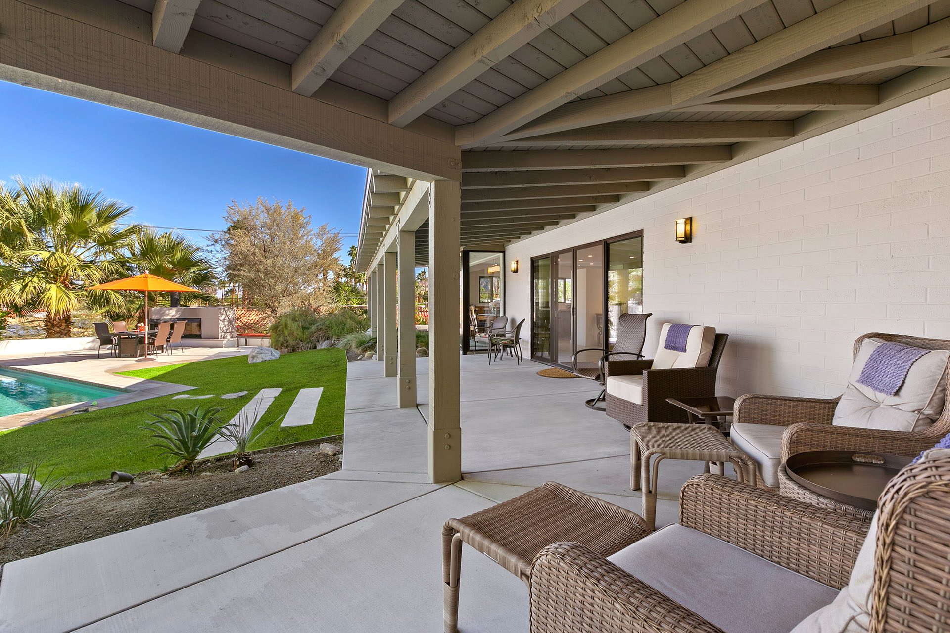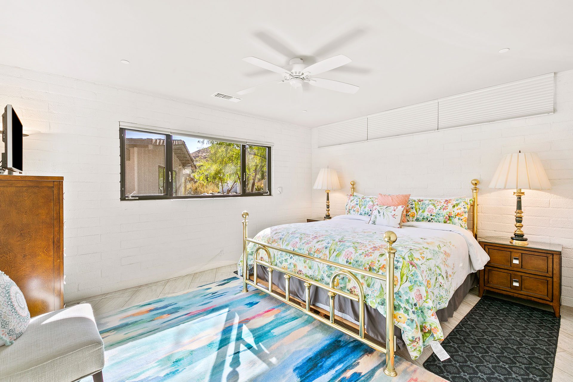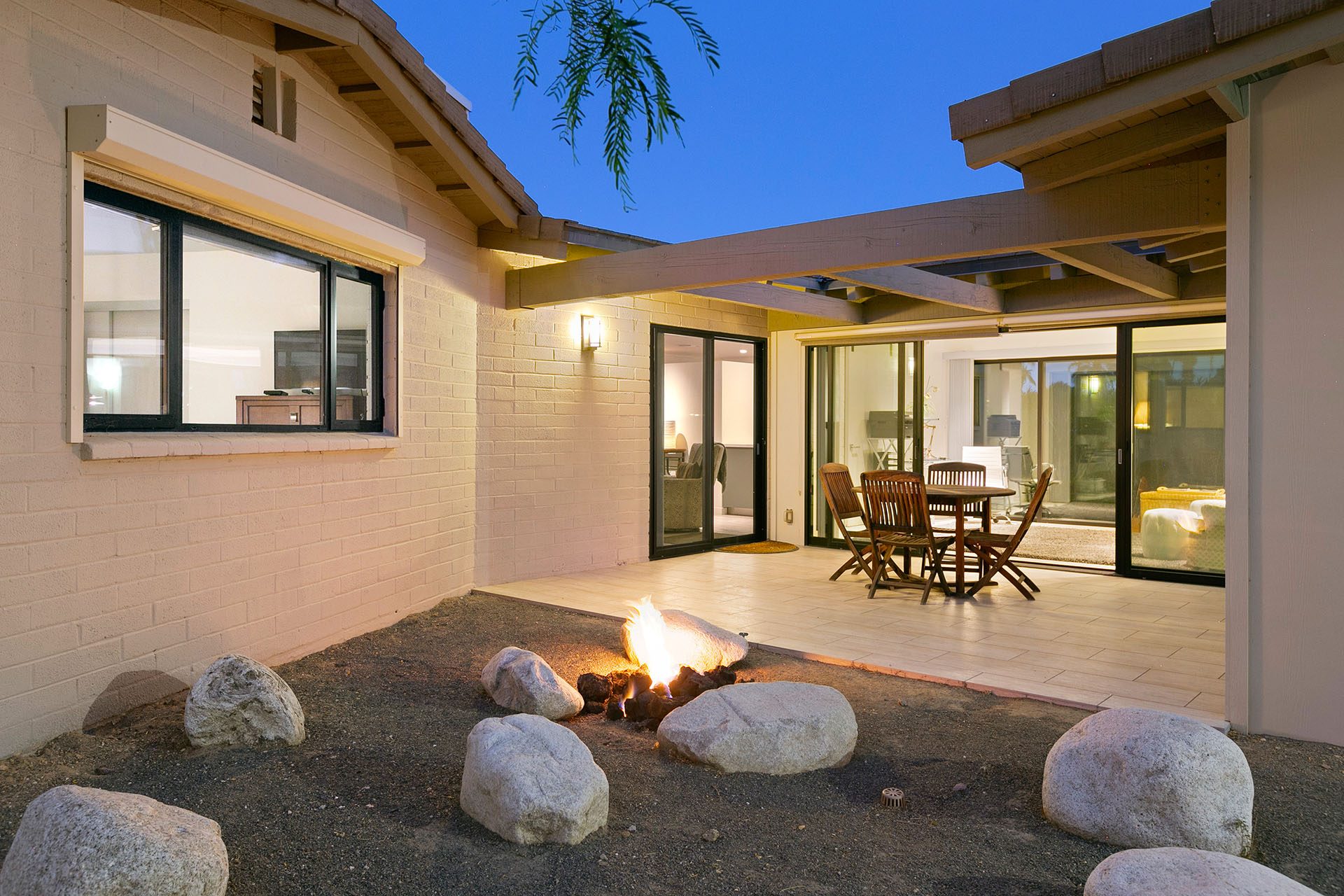 Mesa Ranch is a 4-bedroom compound on over an acre in Palm Springs historic Mesa neighborhood. Walled and gated for privacy, with landscaping, pool, spa, outdoor fireplace, outdoor shower, and close mountain views. The main house offers a gourmet kitchen, 3 bedrooms, and 3 baths. The guest house includes a pool table, poker table, kitchenette, and a private bedroom and bath.
