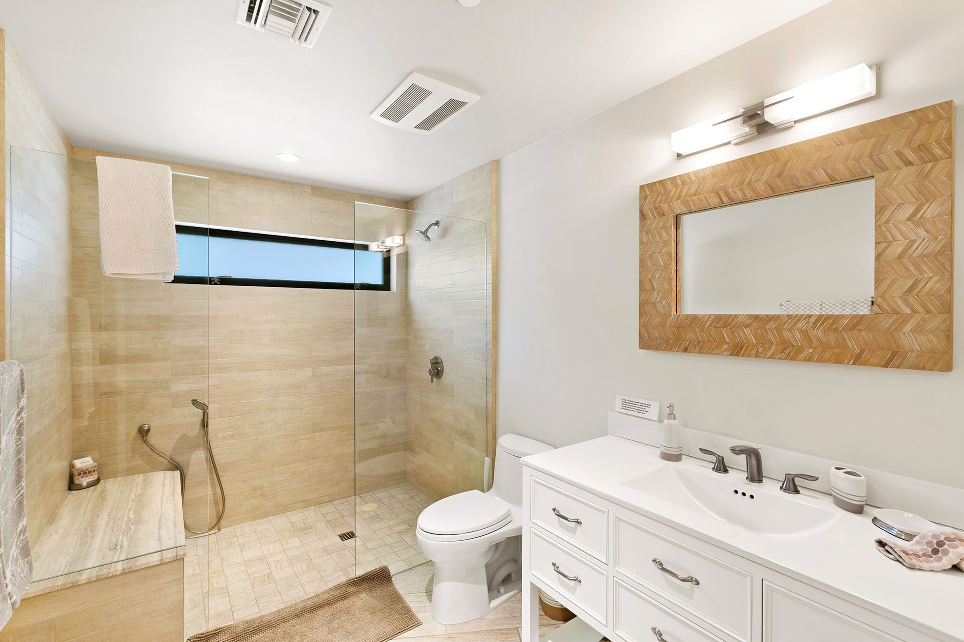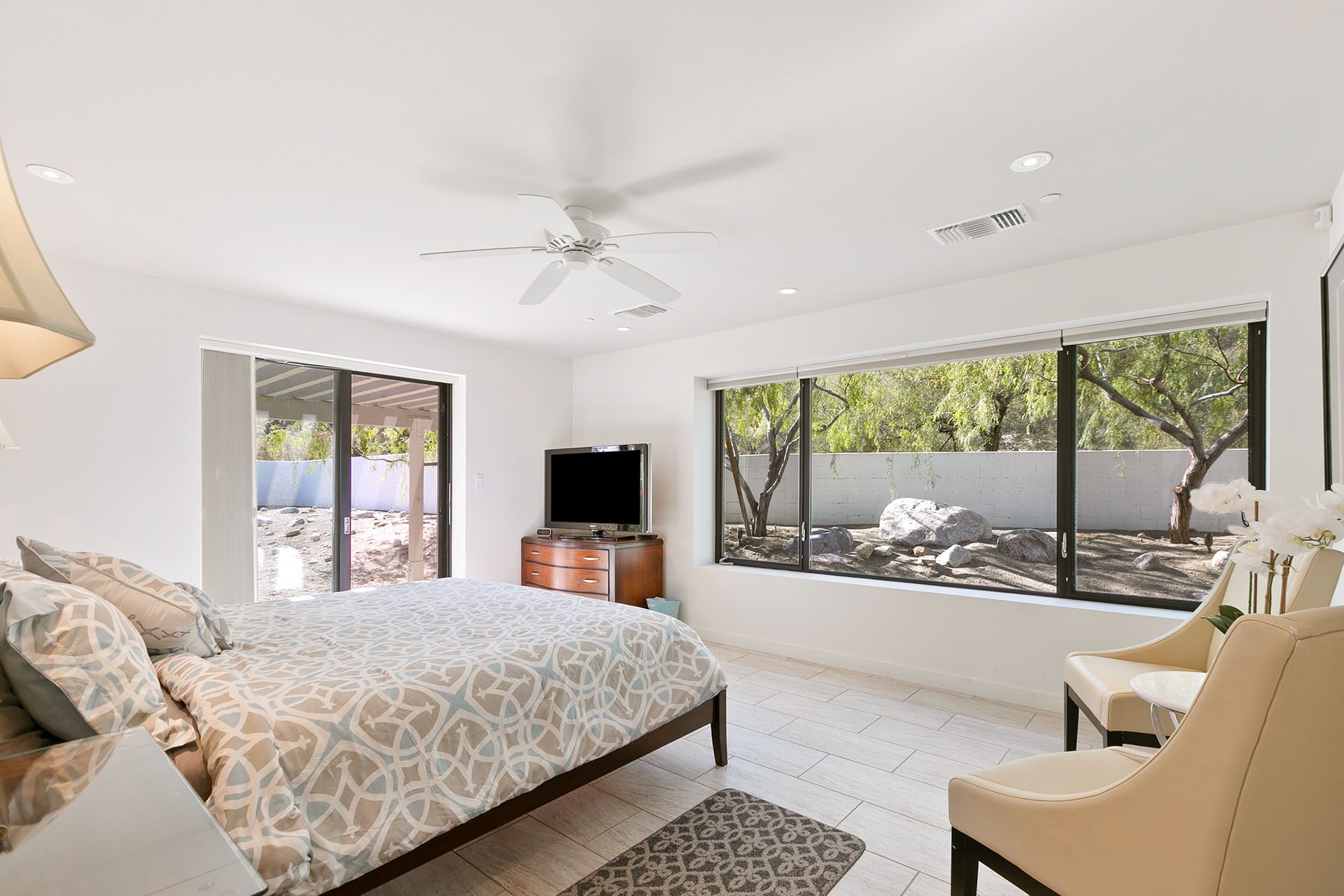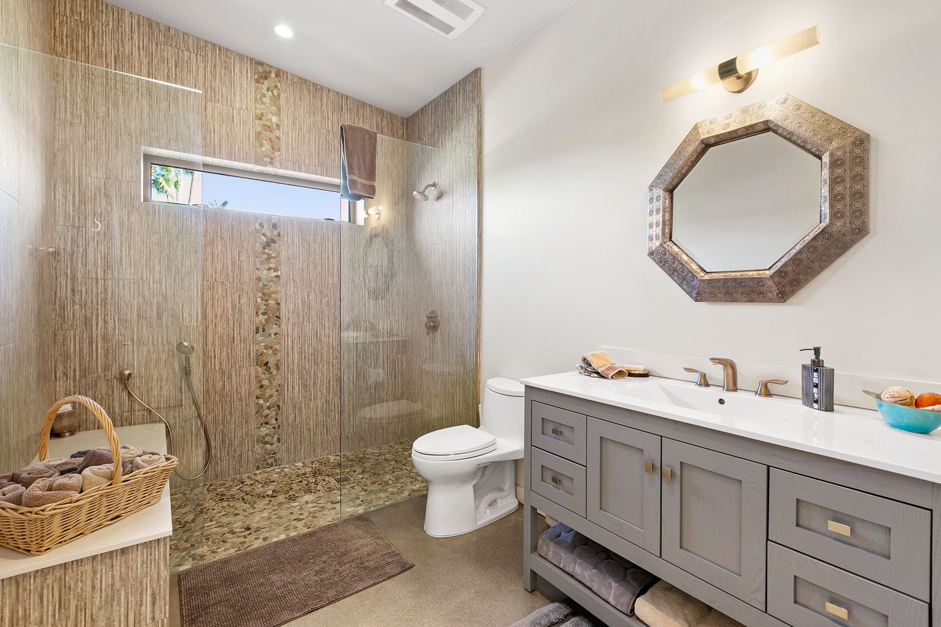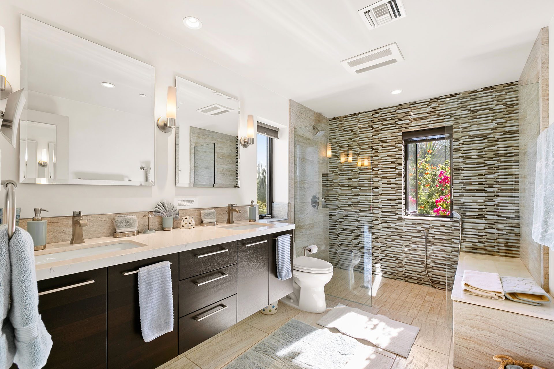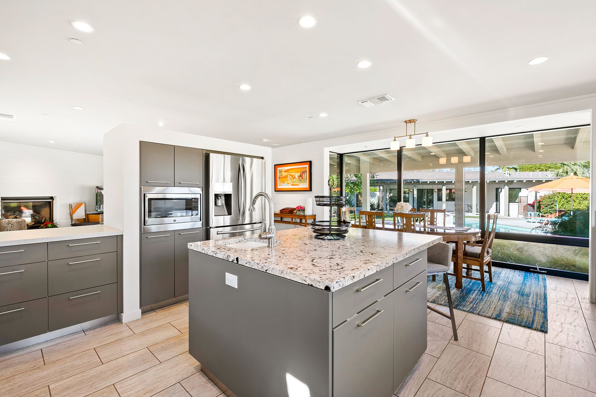 Mesa Ranch is a 4-bedroom compound on over an acre in Palm Springs historic Mesa neighborhood. Walled and gated for privacy, with landscaping, pool, spa, outdoor fireplace, outdoor shower, and close mountain views. The main house offers a gourmet kitchen, 3 bedrooms, and 3 baths. The guest house includes a pool table, poker table, kitchenette, and a private bedroom and bath.