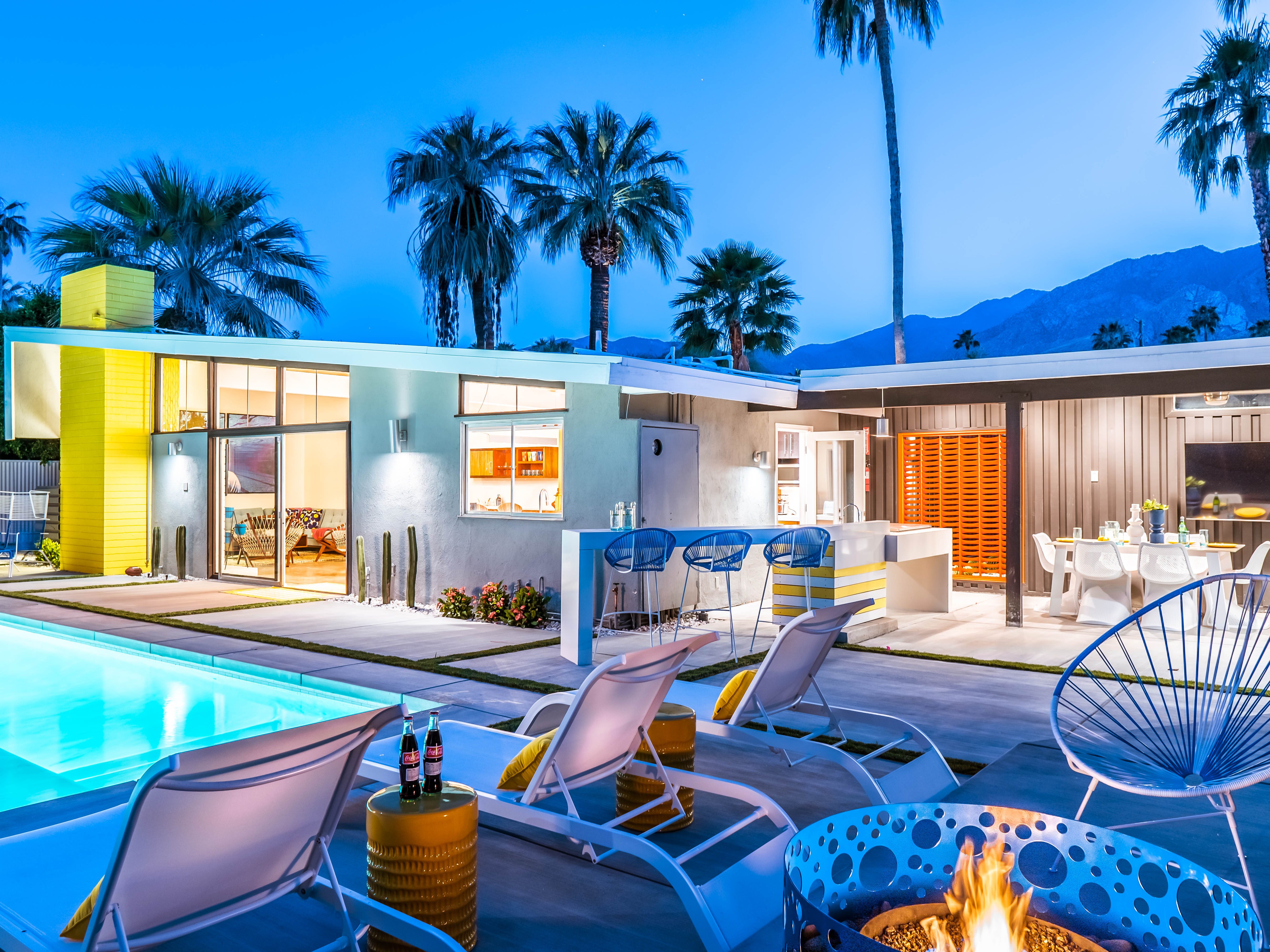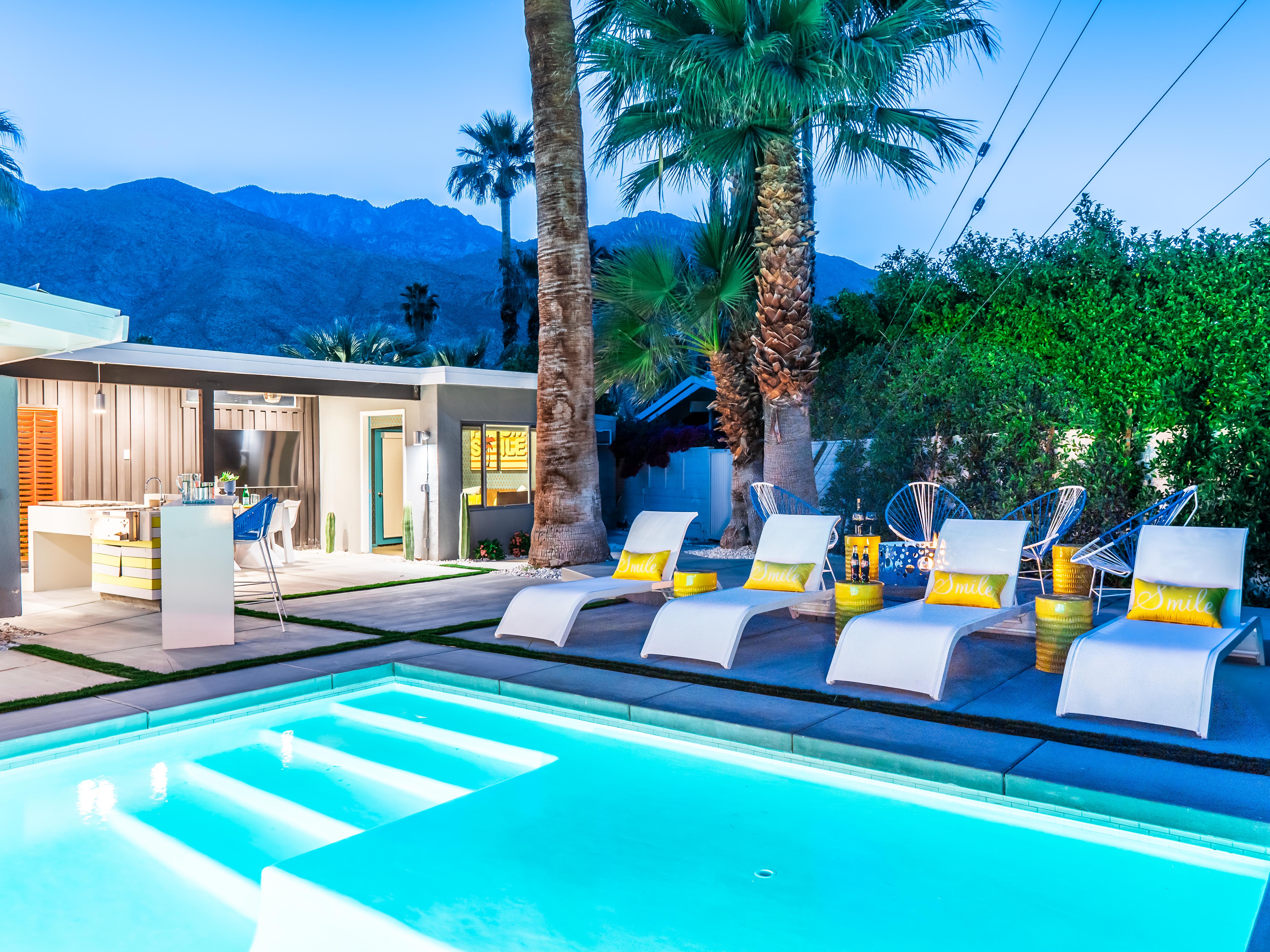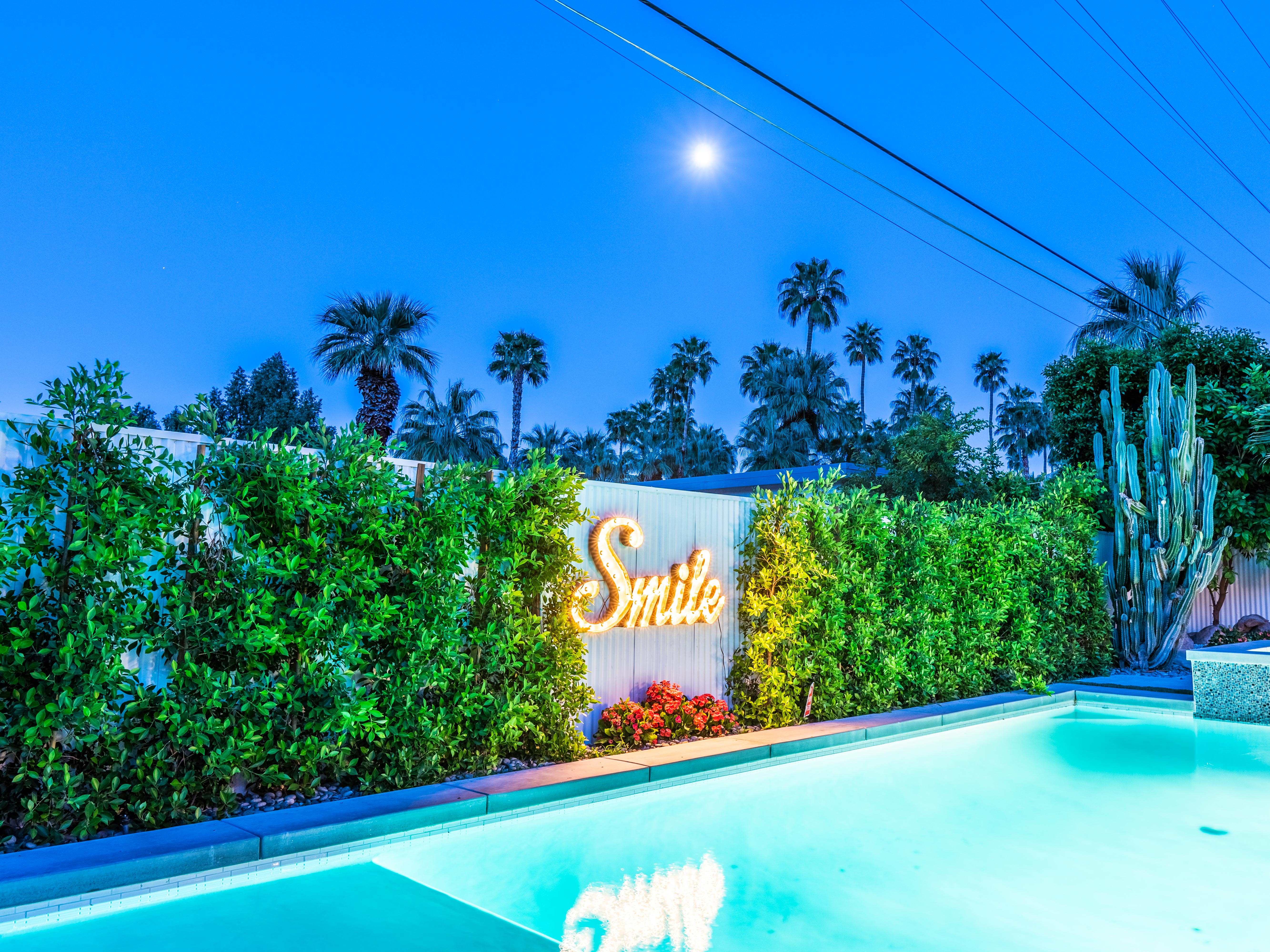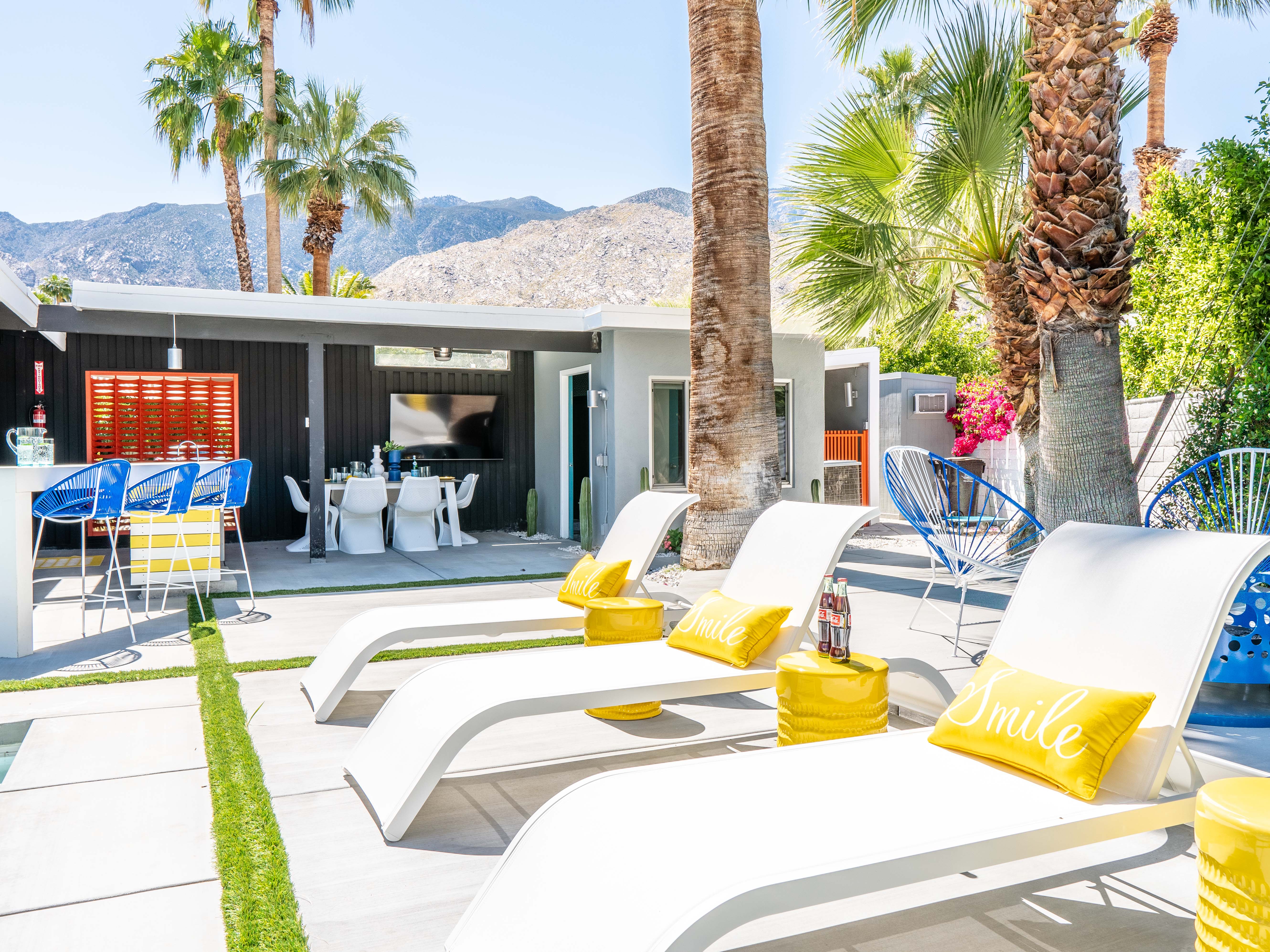 Designed by Starchitect Willian Krisel in 1958. Historic Twin Palms neighborhood. Modernism Week showpiece. Featured in Atomic Ranch Magazine. Saltwater pool, spa, firepit lounge and covered outdoor dining pavilion. Mountain views. Beds: K,K,K,F,T P.S. City ID #2248 **Primary renter must be a minimum of 25 years of age **GUESTS WILL BE REQUIRED TO SIGN A SEPARATE RENTAL AGREEMENT WITH HOST PER CITY REQUIREMENTS** to rent** Fabulous Location! Completely renovated and restored Mid Mod pool home by iconic Starchitect William Krisel. Recently updated by the PS Homeboys Design Team. Prime location in the historic Twin Palms neighborhood… just a quick stroll from the world famous Palm Canyon Drive. OUR HAPPY PLACE IN THE HEART OF PALM SPRINGS We are calling this fabulous vacation rental PS Smile. It is our Happy Place in the heart of Palm Springs. Created for Modernism Purists by Modernism Purists. This is the quintessential Palm Springs experience where it is all about the architecture, design, Mid Mod lifestyle and relaxing in the sunshine! Open concept floor plan, walls of glass, saltwater pool, spa, fire feature, covered outdoor dining pavilion with barbecue bar. Breathtaking mountain views. Flexible sleeping quarters for 6 adults plus two children. Additional napping areas. Beds: K,K,K,F,T MODERNISM WEEK SHOW PIECE Welcome to PS Smile - a fabulous pool home that has been showcased during Modernism Week for several years and was featured in Atomic Ranch Magazine. Recently purchased by new owners who have taken this iconic home to the next level. THE OUTDOOR LIVING SPACES Walled and gated for privacy, this property captures the nostalgic vibe of Palm Springs yesteryear while still being fresh and current - updated for the way we live today. The backyard itself has been carefully space planned - with lots of different gathering places. The heated saltwater pool has an integrated waterfall spa and a tanning deck. The yard also has a fire feature, covered outdoor dining pavilion, hard-lined gas BBQ, outdoor sink and island bar with seating. Cactus, palm trees and stunning mountain views all add to the magic of this special property. THE INTERIOR LIVING SPACES PS Smile has an eye popping chic designer style - with Instagram moments around every corner. The property owners worked with their design team to create the ultimate Palm Springs getaway. This is the type of property visitors return to year after year. It’s truly a delight to experience this phenomenal property - you will never want to leave. This classic midcentury Butterfly has been completely remodeled - yet still honors the home's midcentury architecture - preserving its clean lines, clerestory windows, open concept floor plan and walls of glass that blur the lines between indoor outdoor living. The living room, dining area and kitchen are all open to each other - providing enough space for your entire group to relax and enjoy. Everything has been updated for the way we live today - including new bathrooms, new kitchen, upgraded heating and cooling systems, high speed internet, 4 flatscreen TVs and a classically-Krisel gas fireplace. SLEEPING QUARTERS The high-style sleeping quarters offer flexible accommodations for all different types of traveling groups - from multi-generational families and golf foursomes to reunions for college friends and girls weekends. Plenty of room for everyone! Each bedroom features an ultra-comfortable hotel-quality mattress, flatscreen TV, private yard access and ample storage. The Master Suite has a King bed, private patio and en suite bath. There are also two King Guest Rooms in the main house that share easy access to the hall bathroom. Additionally there is a napping casita with a Full bed and poolside cabana with a twin-sized daybed. THE LOCATION PS Smile is perfectly located for those who want to be close to everything! This quiet residential neighborhood is ideal for walking and bike riding. Flat picturesque streets are lined with towering Palm Trees and gorgeous architecturally significant properties. You will be close to hiking trails, fine dining restaurants, coffee houses, entertainment venues and local conveniences like grocery stores, sandwich shops, and burger joints. Certain dog breeds under 65 lbs are allowed at this home, the dog fee is $195 (2 dogs maximum).Amenities