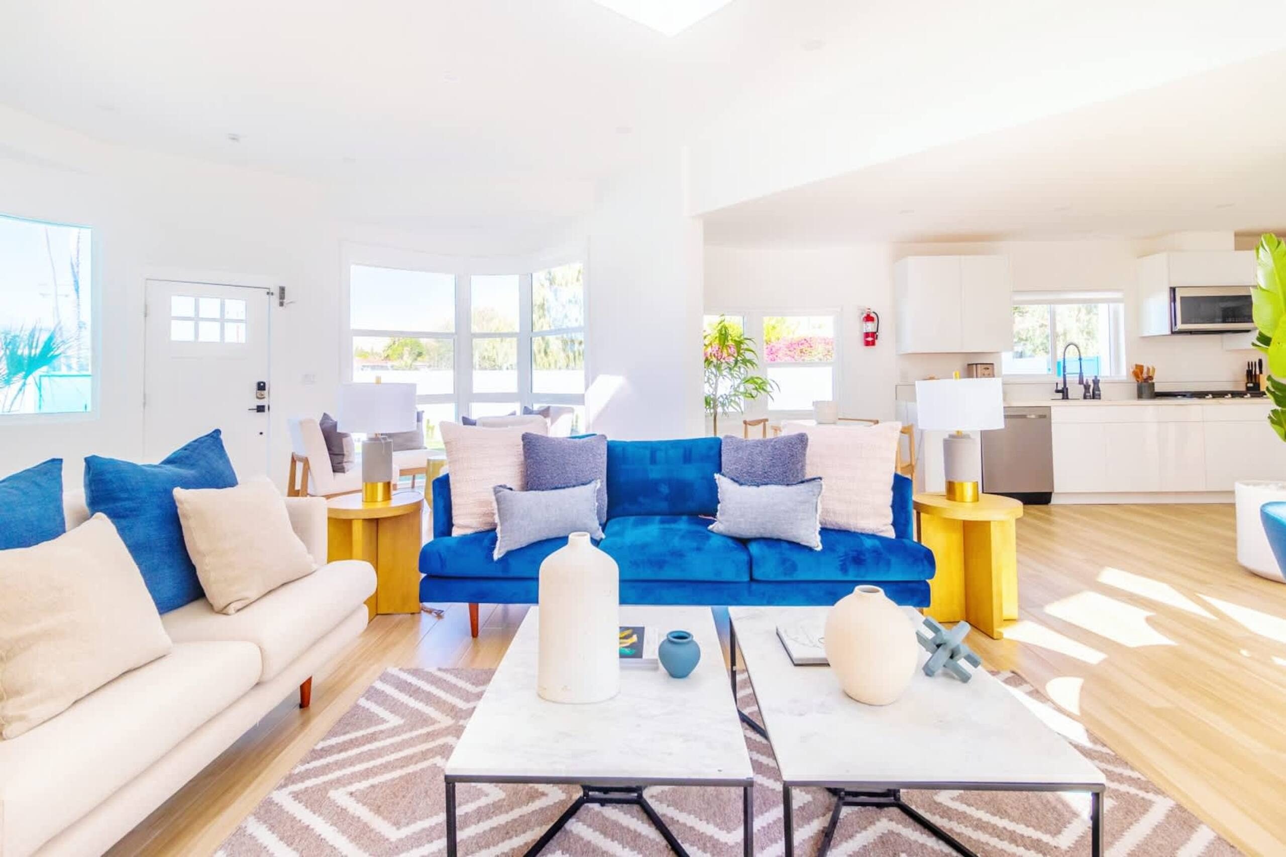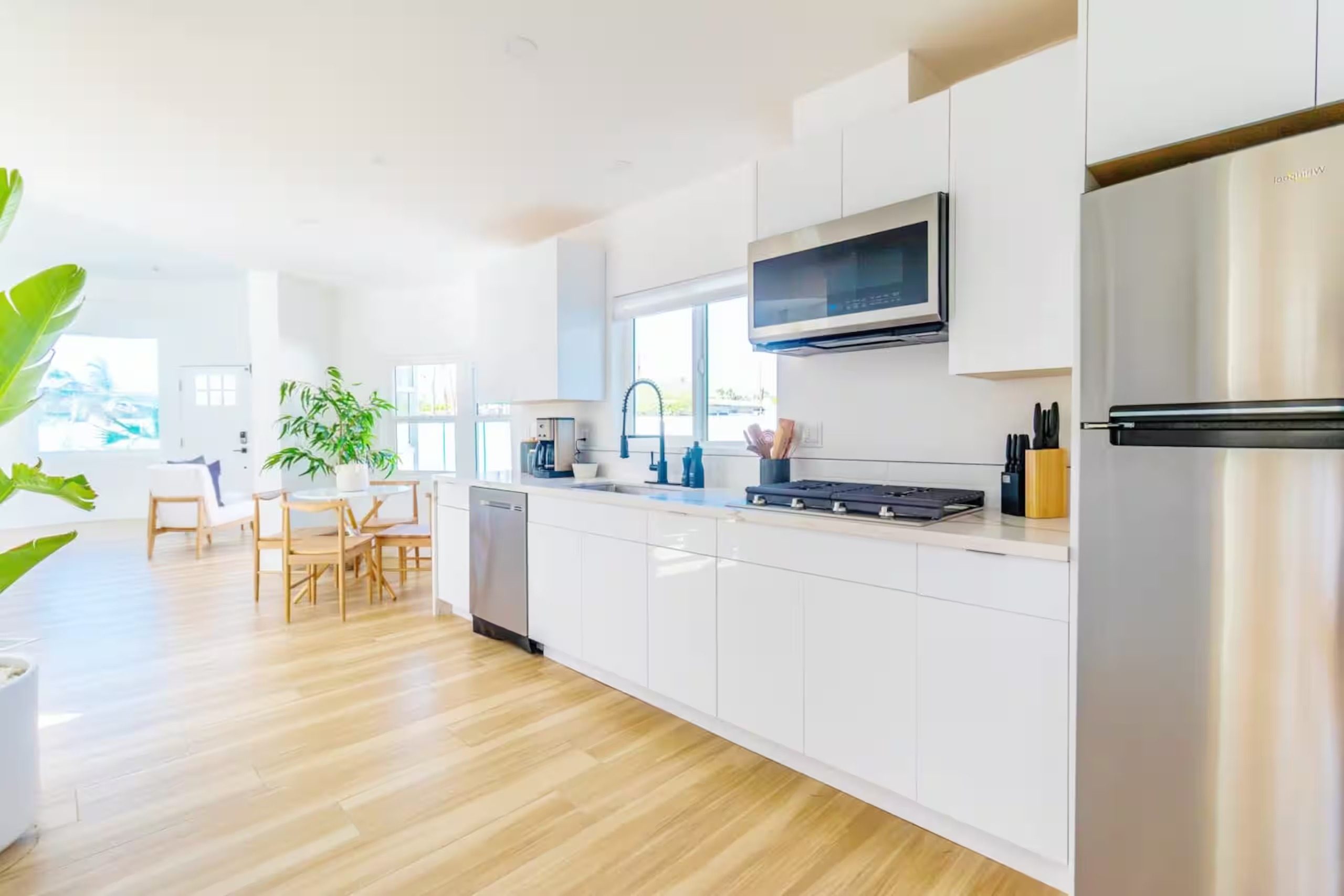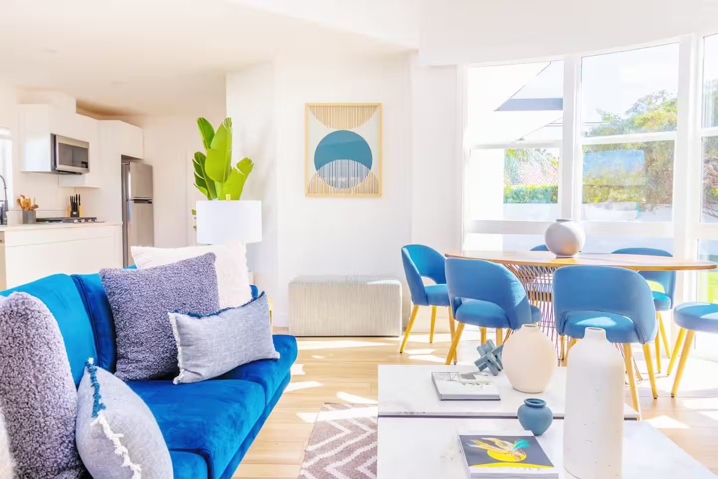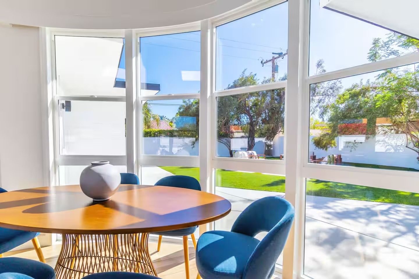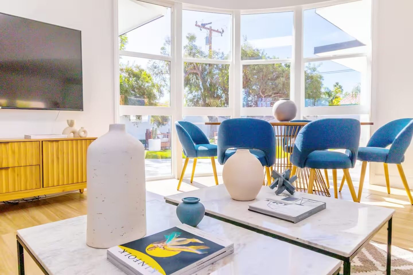 Step into bright, airy living spaces where modern décor meets cozy desert charm. The open-concept living and dining areas connect seamlessly to a fully stocked kitchen (please note: no oven)—perfect for easy meals, morning coffee, or evening gatherings after a day by the pool.