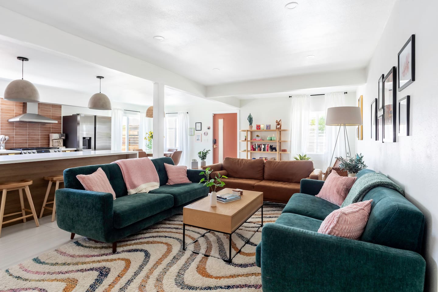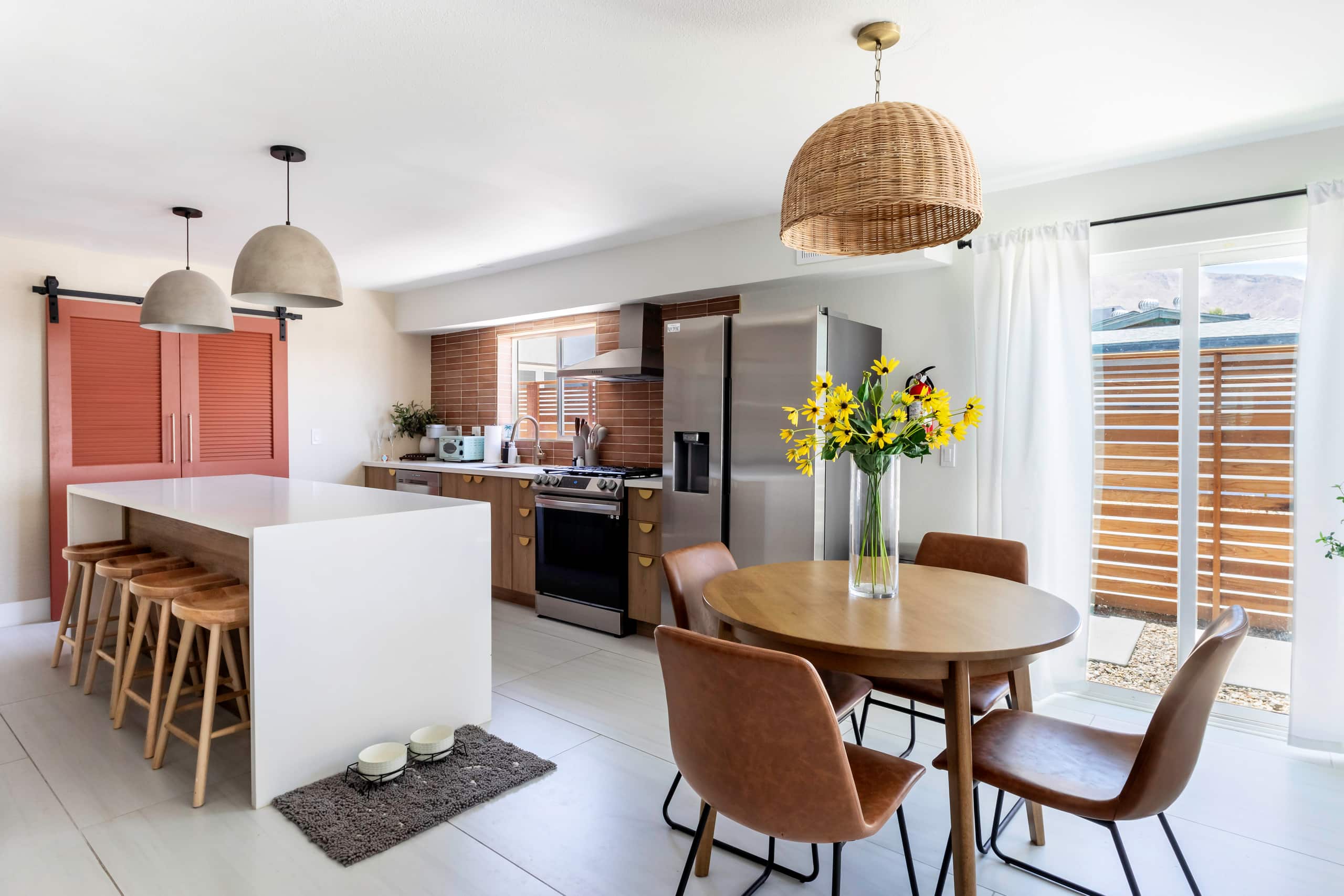 The living area offers comfortable seating and a relaxed setting to unwind after a day exploring nearby beaches or local sights. A fully equipped kitchen provides everything you need to prepare meals with ease, while the adjacent dining area invites shared moments and memorable meals.