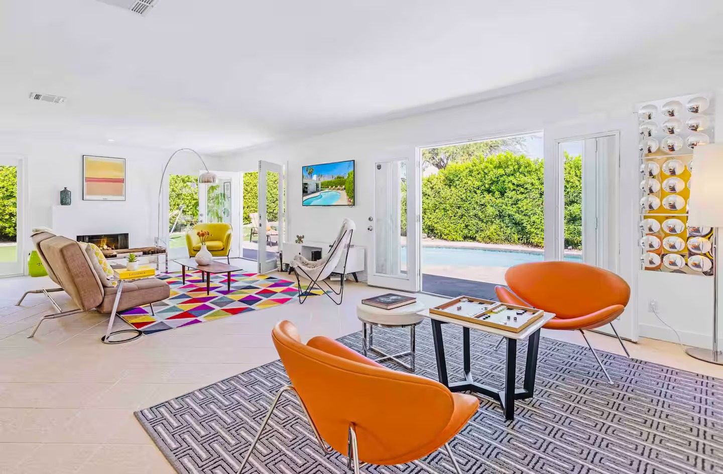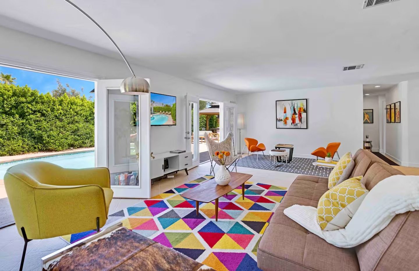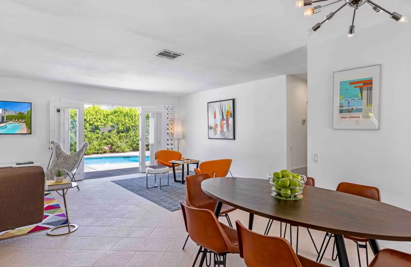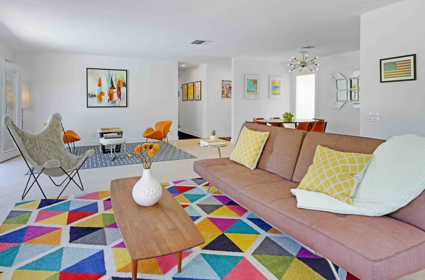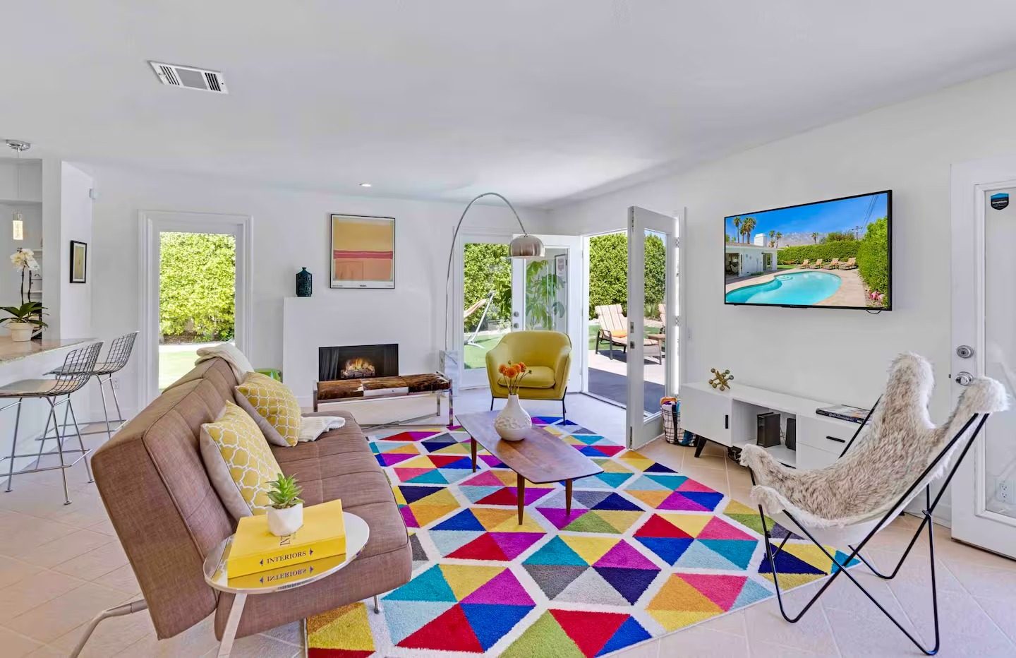 Step into a bright, airy living area that flows seamlessly into a fully equipped kitchen. Bold desert-inspired colors, mid-century touches, and boho-chic accents create a warm, joyful atmosphere that feels instantly relaxing.