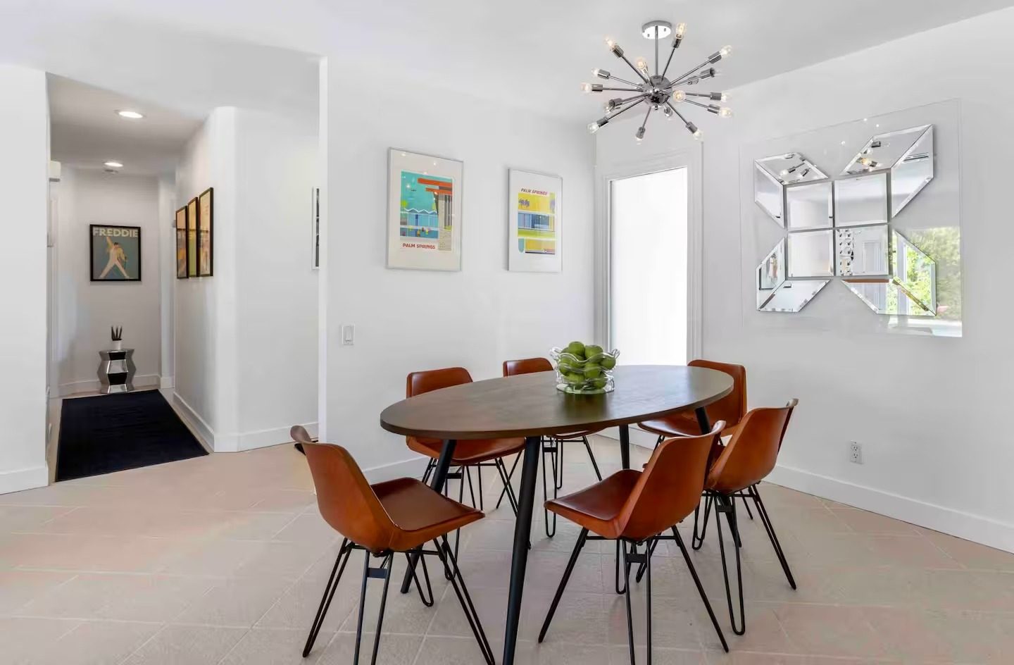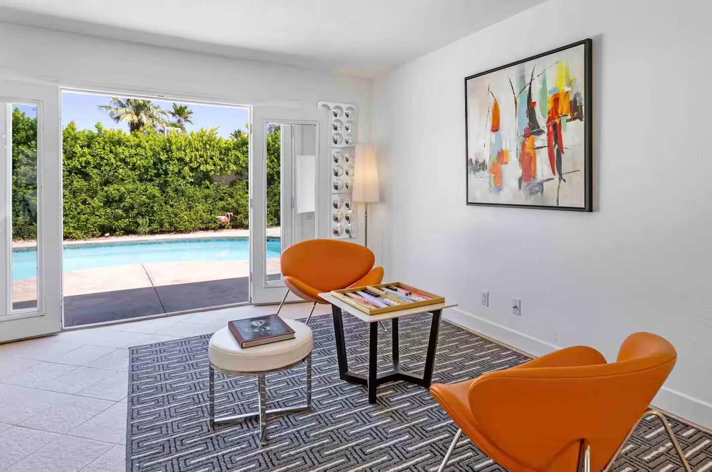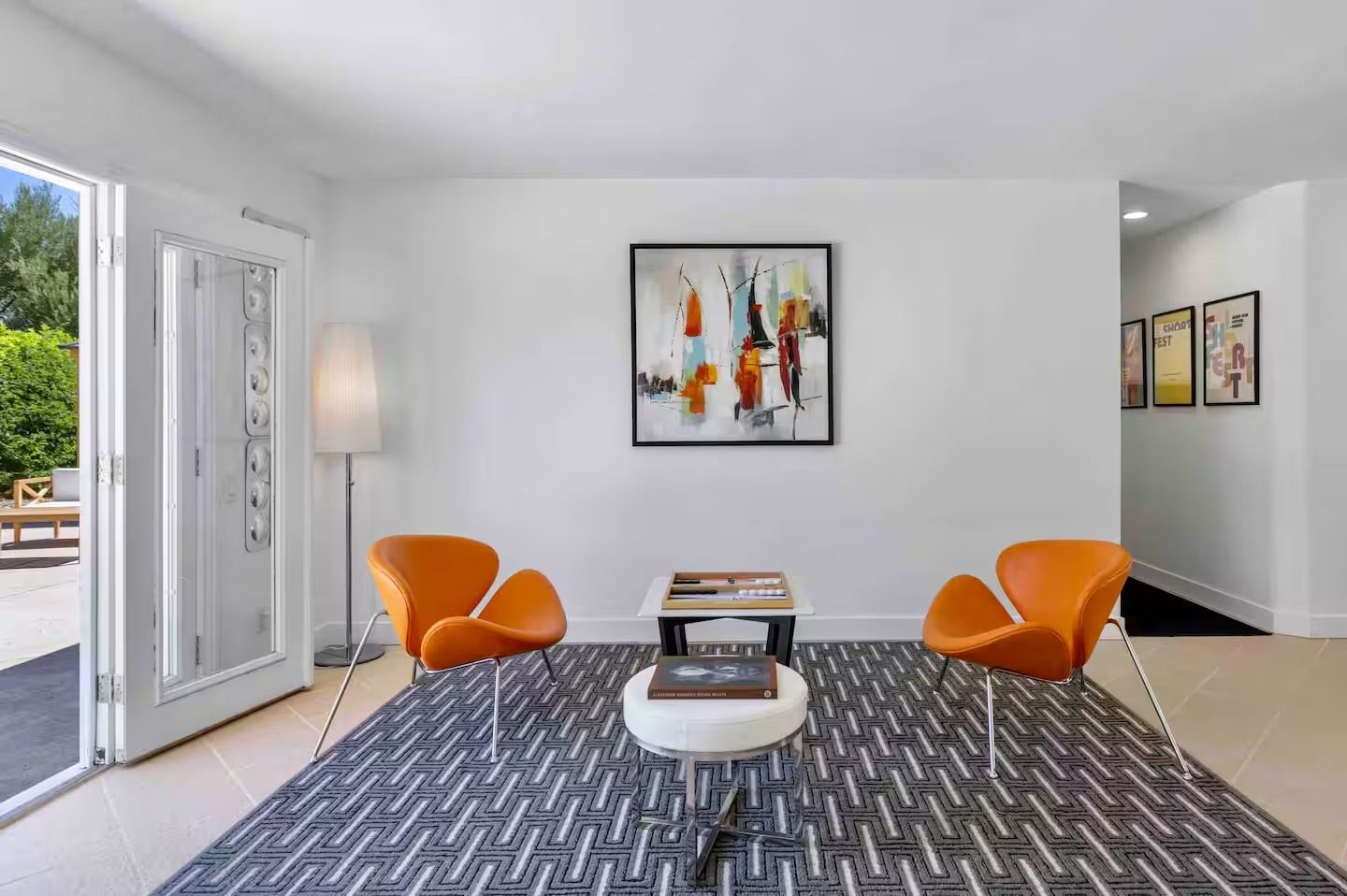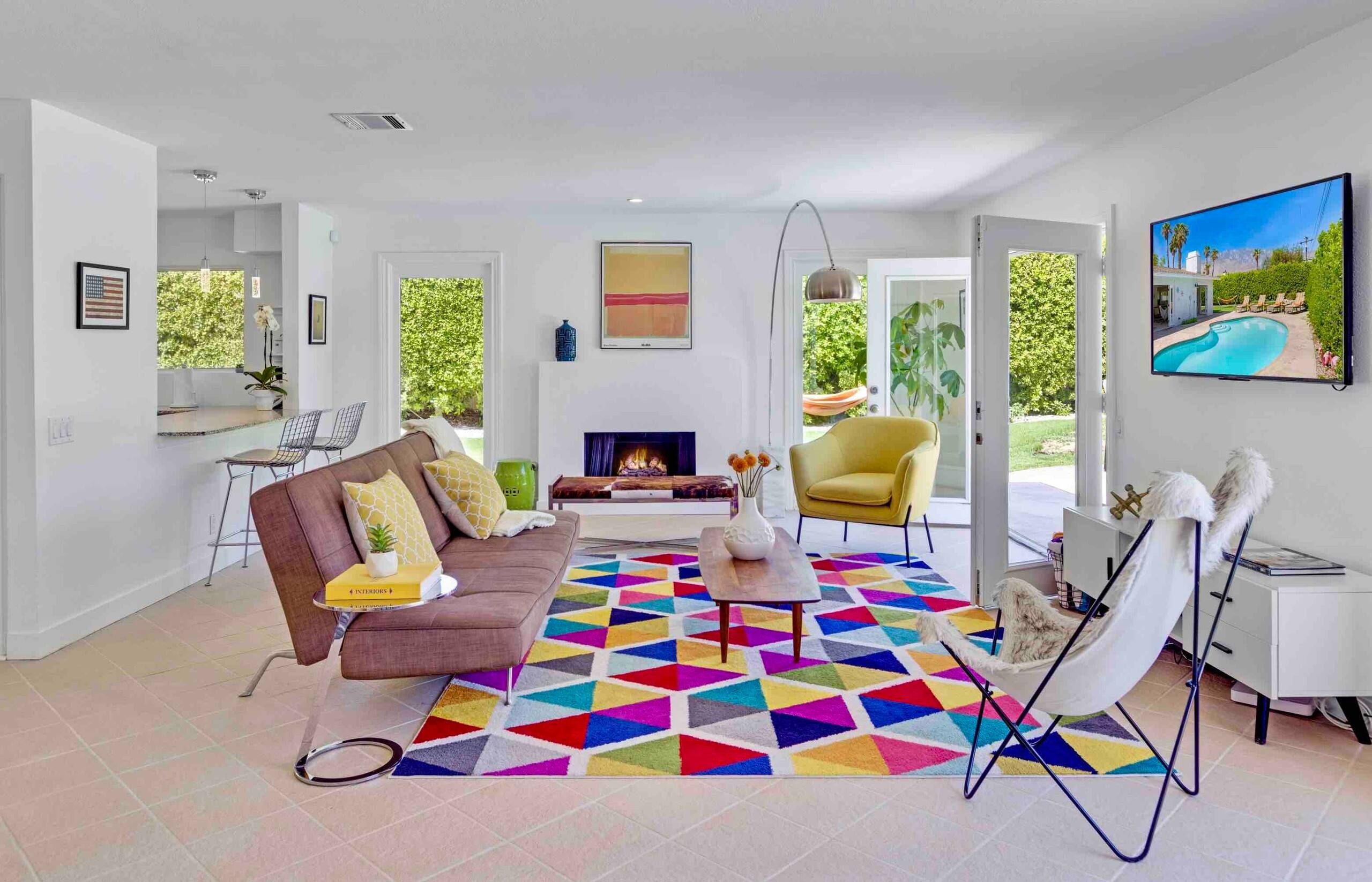 Step into a bright, airy living area that flows seamlessly into a fully equipped kitchen. Bold desert-inspired colors, mid-century touches, and boho-chic accents create a warm, joyful atmosphere that feels instantly relaxing.