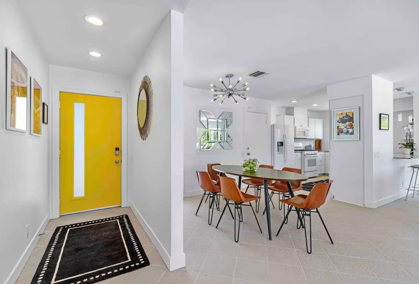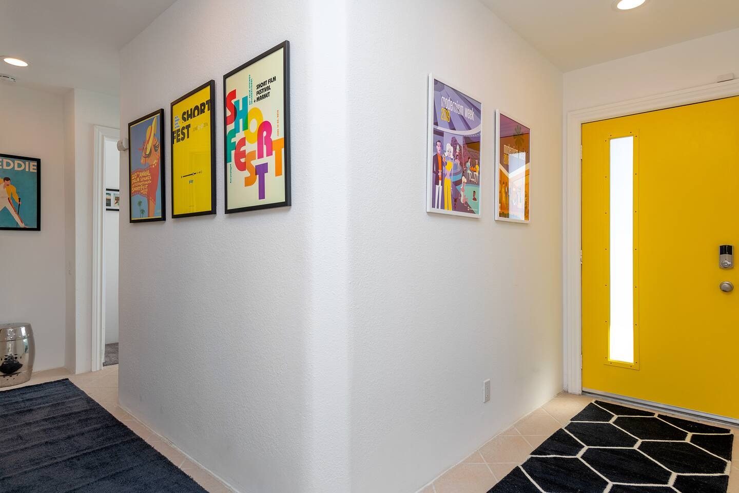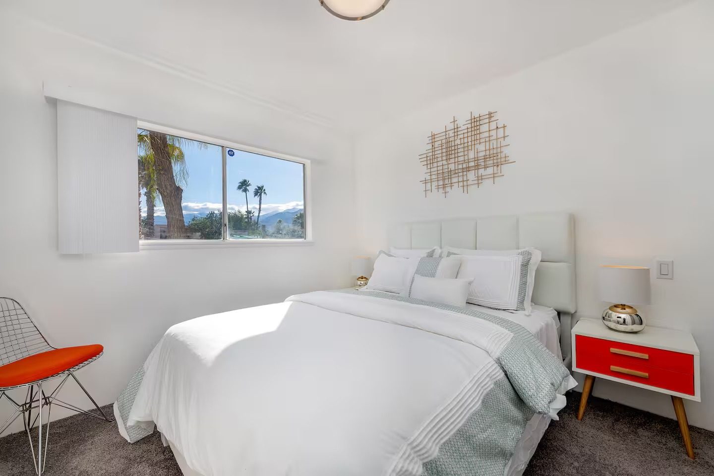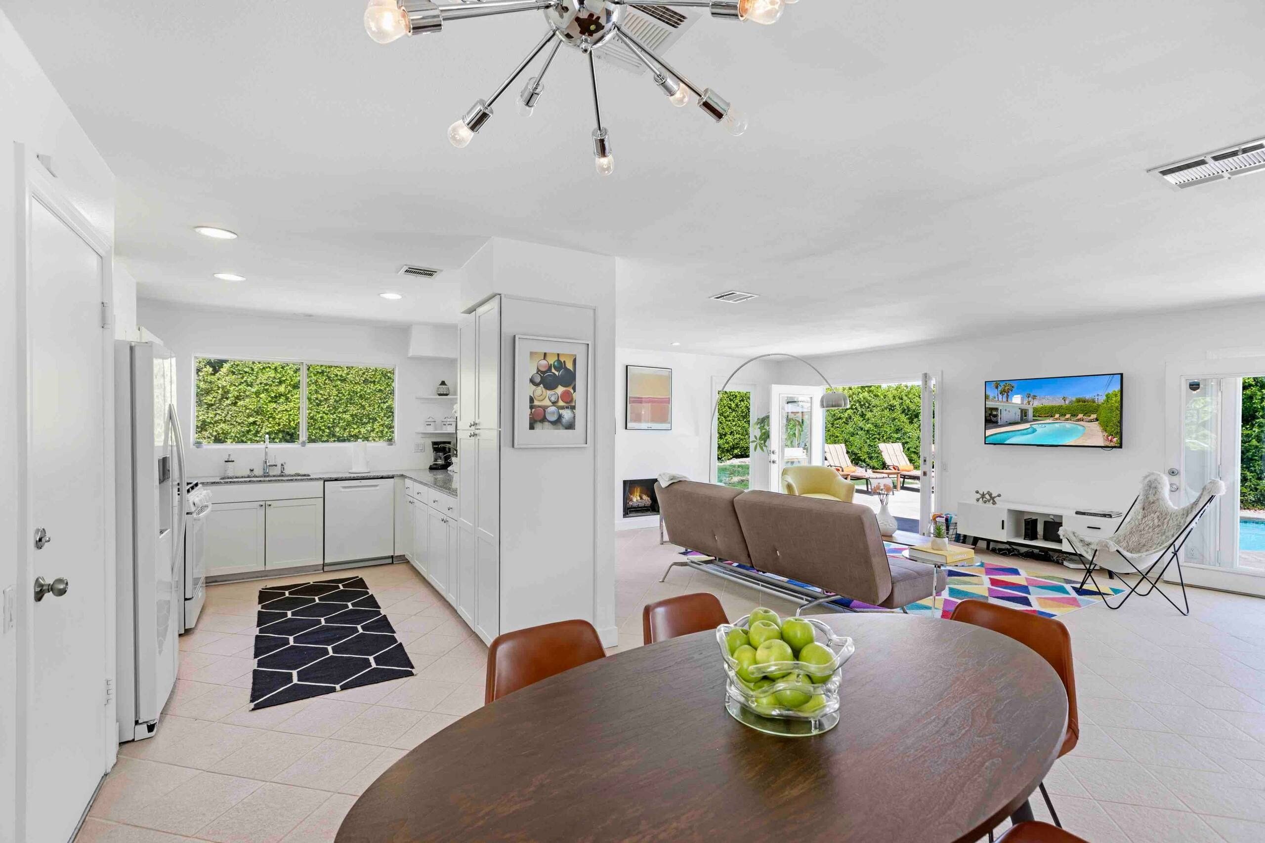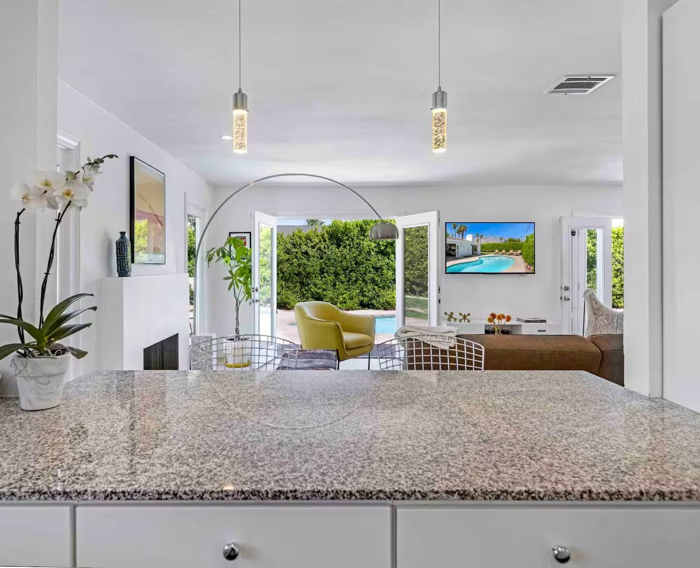 Step into a bright, airy living area that flows seamlessly into a fully equipped kitchen. Bold desert-inspired colors, mid-century touches, and boho-chic accents create a warm, joyful atmosphere that feels instantly relaxing.