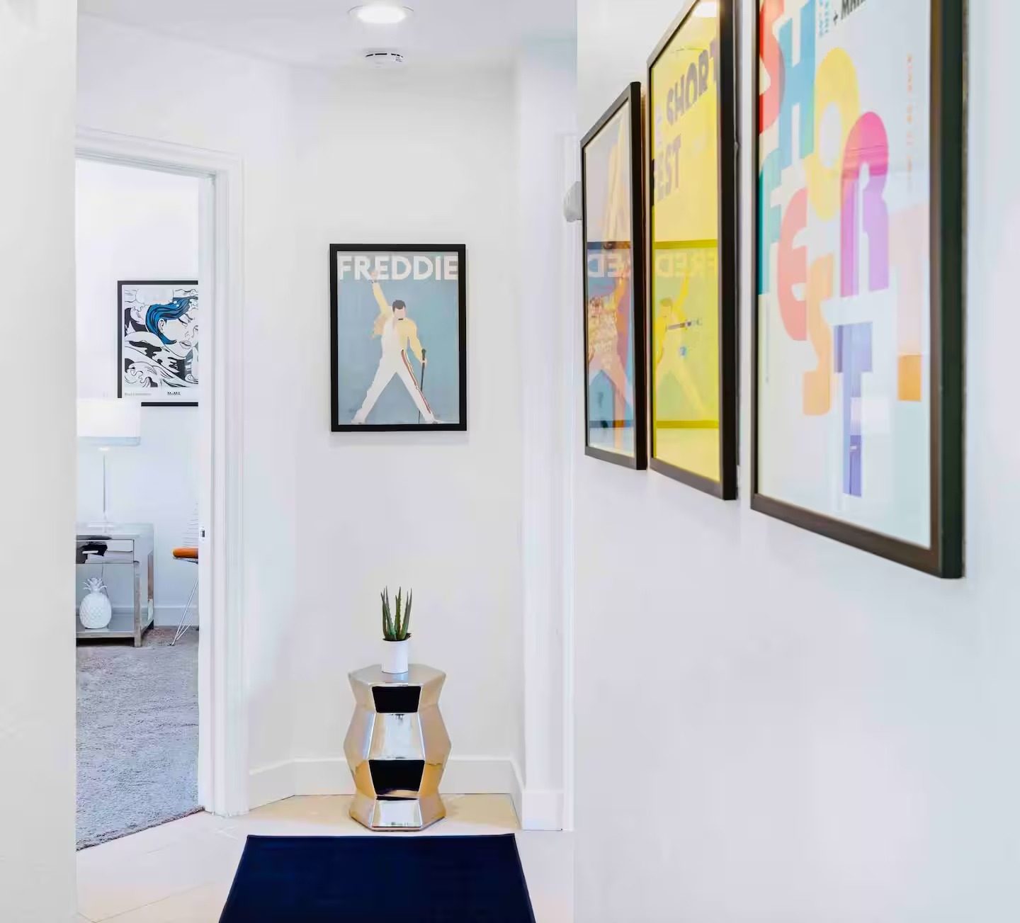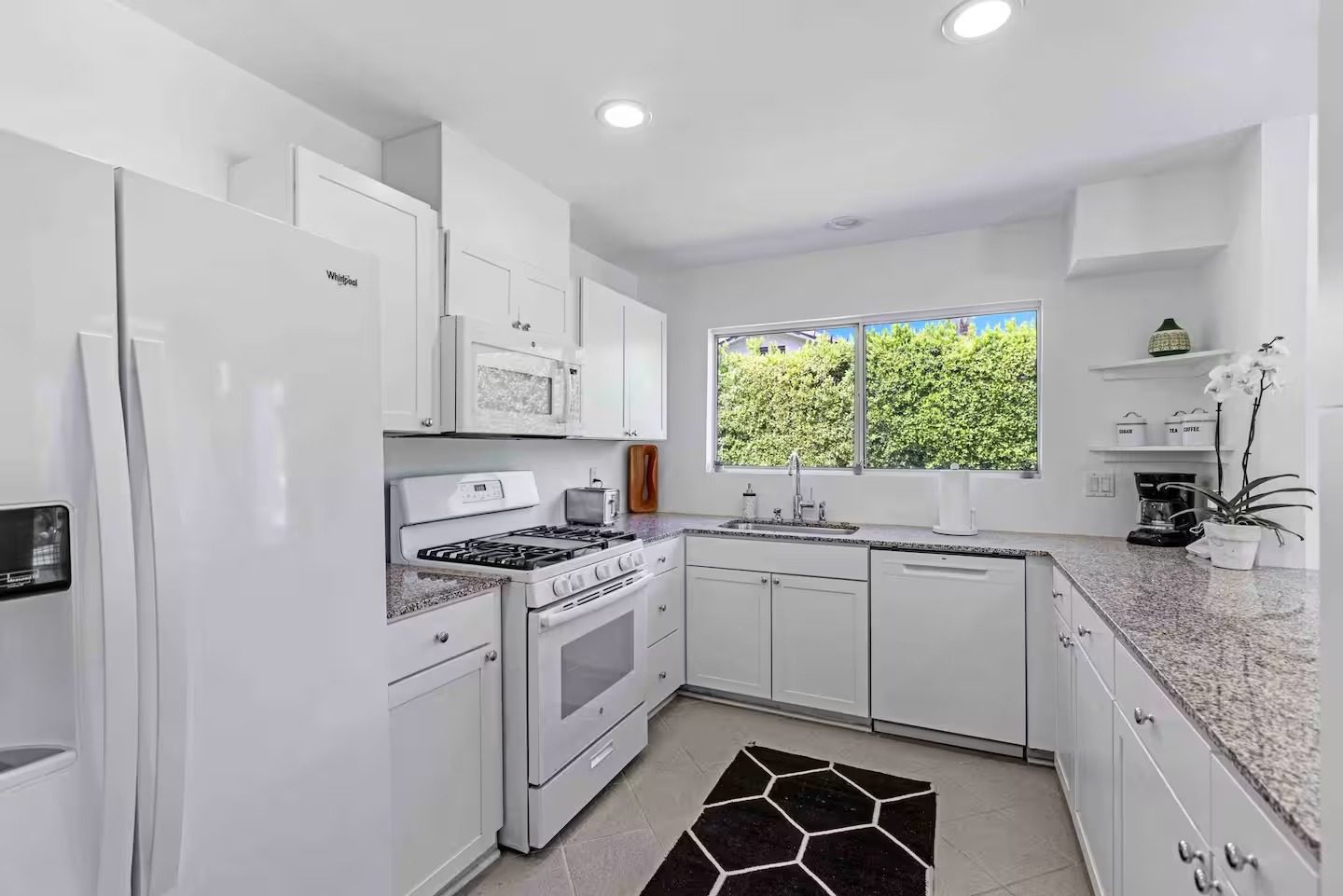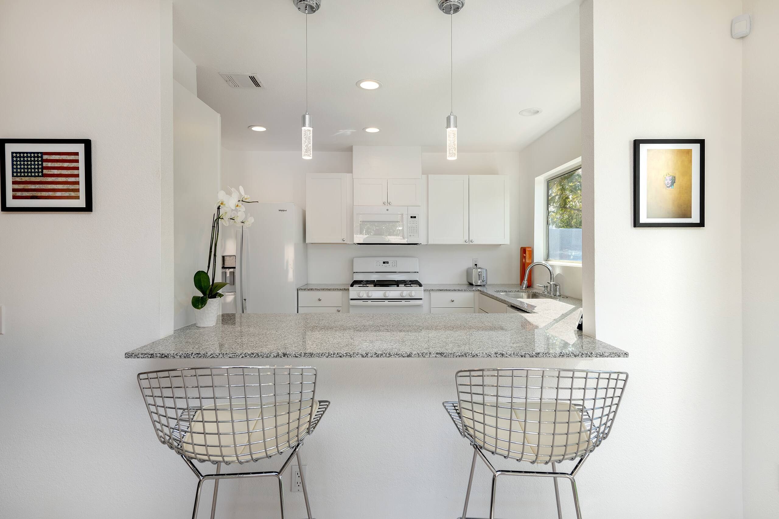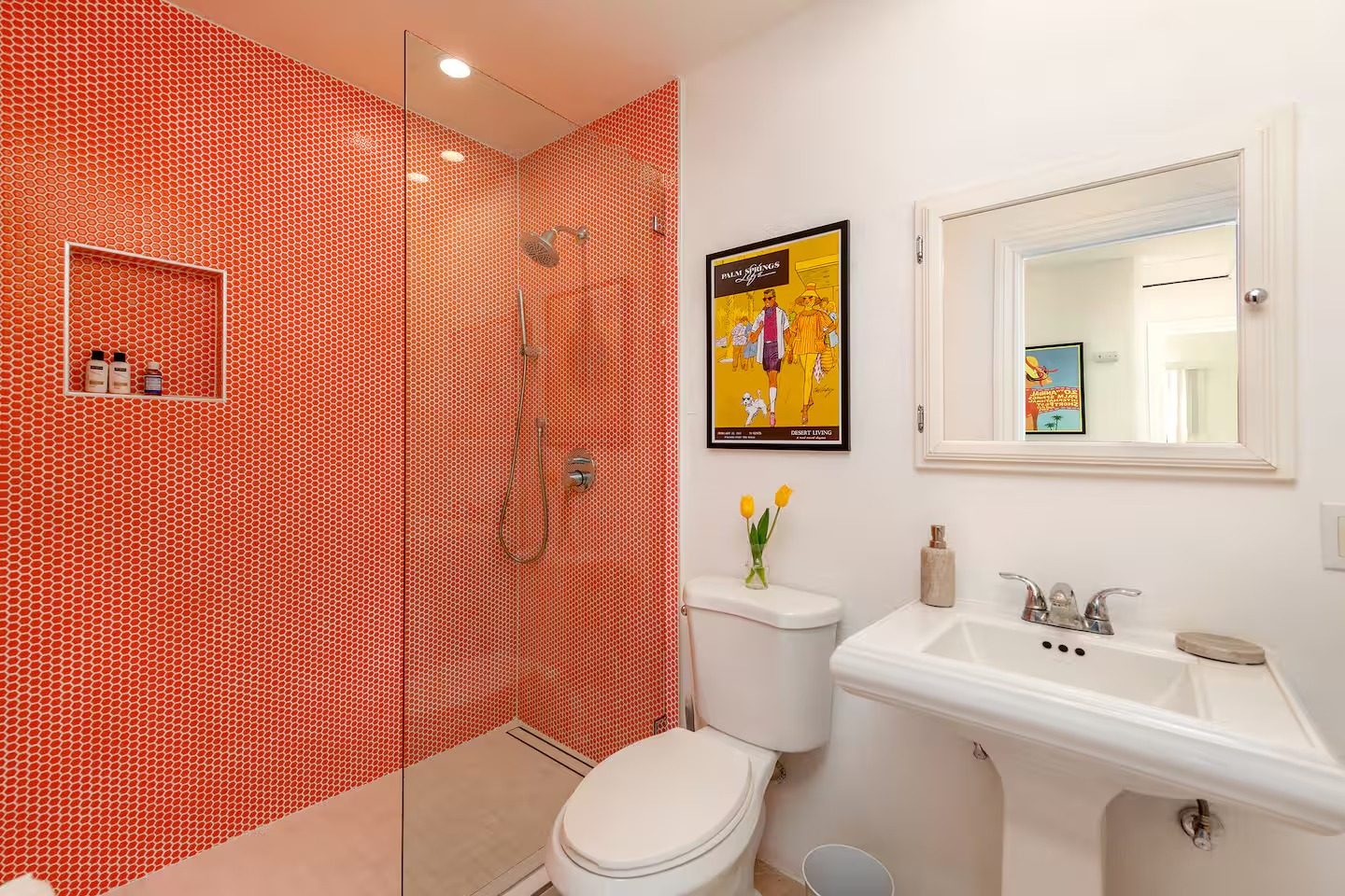 Step into a bright, airy living area that flows seamlessly into a fully equipped kitchen. Bold desert-inspired colors, mid-century touches, and boho-chic accents create a warm, joyful atmosphere that feels instantly relaxing.