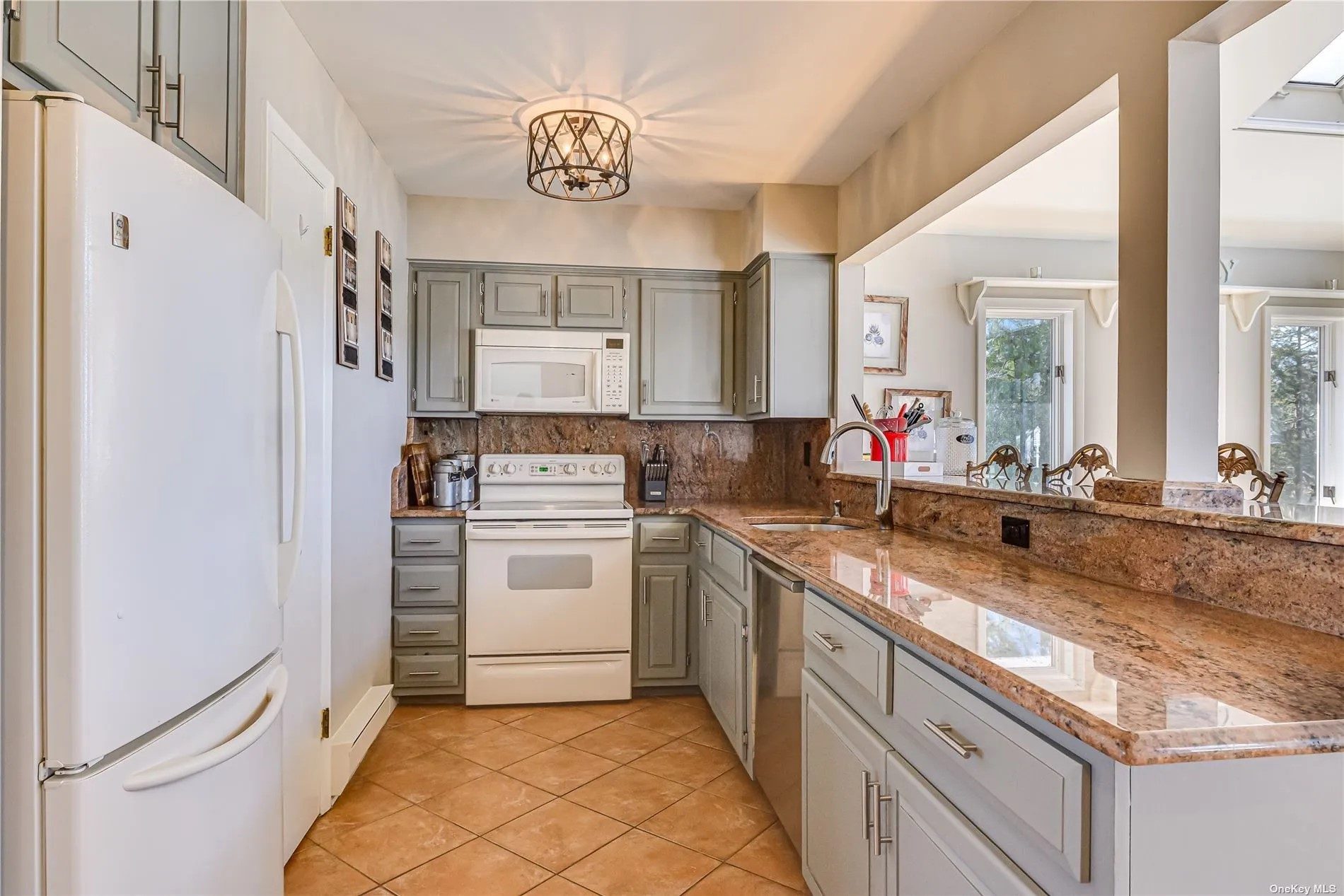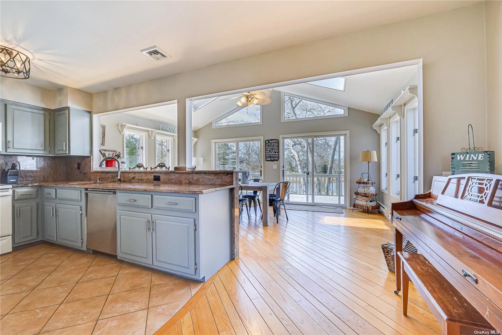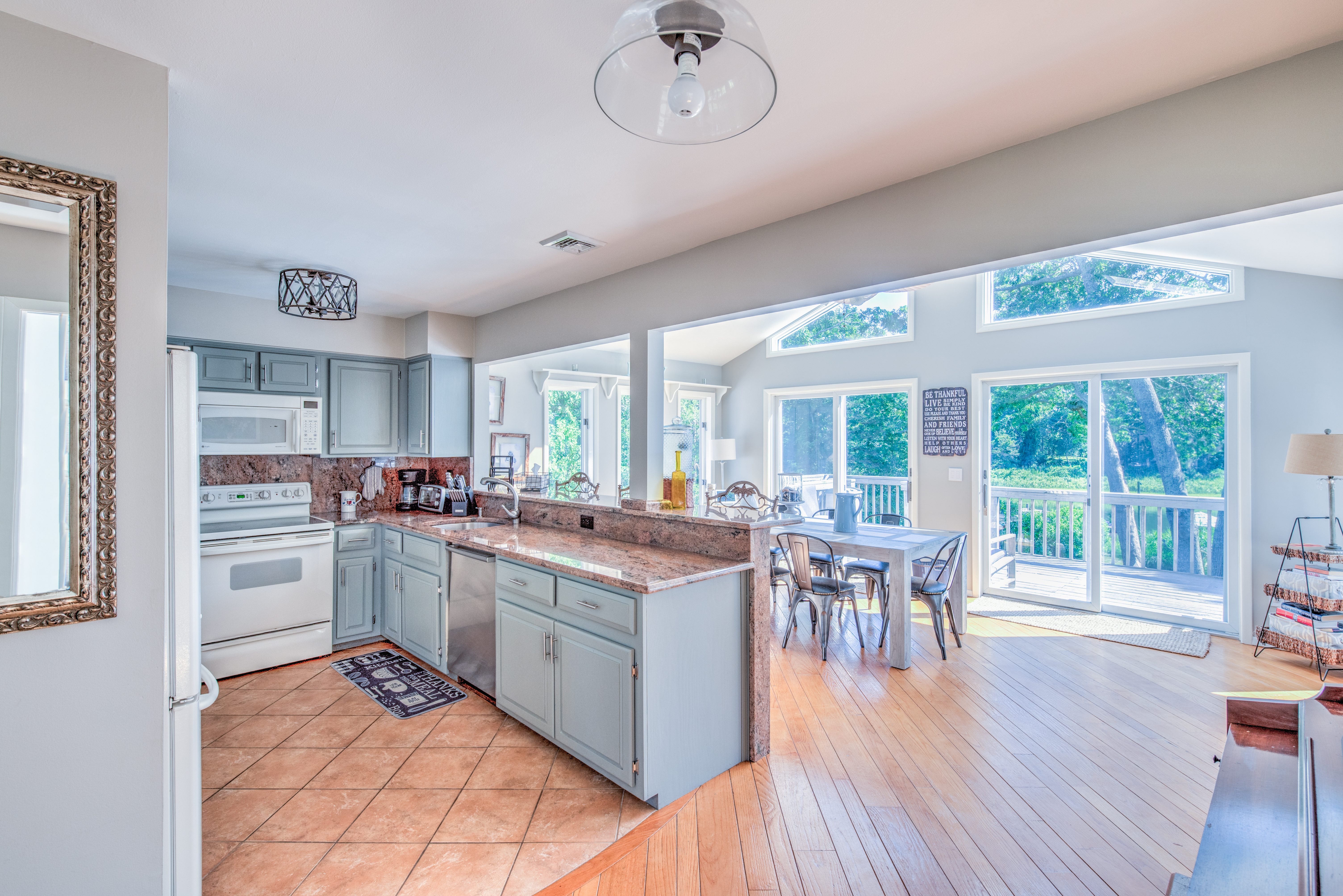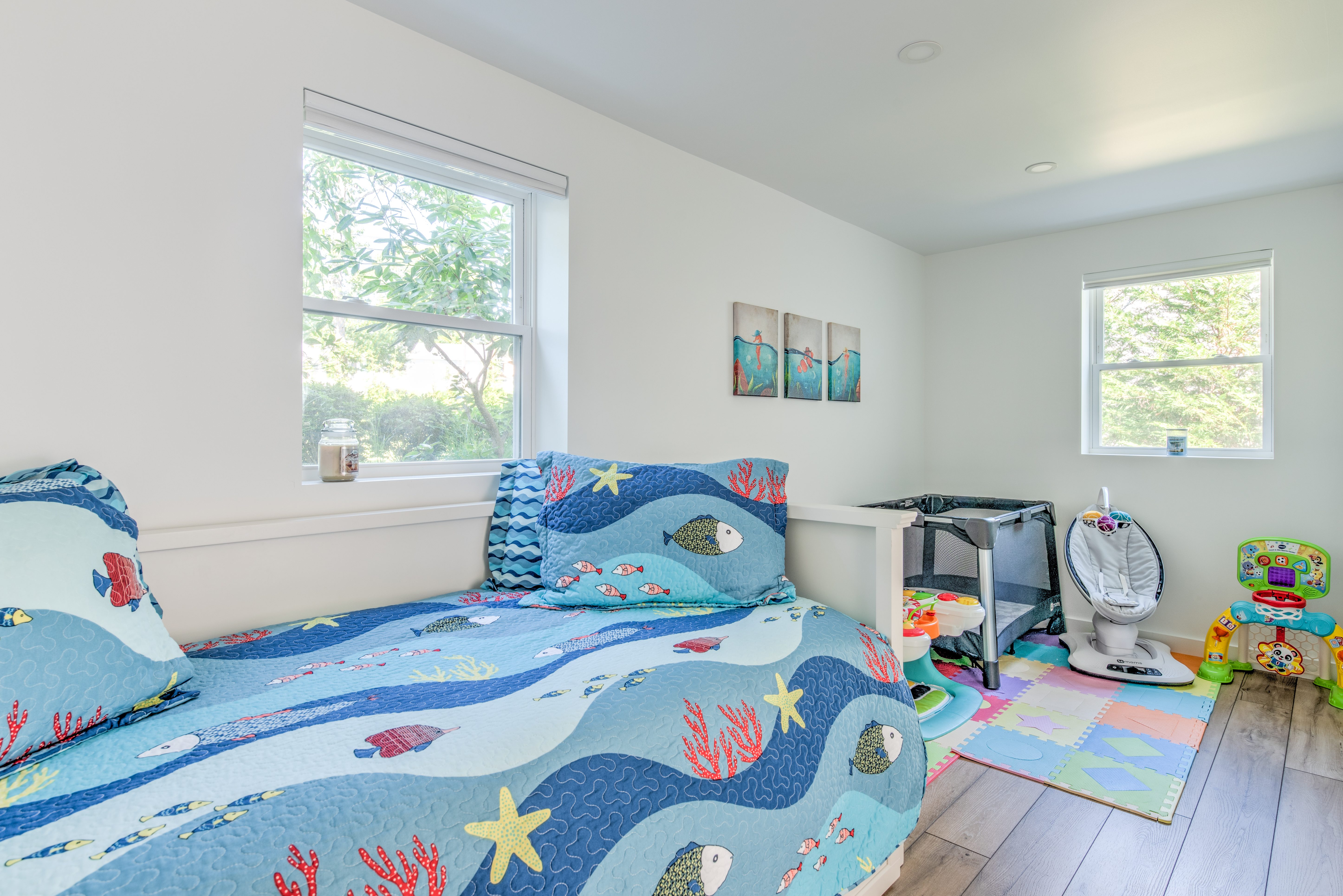 The kitchen is a chef’s delight with beautiful gray cabinets, a refrigerator, an electric stovetop, an oven, a dishwasher, and a microwave. The dining area accommodates eight people, making it ideal for family meals and gatherings.