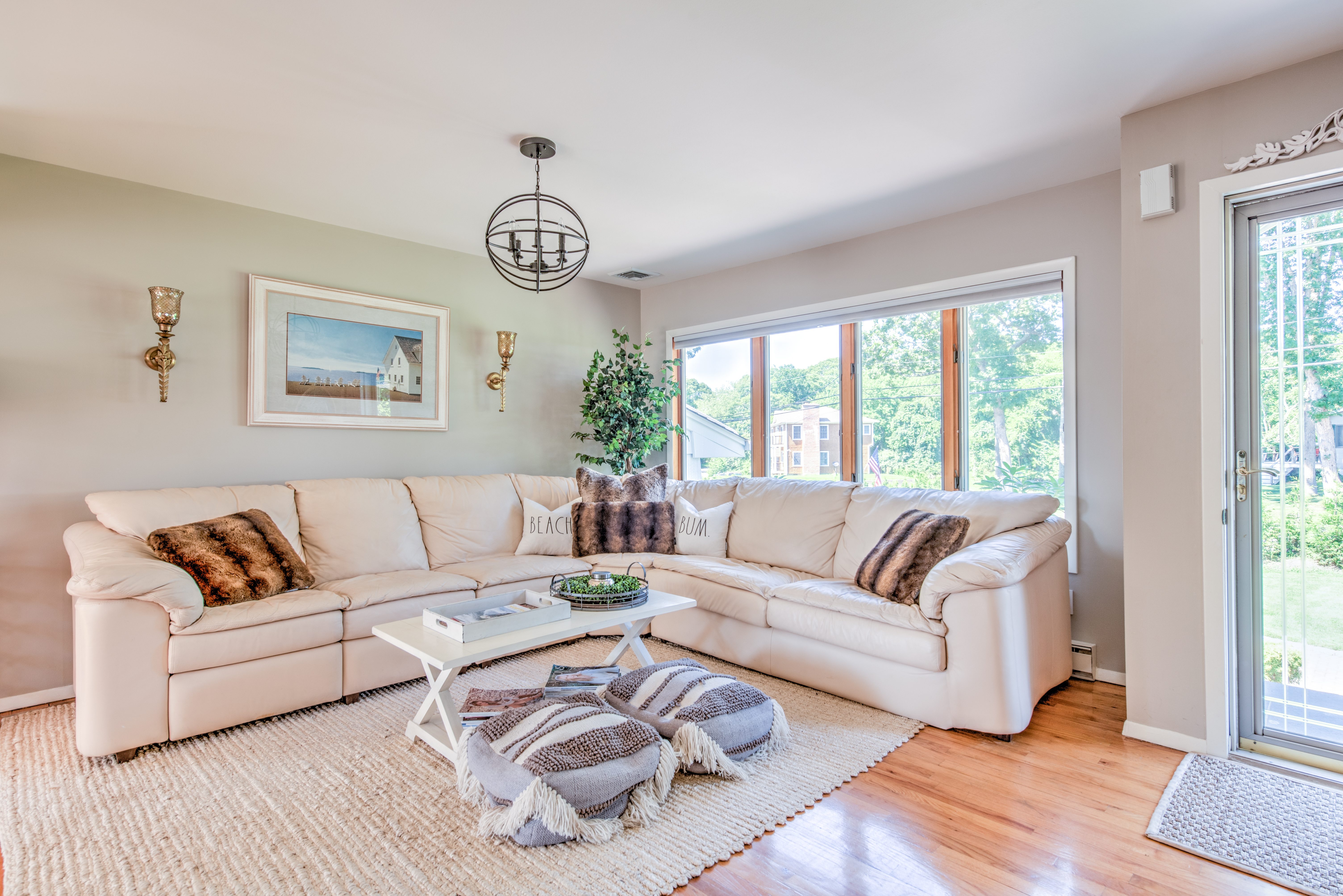 The first area features a creamy corner seat, a white coffee table, and a beautiful white drawer cabinet in a country style. Big windows offer a garden view, bringing the outdoors in.