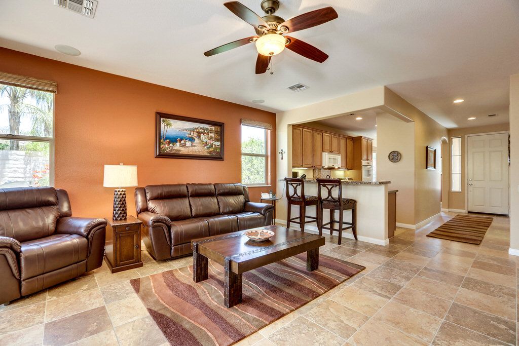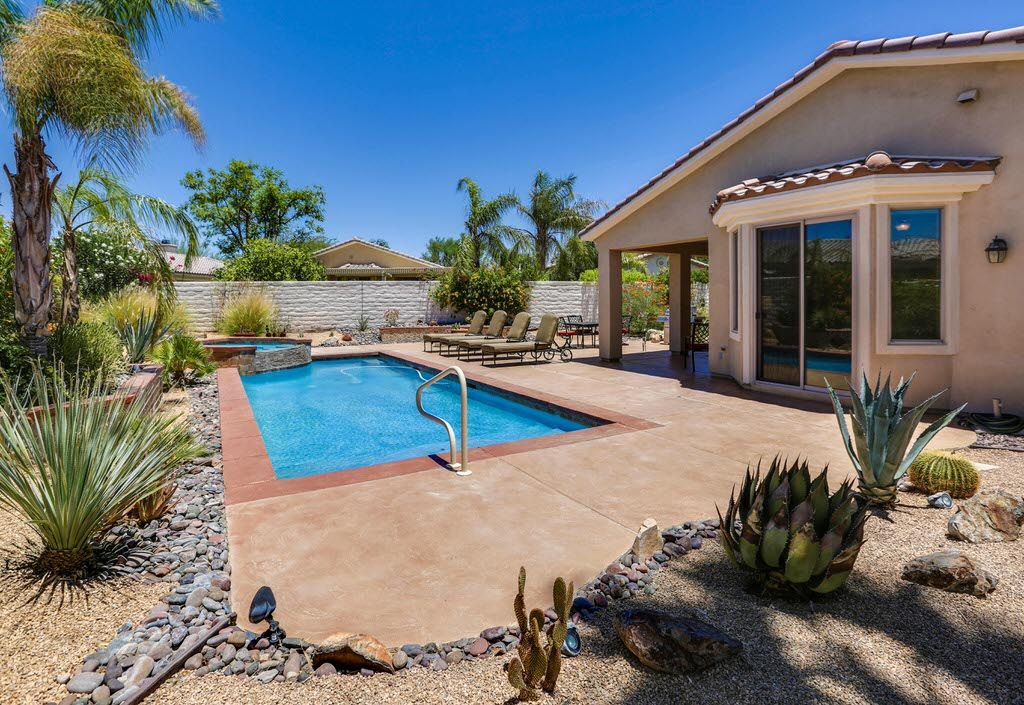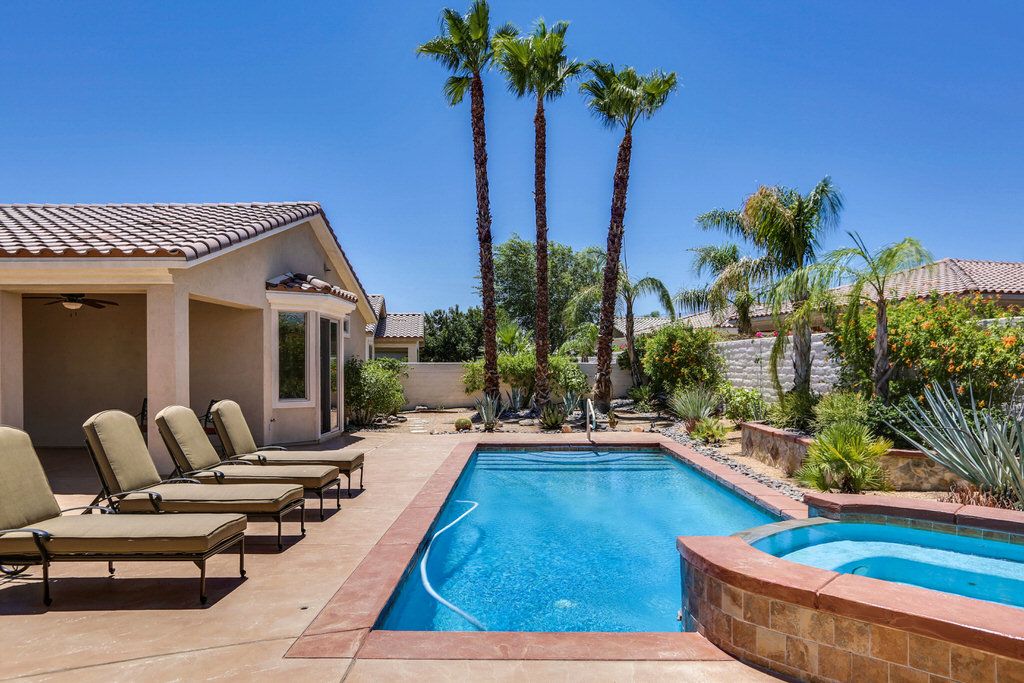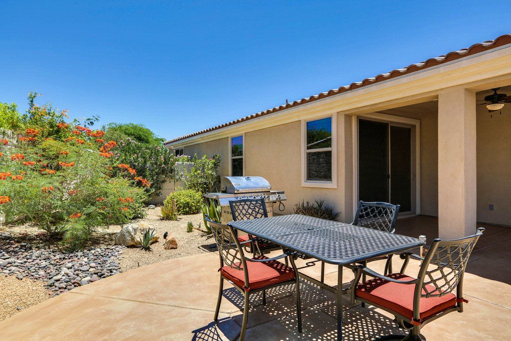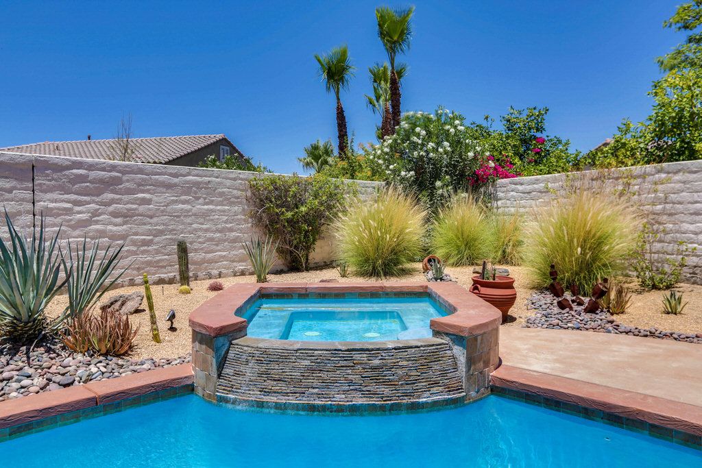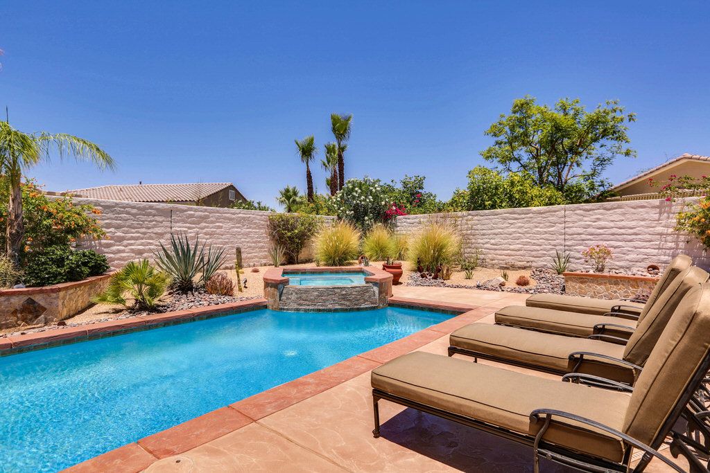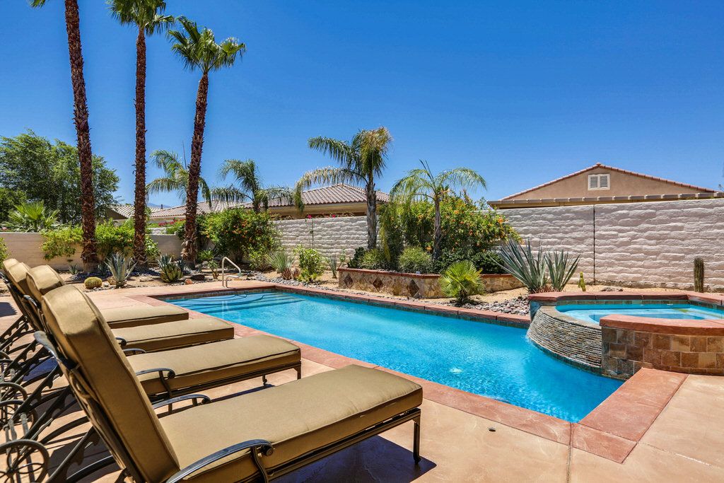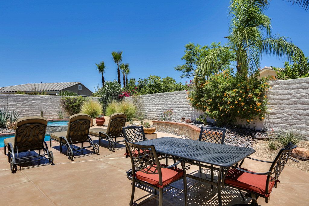 This 3-bedroom vacation home in Sun City Shadow Hills has its own impressive amenities. The backyard features a sparkling pool with a soothing cascading waterfall spa. Laying poolside is the perfect place to relax and enjoy the reliable Palm Springs sunshine. The backyard was made for entertaining friends and family, with dining for 6 and a BBQ grill.