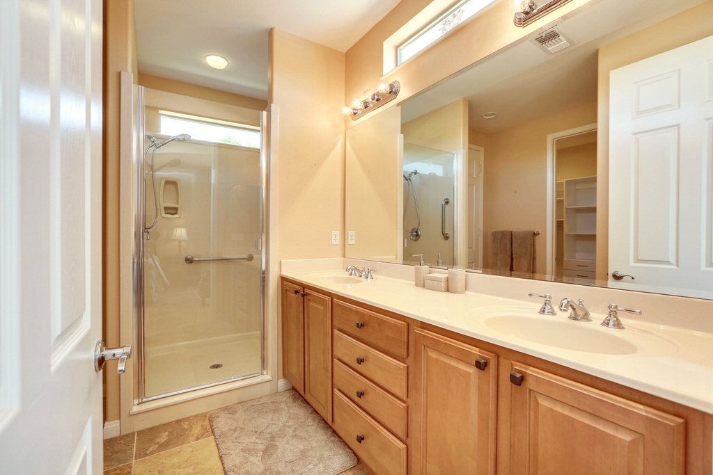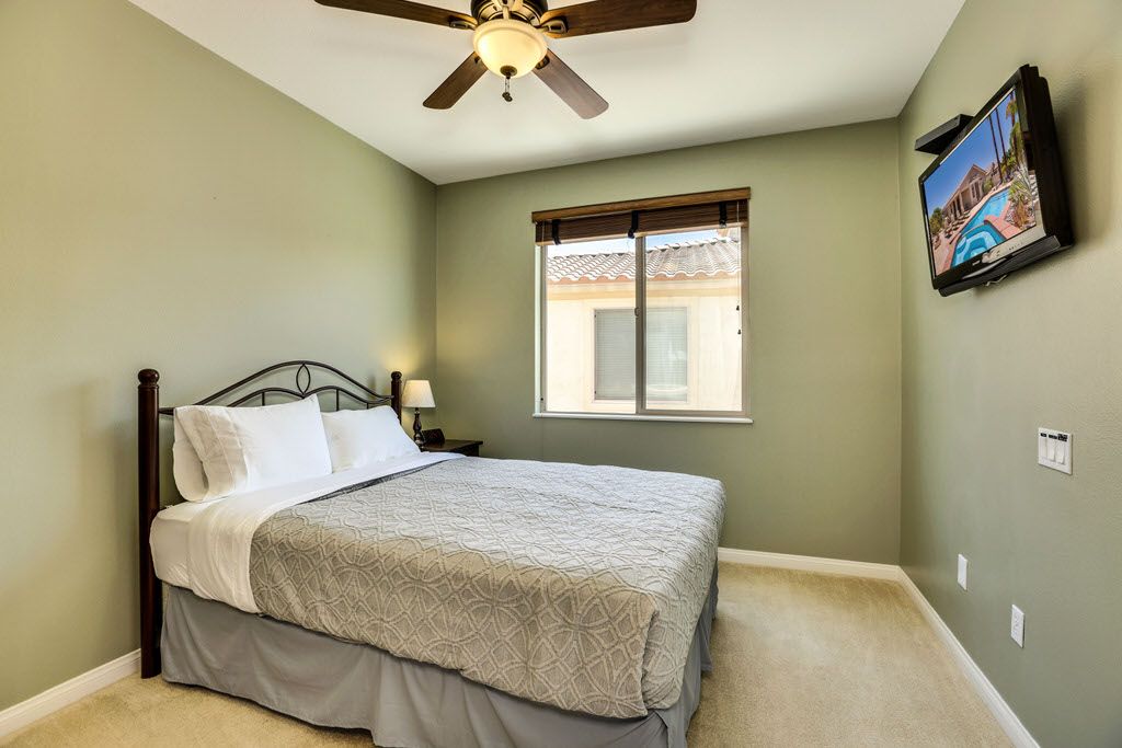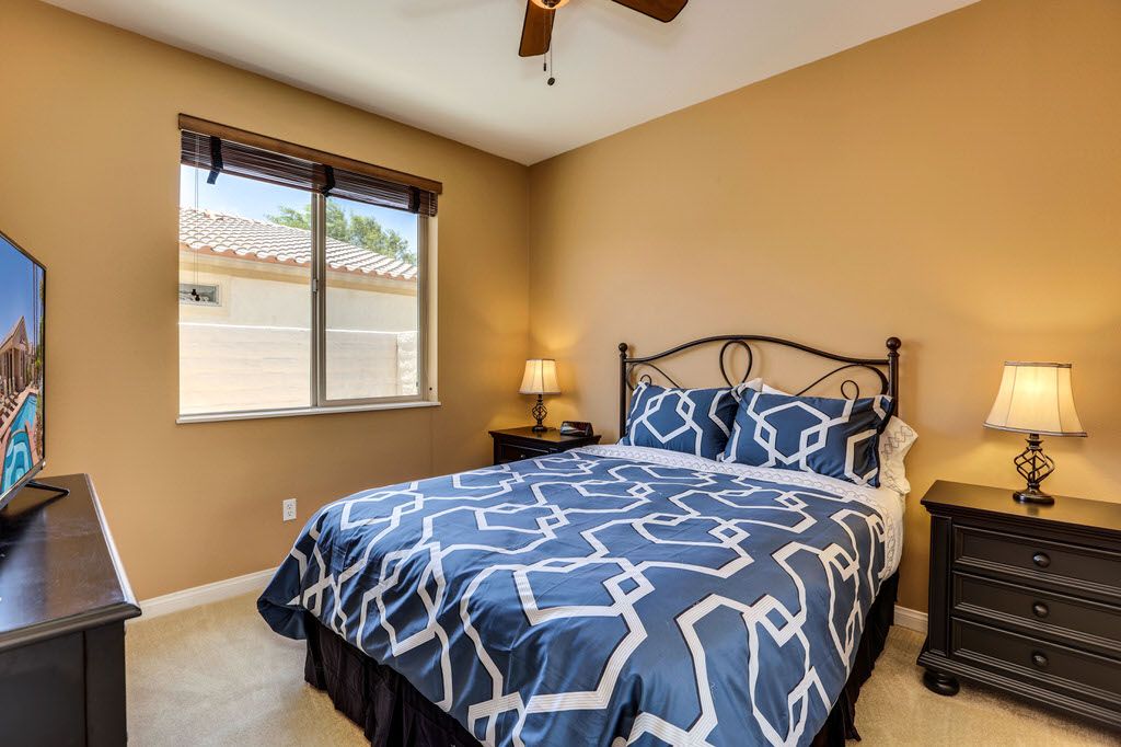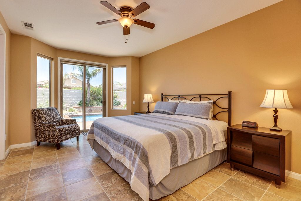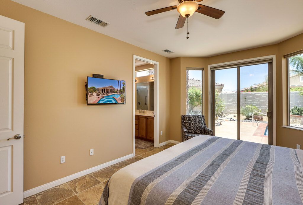 The master suite features a king size bed, a 40 inch HDTV, ceiling fan, a slider to the backyard, dual vanities, an over-sized shower, linen and custom built-out closet.
