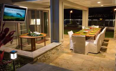 Spend time with your family and friends in the heated pool, twelve-person jetted spa or on the custom IPE deck while taking in the picturesque views of the open skies, ocean, and mountains. Dine al fresco or under the covered lanai areas surrounded by propane Tiki torches that create a warm and intimate atmosphere. Have a glass of wine and enjoy beautiful conversations under the moonlit night alongside the copper fire pit (gas) with lounge seating for 12. While inside the home, enjoy complete comfort with central air conditioning, 7 HDTVs (including an all-weather outdoor TV), high-speed WIFI, gate/property security intercom/cameras, and a beautiful wet bar. Every room in the house has beautiful ocean and mountain views and three of the rooms have private lanais!