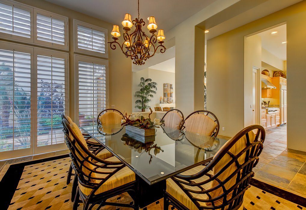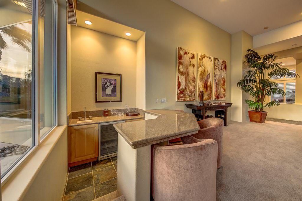 Inside you and your guests will continue to experience the gorgeous views through a wall of panoramic glass windows. The formal living room features a sliding door to the yard, a sofa, 4 chairs and a gas fireplace. The sunken wet bar looks out to the mountains and has a sink, wine fridge, and 3 barstools for entertaining.