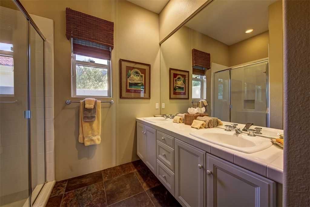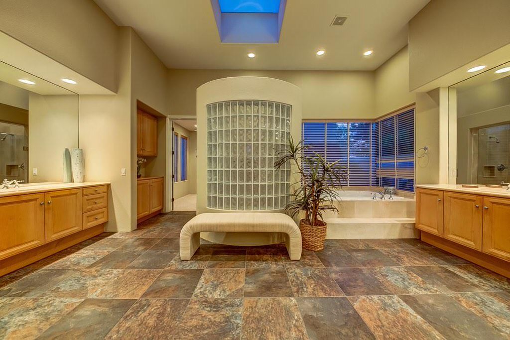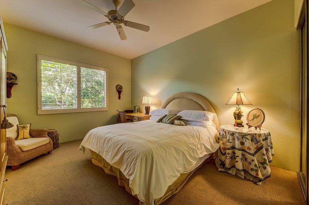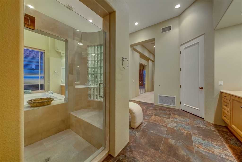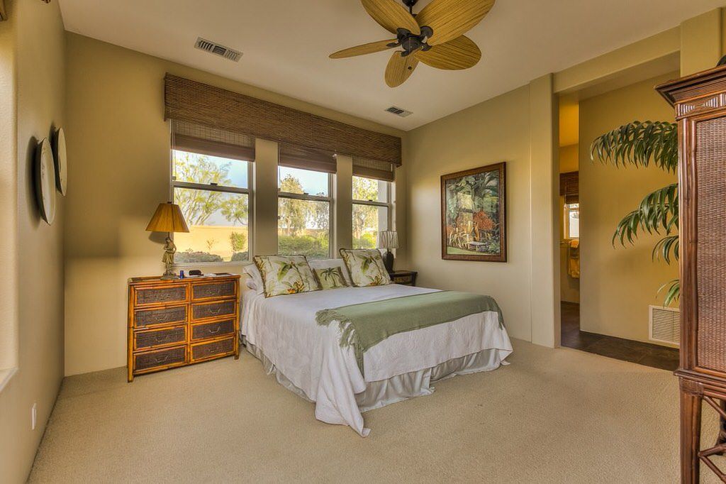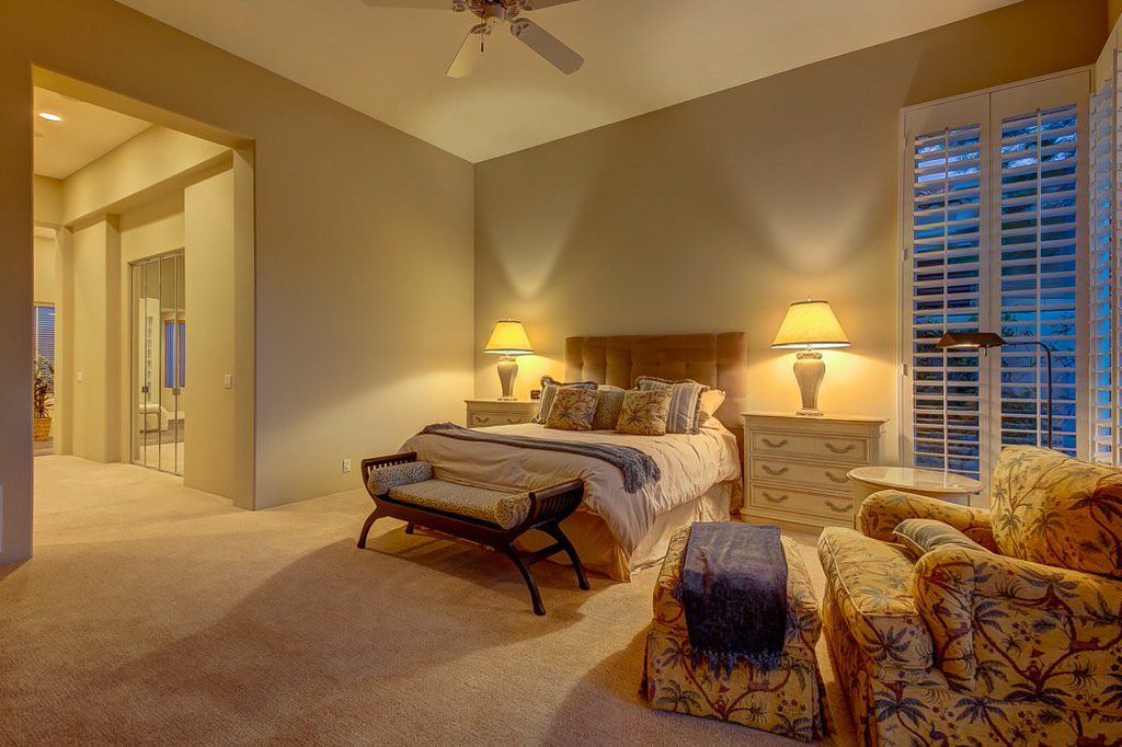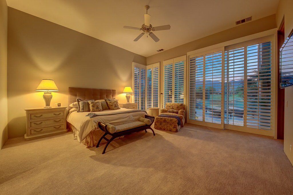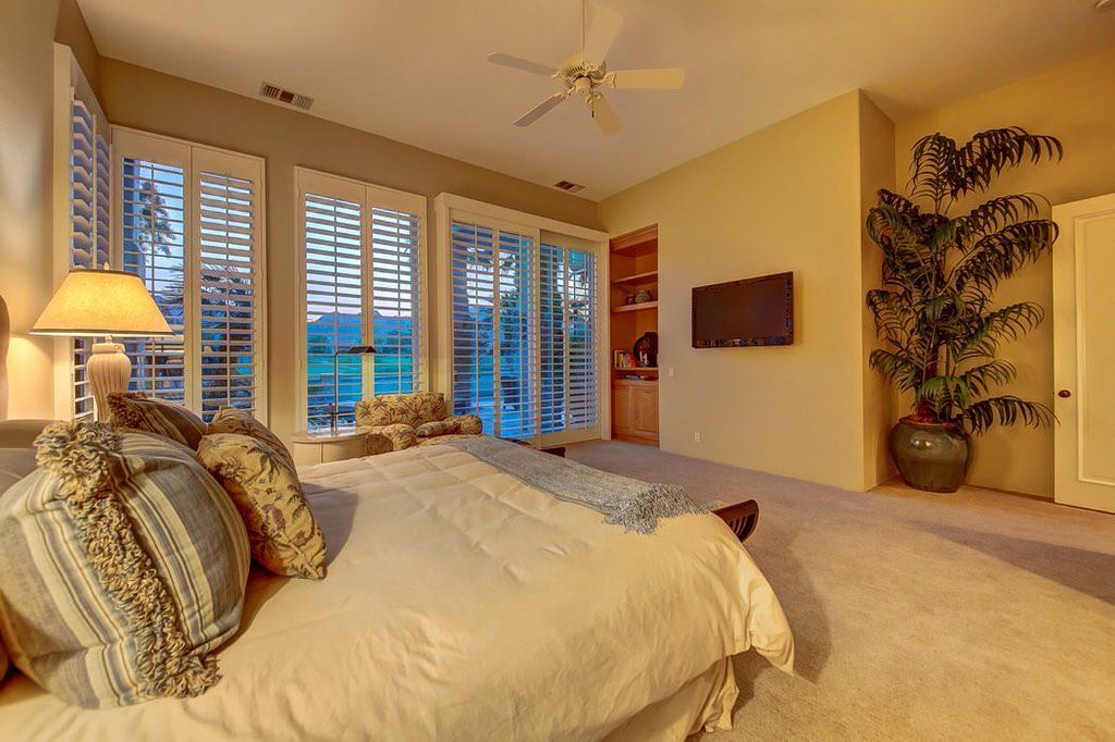 The Master Suite features a Cal King bed, HDTV, and sliding glass door that leads to the pool and spa with golf course and mountain views. The en-suite master bathroom has a large soaking tub, tiled shower, dual sinks, and his and her closets - one walk-in and two reach-ins for ample space to unpack and feel right at home.