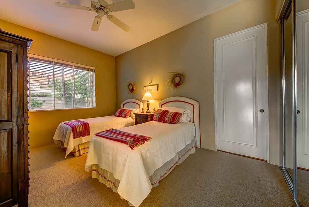 Suite 2 is the casita and located through the front courtyard with a private entrance. The casita bedroom features a Cal King bed, ceiling fan, and HDTV. The en-suite bathroom has dual sinks, a tiled shower, and a walk-in closet with microwave and mini fridge.
