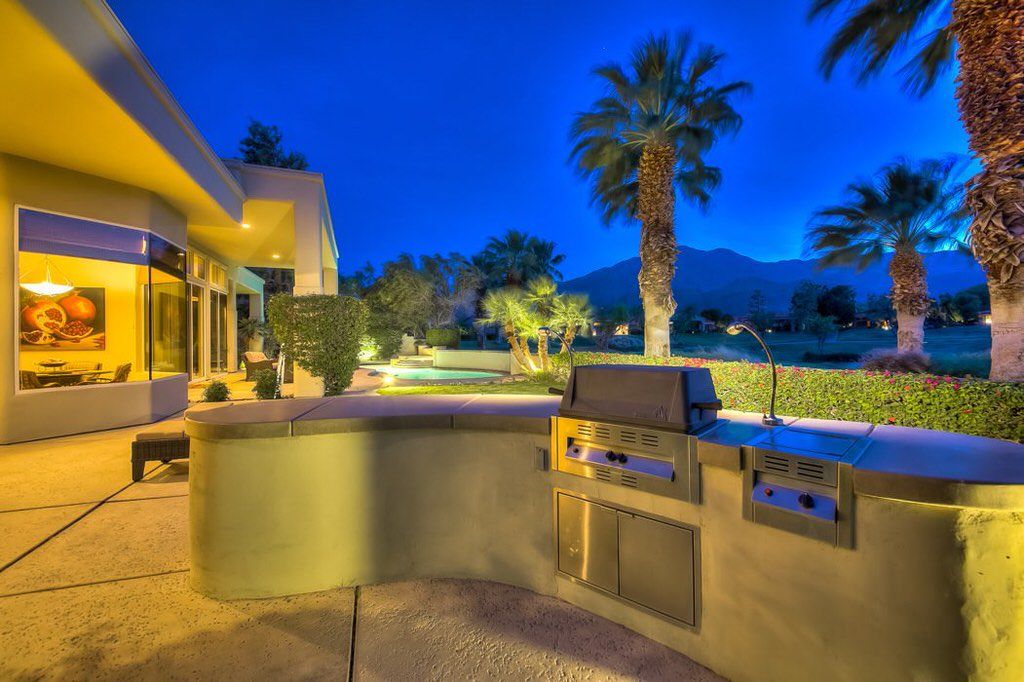 The elevated location offers both views & privacy from the golf course while you relax on 4 cushioned lounge chairs, a covered sitting area with sofa and two arm chairs with ottoman, and a built-in BBQ island with grill.