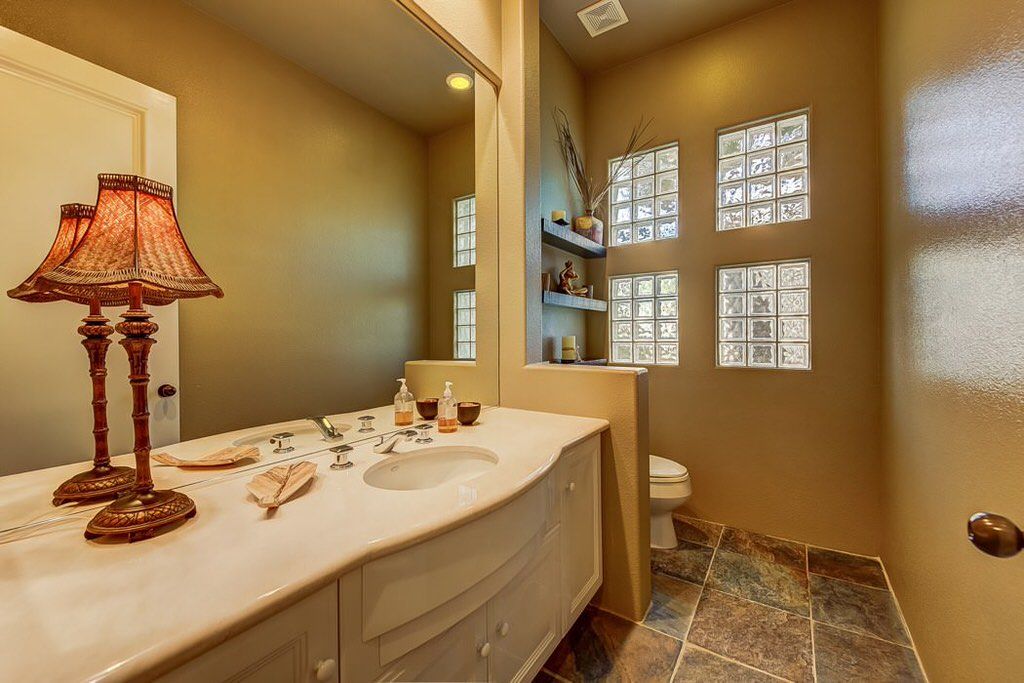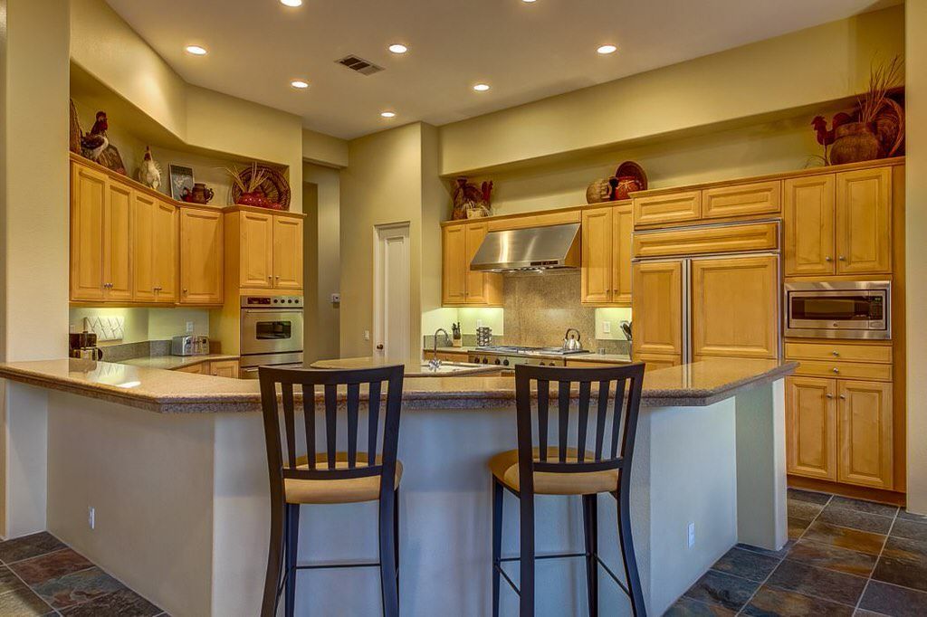 The family room is open to the kitchen and has a sofa, 3 chairs, gas fireplace, and HDTV. The fully equipped kitchen is at the center of the home with an over sized center island, granite counter tops and high end stainless steel appliances that include; a 6 burner gas cook-top with griddle, double ovens, dishwasher and pantry. The kitchen bar has seating for 2, and the breakfast nook has seating for 4. In the formal dining room you'll find additional seating for 6 on a glass table top.