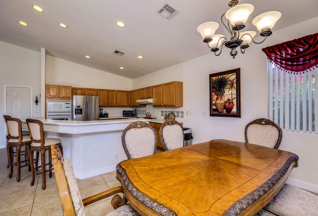 Amenities of this open-floor plan vacation home feature a large kitchen, well-appointed with everything you will need to cook a gourmet meal with friends and family. You'll appreciate the versatile seating arrangements, either at the kitchen bar, formal dining table, or outside at the poolside table.