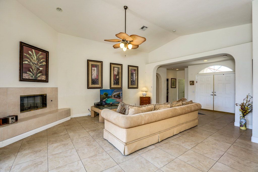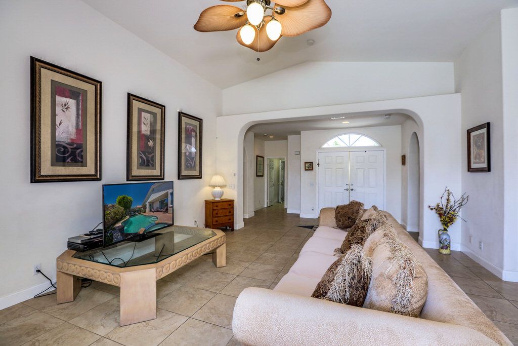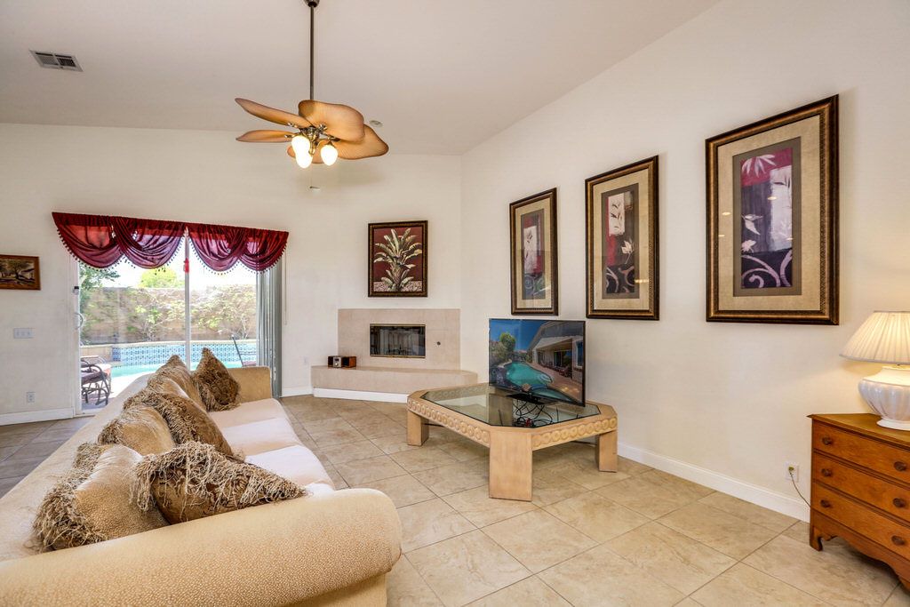The open plan gathering room of this spacious home centers around a large 55"" LED flat screen TV with Rocu. Comfortable seating and soaring ceilings give the living area an open, airy feel and a wall of sliding doors in the living room open directly to the patio and sparkling pool and spa beyond.