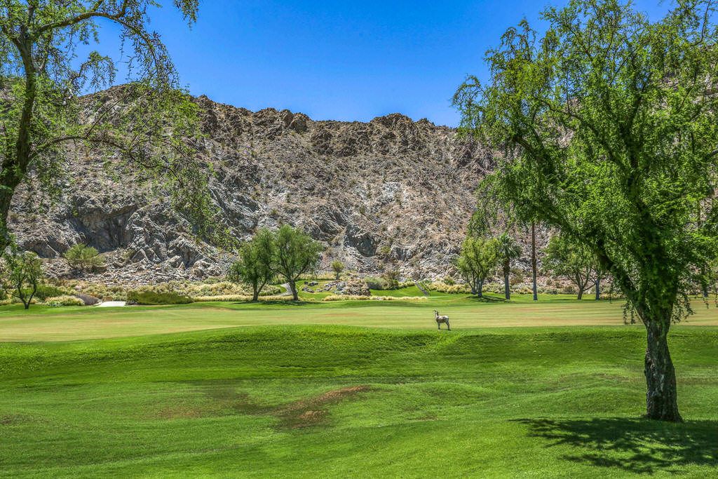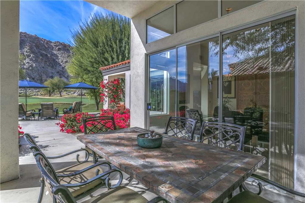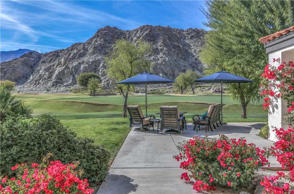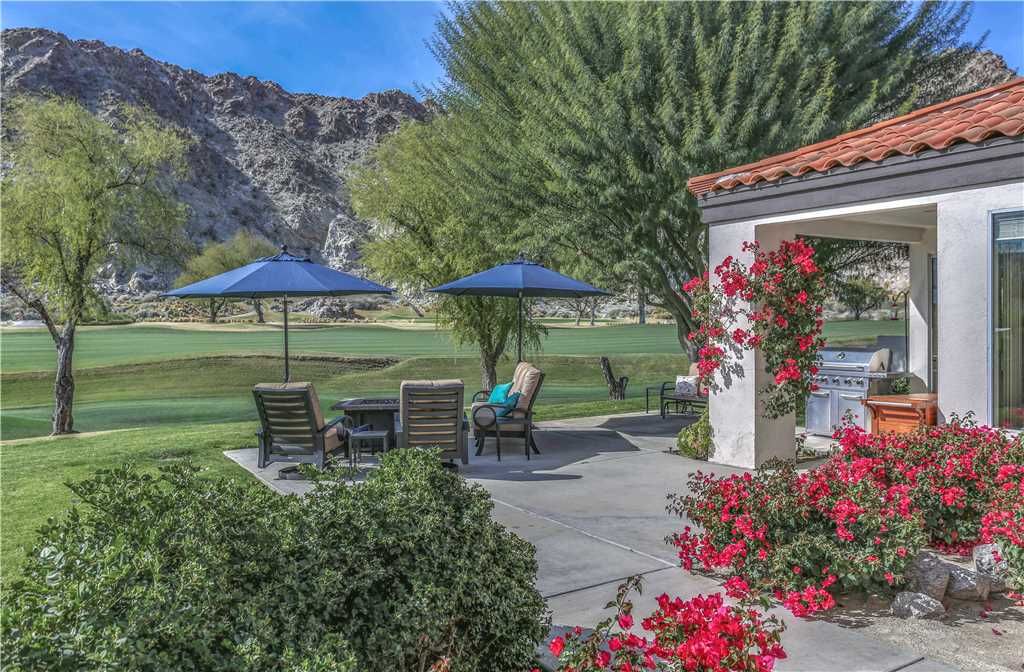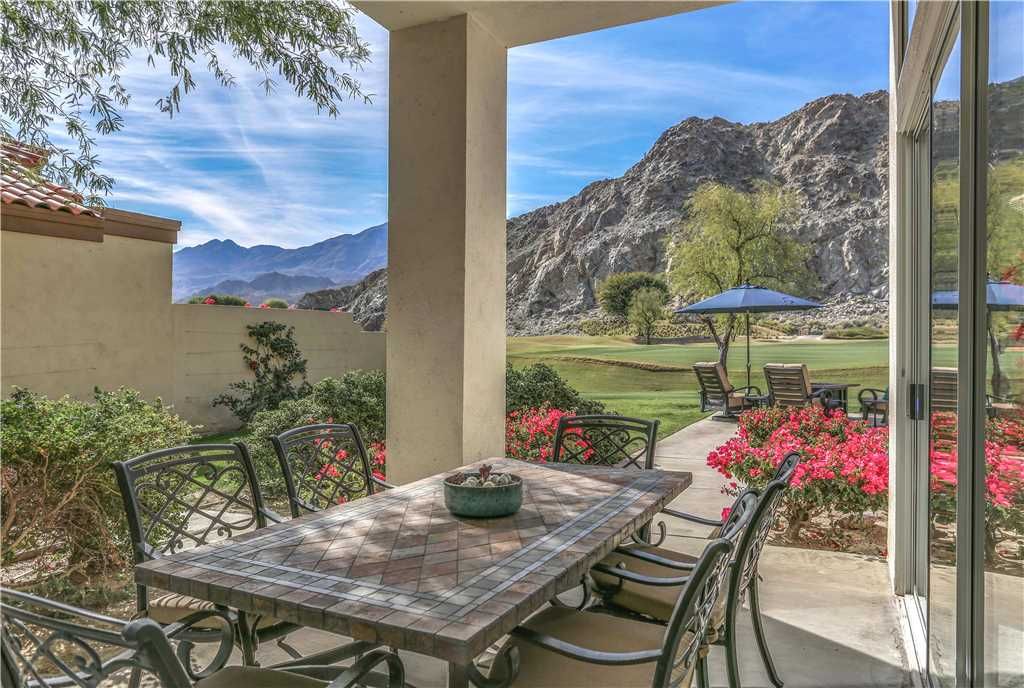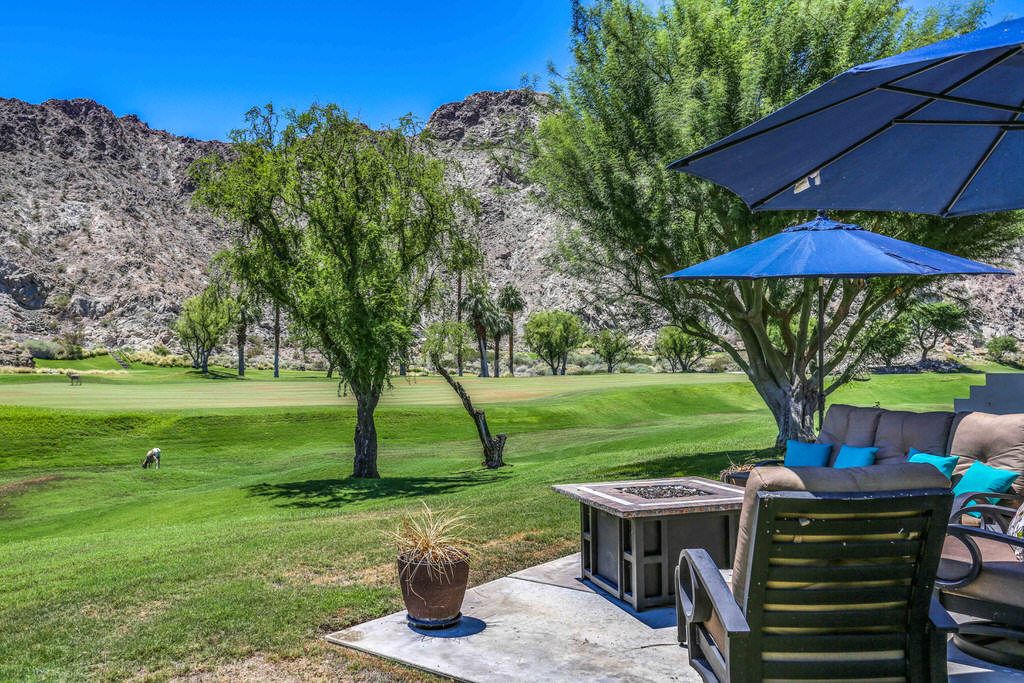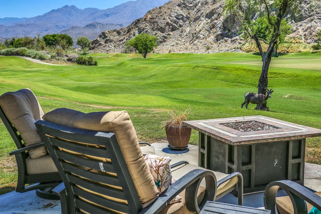 Step outside to 180 degree mountain and golf course views, a brand new top rated gas grill, outdoor covered dining for 6, gas fire pit with seating for 8, relaxing glider, teak party ice box and much more. All surrounded by stunning flowers, plants, lush fairways and maybe an occasional Big Horn sheep