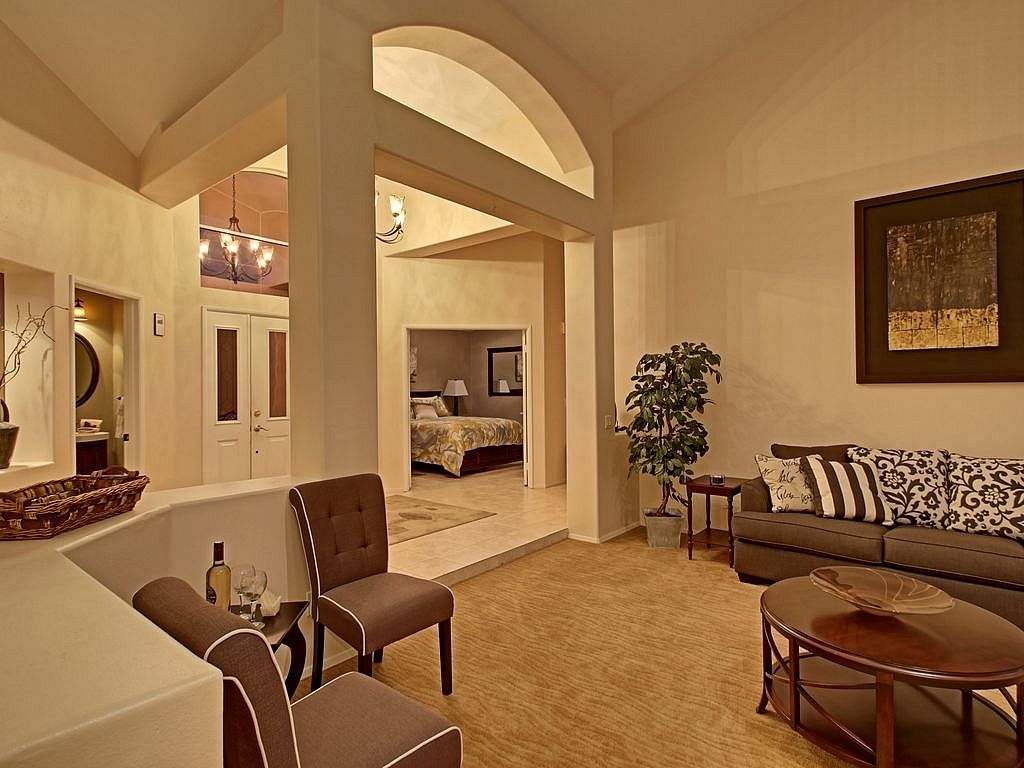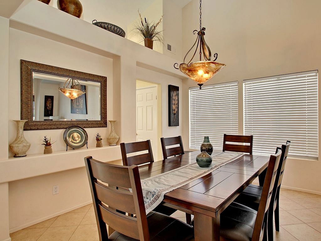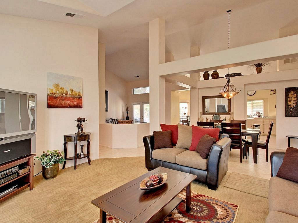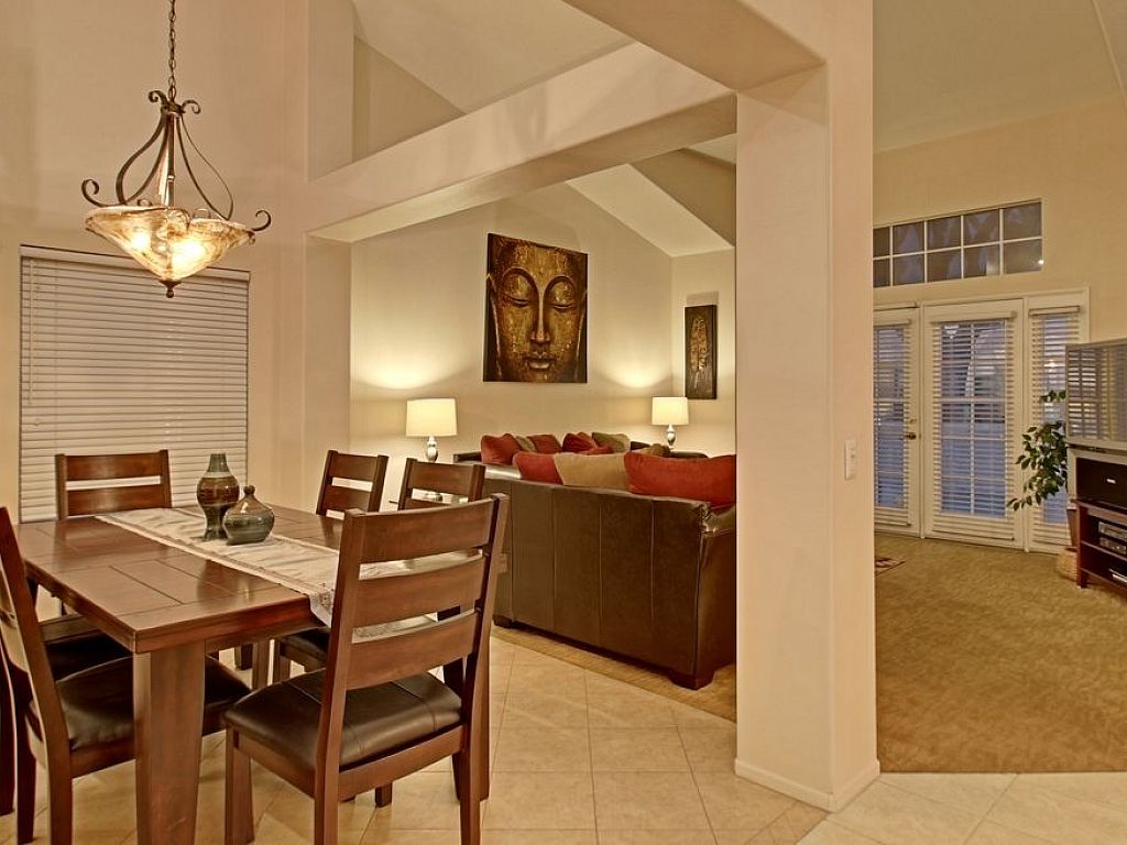 Open and inviting, this La Quinta home for rent is approximately 2,400 sq.ft. with 3 bedrooms and 2.5 bathrooms. The open floor plan and high ceilings greet you with inviting columns to separate the dining room, living room, and family room. The spacious living area has a fireplace, cathedral ceilings, comfortable couches for lounging, a 47 inch TV, dining table with 6 chairs and an additional eating area for four. There is also high-speed Internet with wireless Wi-Fi for your enjoyment.