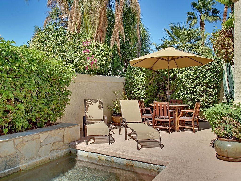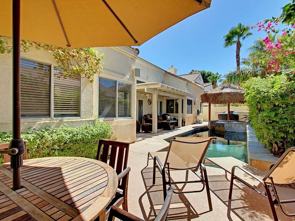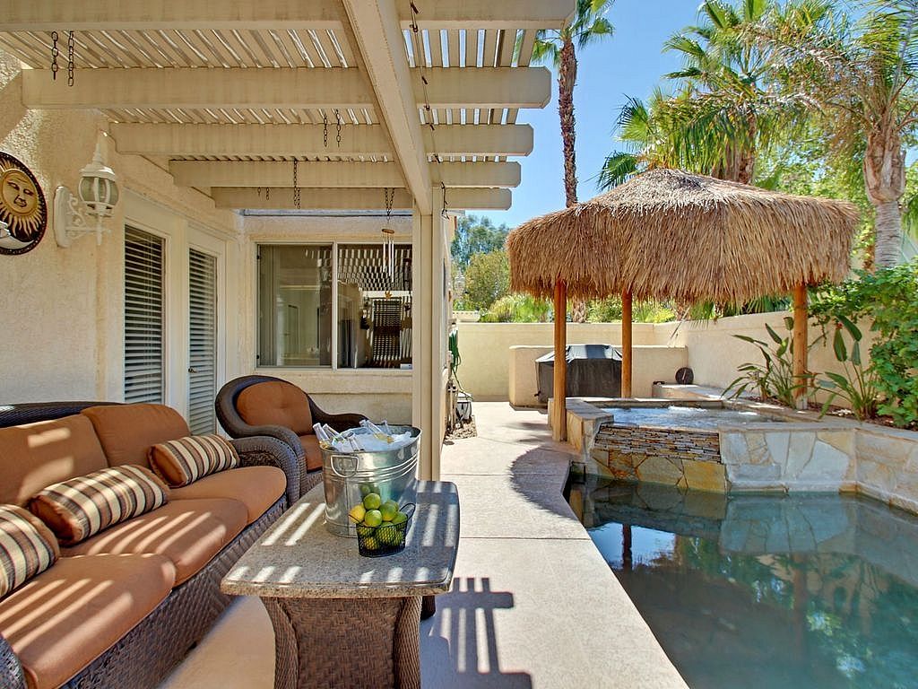 This La Quinta vacation rental features a stone bordered salt water pool with a waterfall and natural bottom. The cozy back yard is accented with an 8 person spa that is covered by a beautiful Palapa and misting system, guaranteed to be the most popular relaxation location during your stay, bringing the Caribbean feel to the Desert. Enjoy the shade and your favorite beverage or enjoy 350 days of sunshine and catch some rays in the pool while listening to some tunes with the outdoor speakers, the choice is yours.