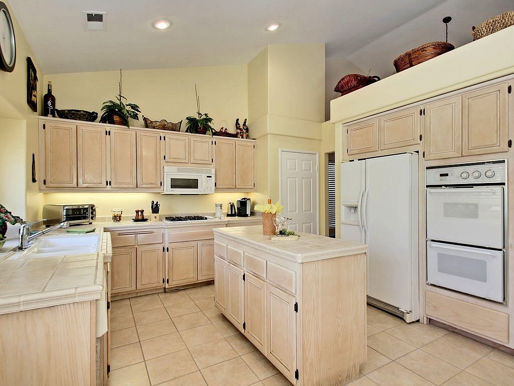 The kitchen in this La Quinta vacation rental has everything that you need with a gas range double oven, gas cook top, microwave, and dishwasher. There is plenty of counter space and cooking utensils to prepare large meals with friends and family or to simply spread out your take home meal (after all you are on vacation).