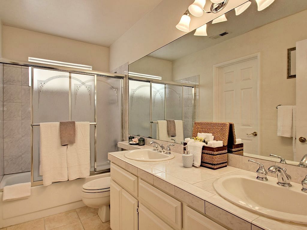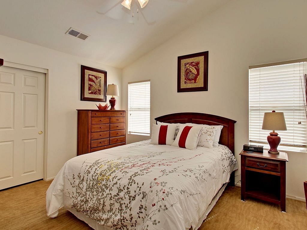 The spacious master retreat will inspire relaxation with French doors that open up to a stylish king size bed, comfortable linens, and a 37 inch Flatscreen TV. The master bath is large with a stand up shower, his and her sinks and Jacuzzi tub. There is plenty of space to store your belongings in the large walk-in closet. You can access the backyard and spacious pool area from this bedroom creating a great indoor/outdoor setting.