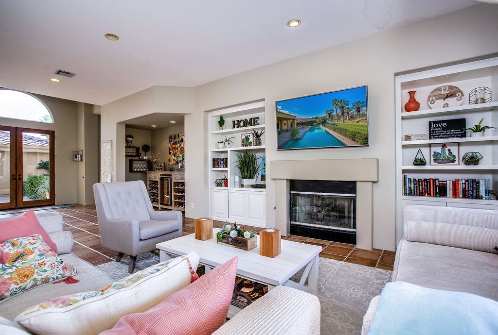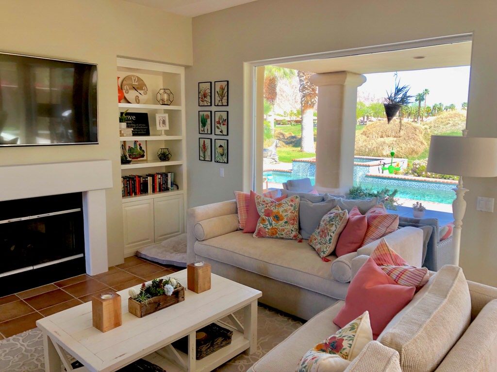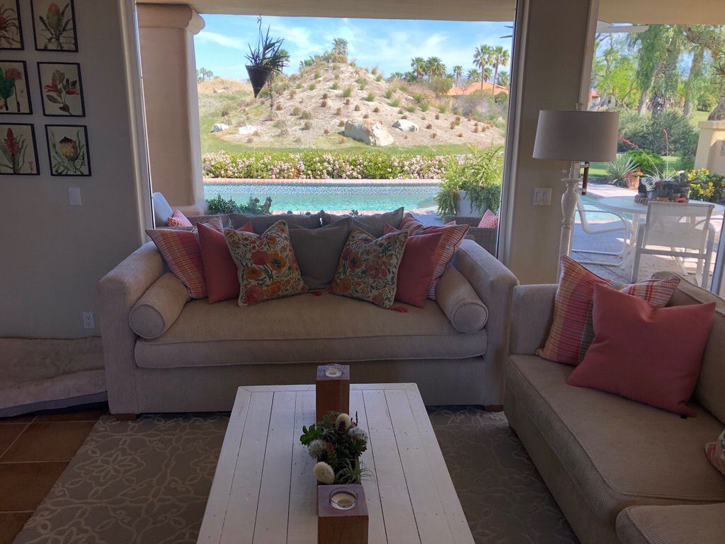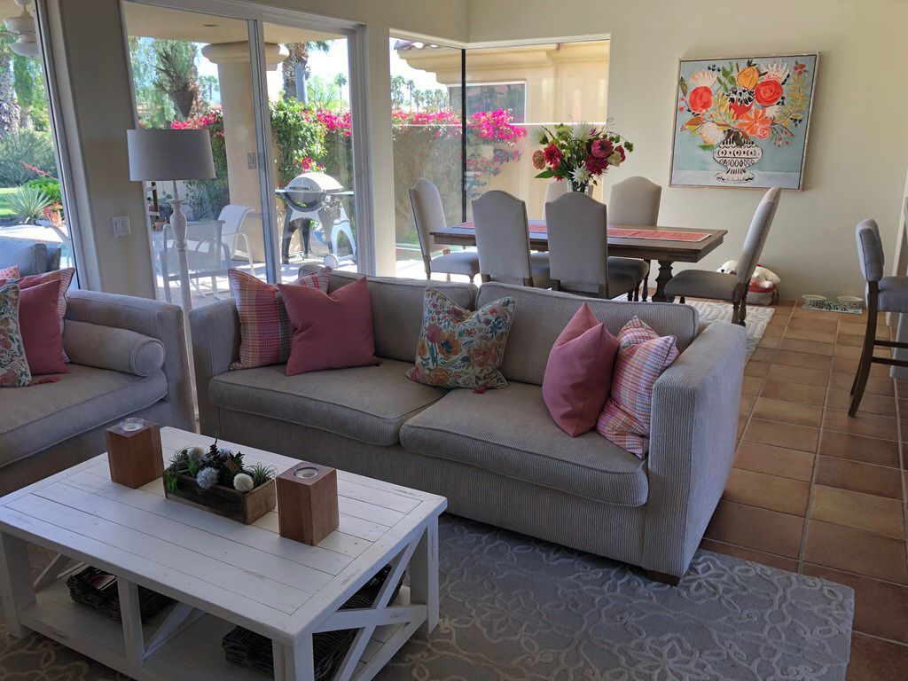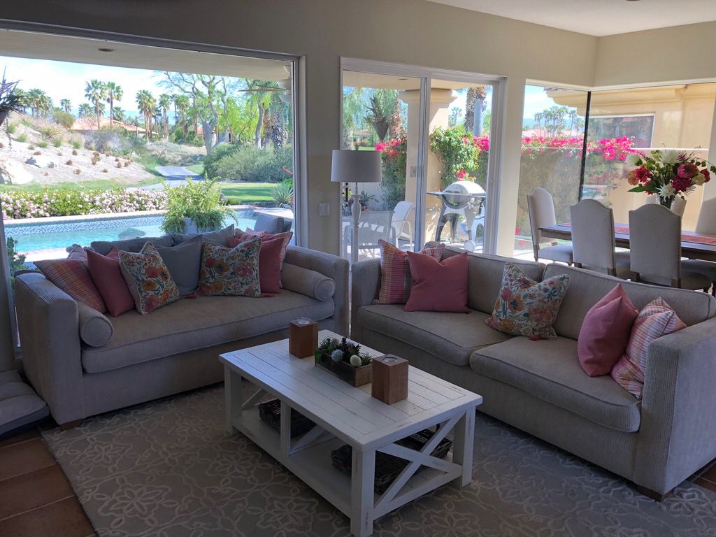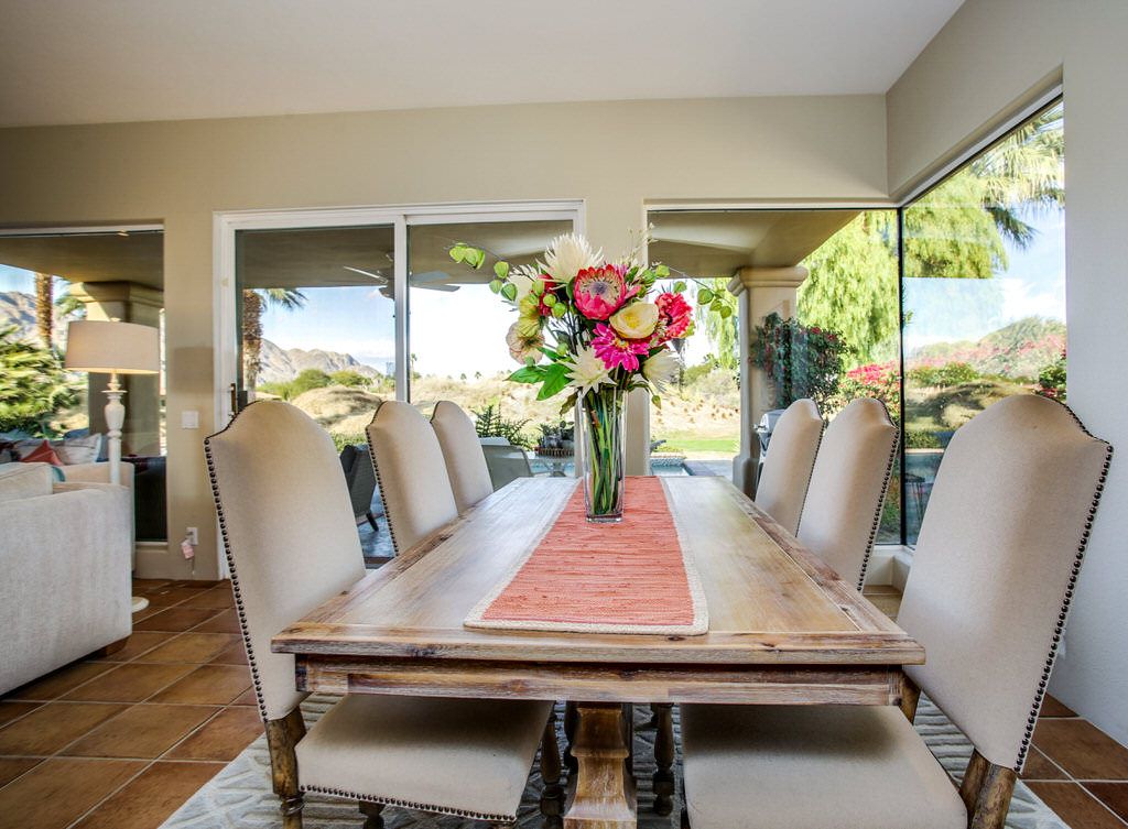 The living area of this La Quinta vacation rental is the centerpiece of the home. You'll enjoy splendid views of the private PGA West Nicklaus course and majestic mountains with the comfort and beauty of the furnishings, artwork, and fireplace. Relax by the fire, watch your favorite game on the 65" HDTV or entertain friends and family at this PGA West vacation rental.