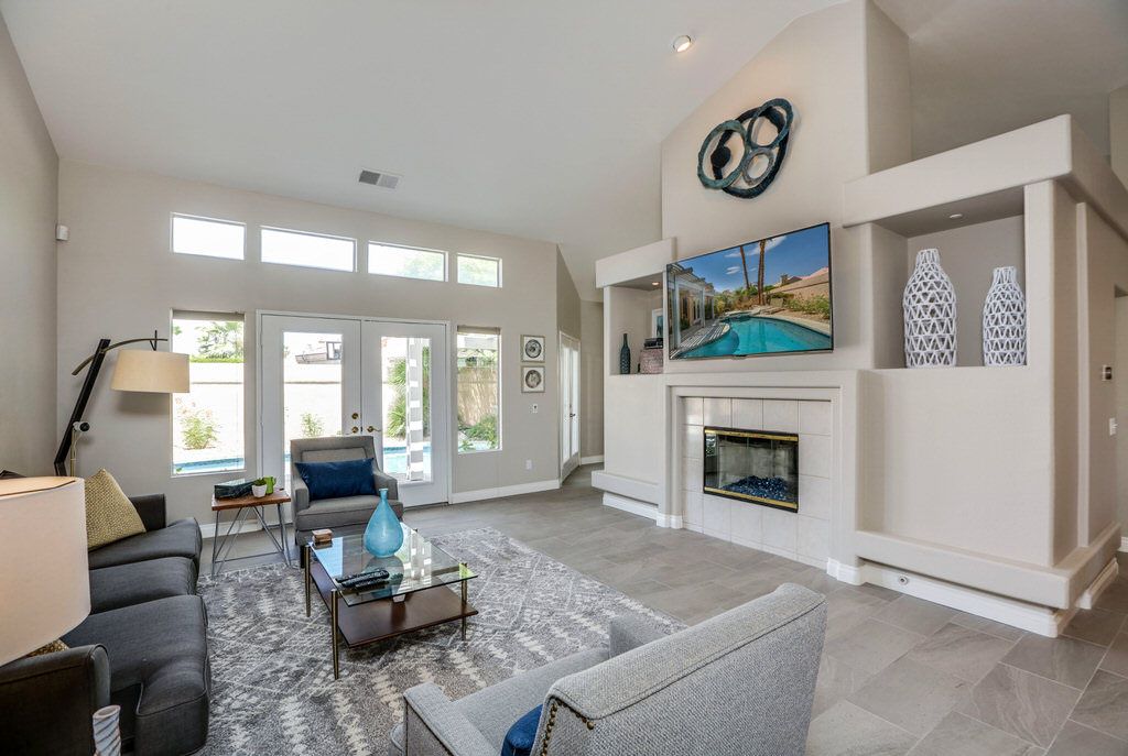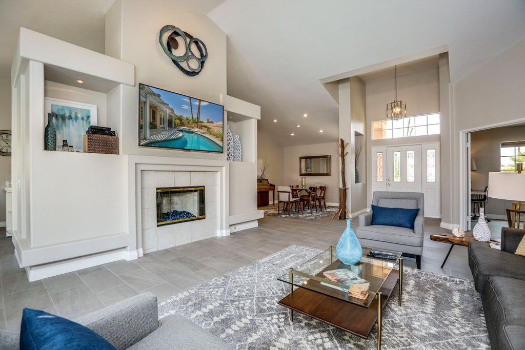 The cozy living room has a fireplace to warm and set the mood for nights around the TV or entertaining in the casual dining area.
