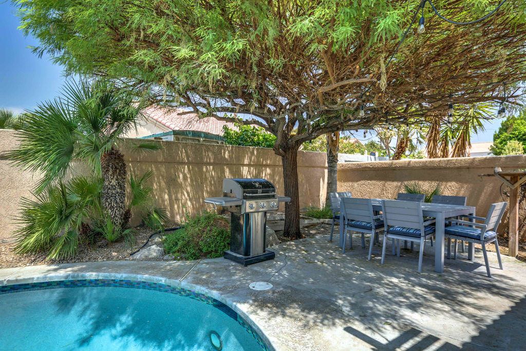 The sparkling pool and spa offer magnificent views of the Palm Springs area Mountains. A sitting area under a large shade tree off tranquility and is lit at night. At the top of the private yard features a built in spa, and comfortable seating area with peaceful mountain views to enjoy afternoon cocktails or watch the sunset over the mountains.