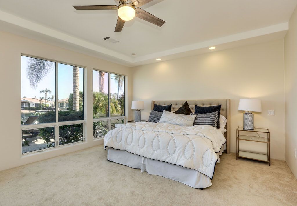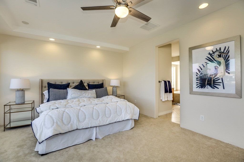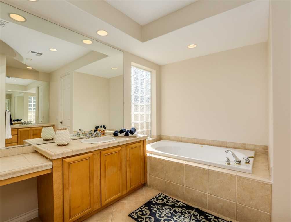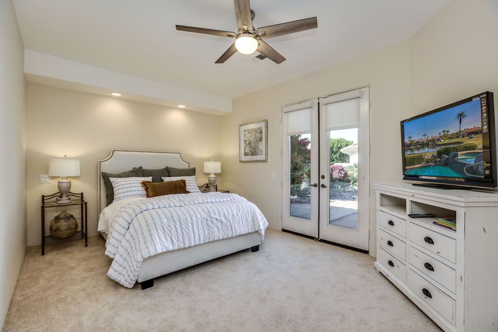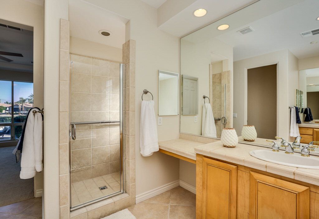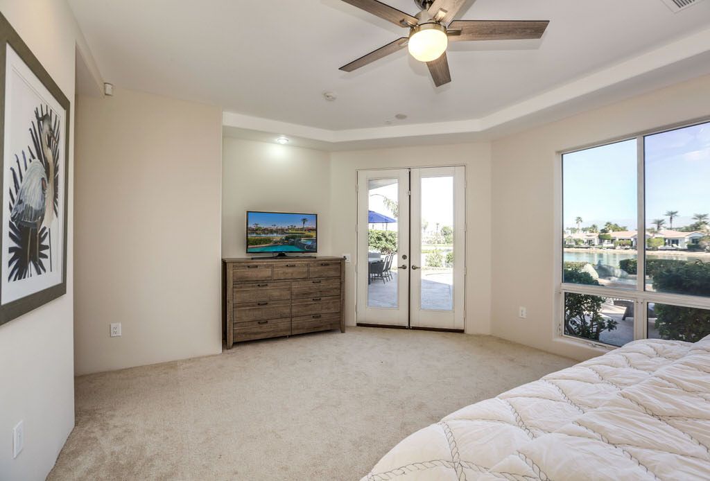 The master bedroom of this lovely La Quinta vacation home for rent is stylish and comfortable with King bed, direct access to the pool deck and spectacular views. The master bath is spacious and complete with a soaking tub, walk-in shower, dual sinks and a large walk-in closet.