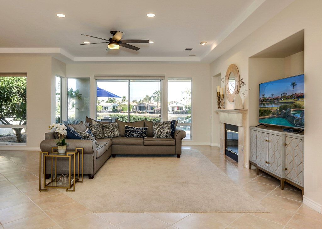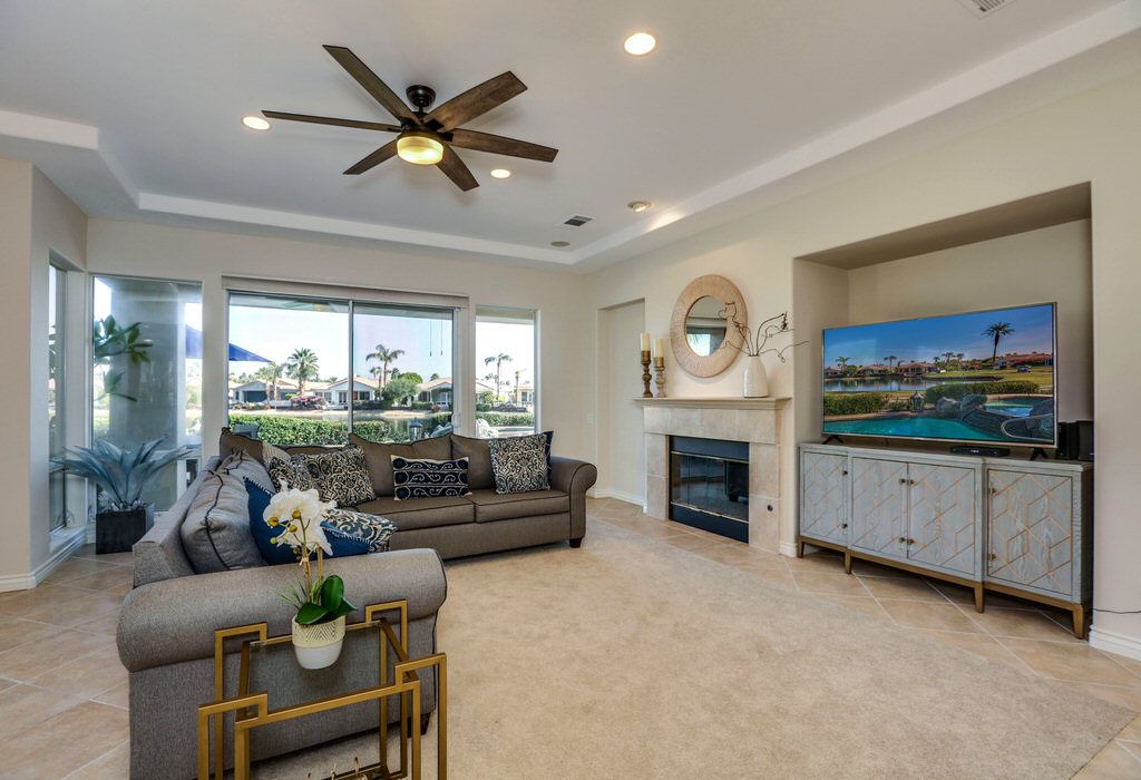 The sunny and bright northern western facing living room in this La Quinta vacation rental is elegantly appointed with floor to ceiling windows, comfortable sofas, and a 65 inch HDTV and DVR.