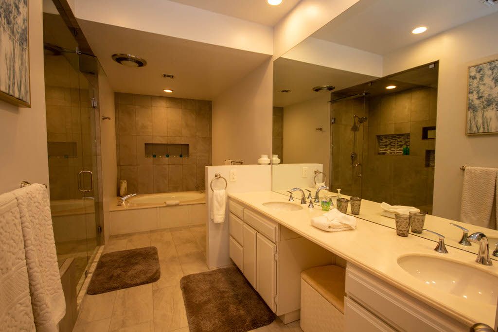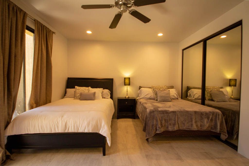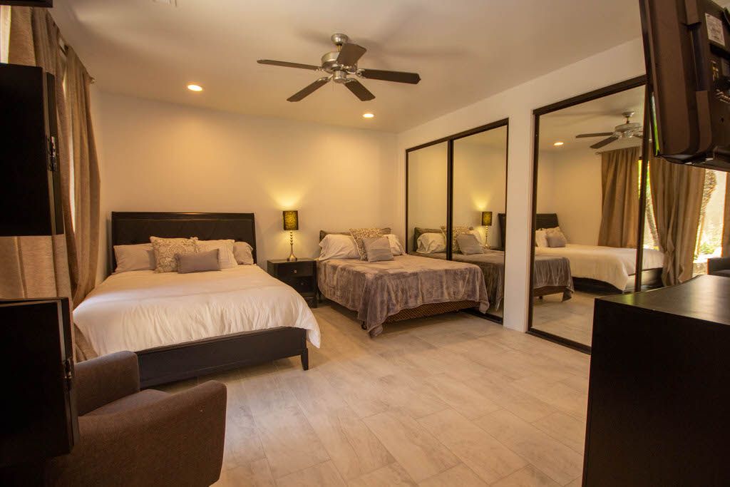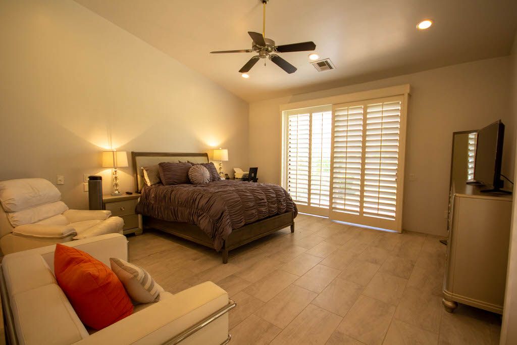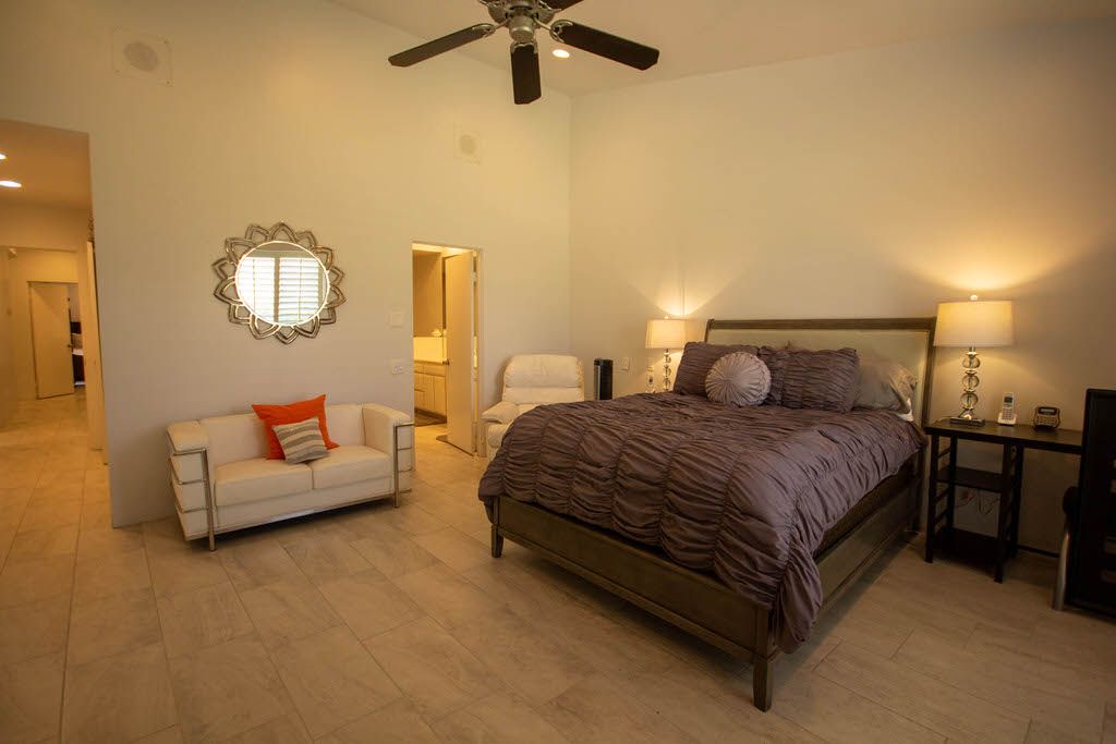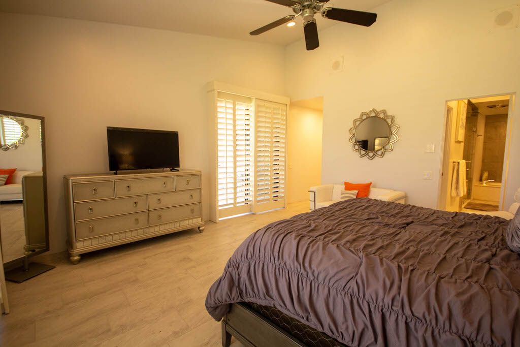 The master bedroom features a queen bed, direct access to the back patio and en-suite bath with walk in shower. The first guest bedroom features 2 queen beds with an en-suite bathroom and the second guest bedroom features 1 queen size bed and en- suite bathroom .