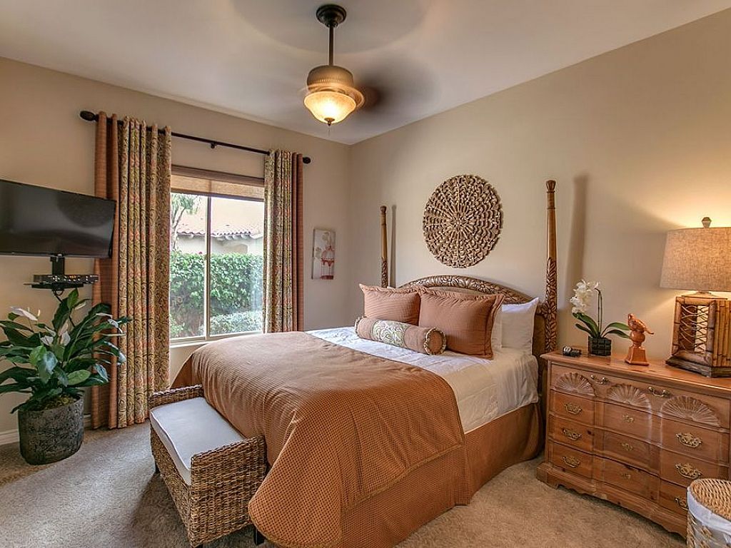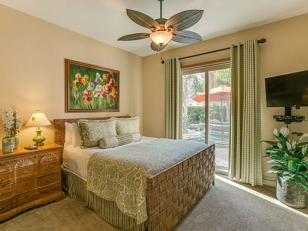 Your first guest bedroom features a Cal King size bed with a 32" flat screen television, ceiling fan and a private door leading to the swimming pool and spa courtyard, this suite also features it own en-suite bathroom with tub and shower combination.