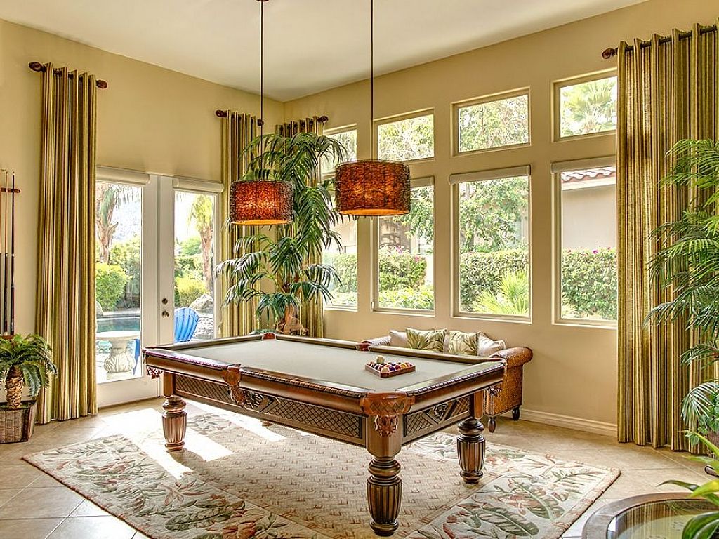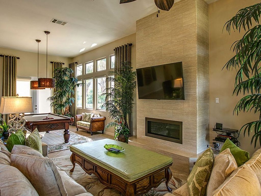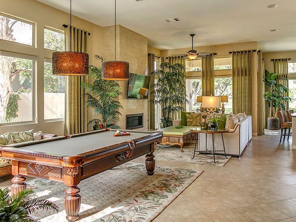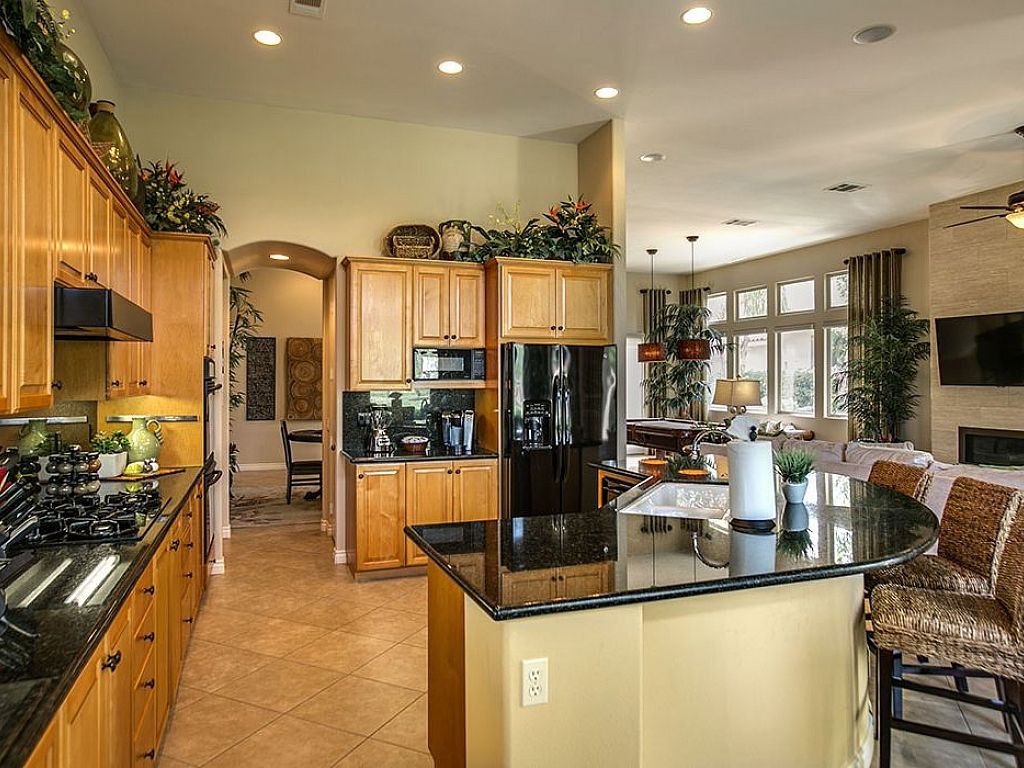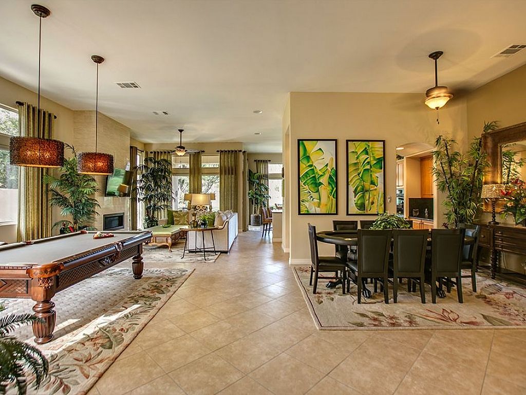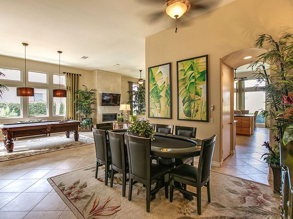 From the moment you walk into this home, you will immediately know that you are in for a treat. A pool table introduces you to the grand family room with a 60" flat screen television over the gas fireplace to create an inviting ambiance. For additional entertaining, look in the living room ottoman to find a 5' Craps table to start your own Vegas style night. Open to the family room is the gourmet kitchen with built in appliances and a large center island with 3 bar-stools adjoining to the dining nook with a table for 8 dining guests; large glass windows and sliders bring in the golf course views.