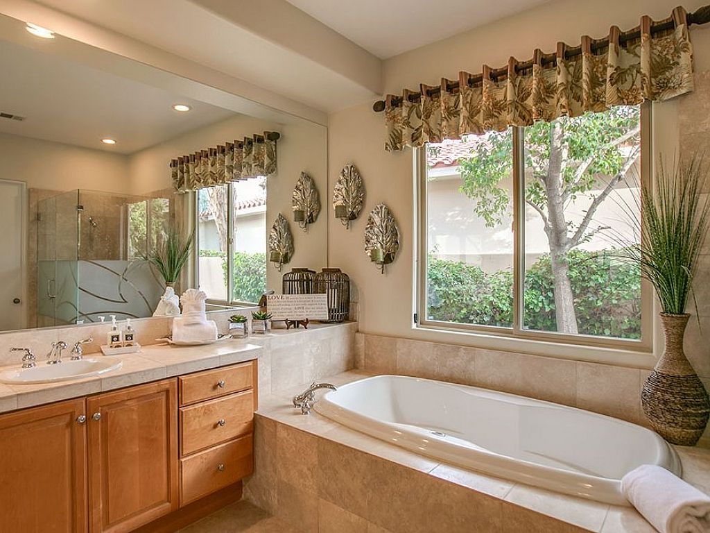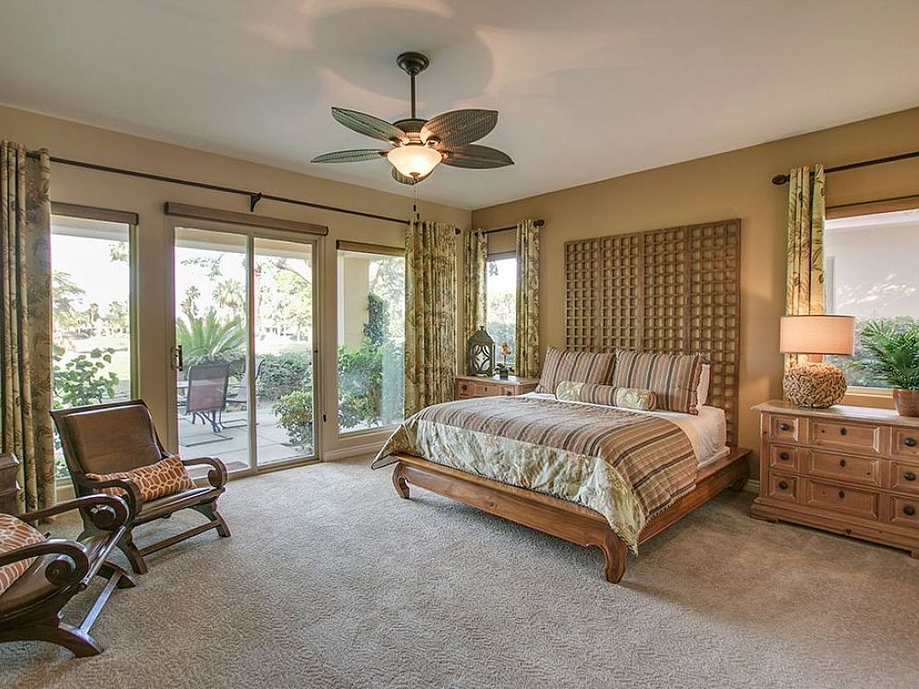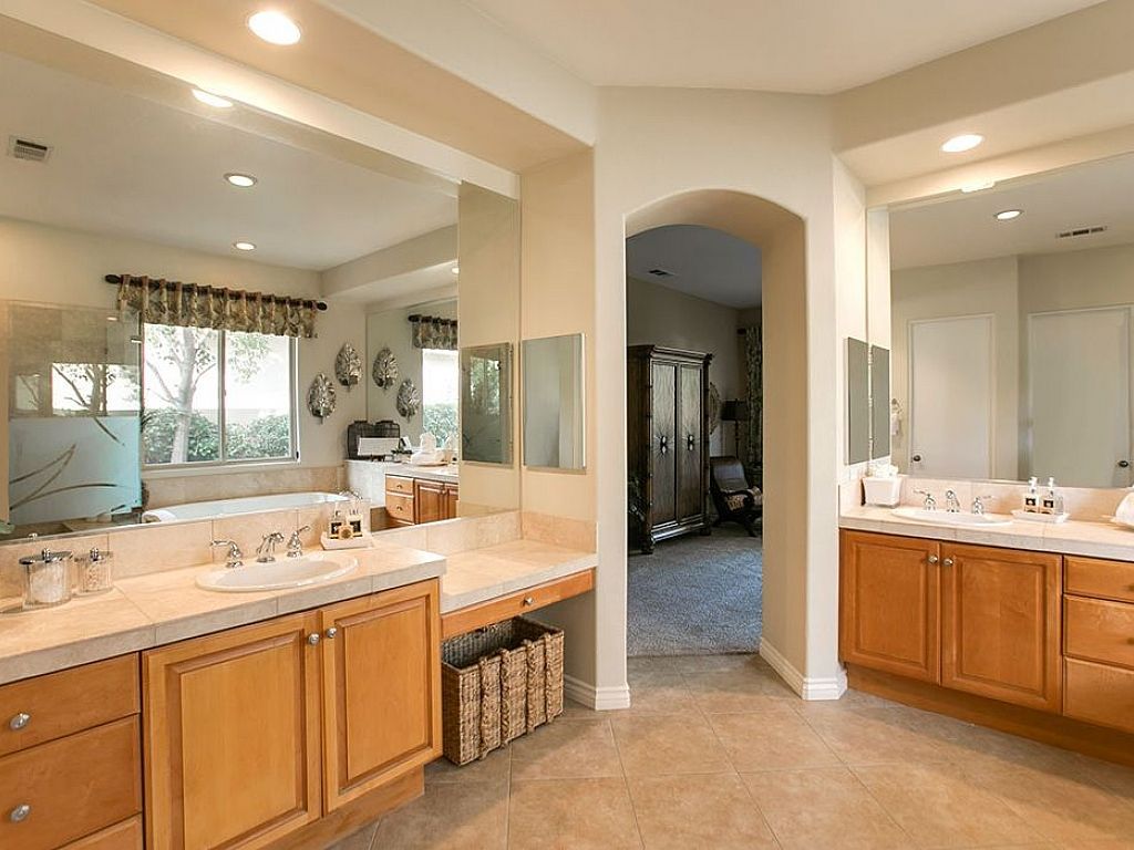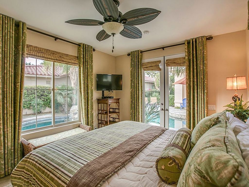 The master suite features a Cal King-size bed, 47" HDTV, sitting area with 2 chairs, and a private sliding glass door to the backyard and the golf course views. The large en-suite bathroom has a walk-in closet, his and hers vanities, an oversize soaking tub, and a large walk-in tile shower.