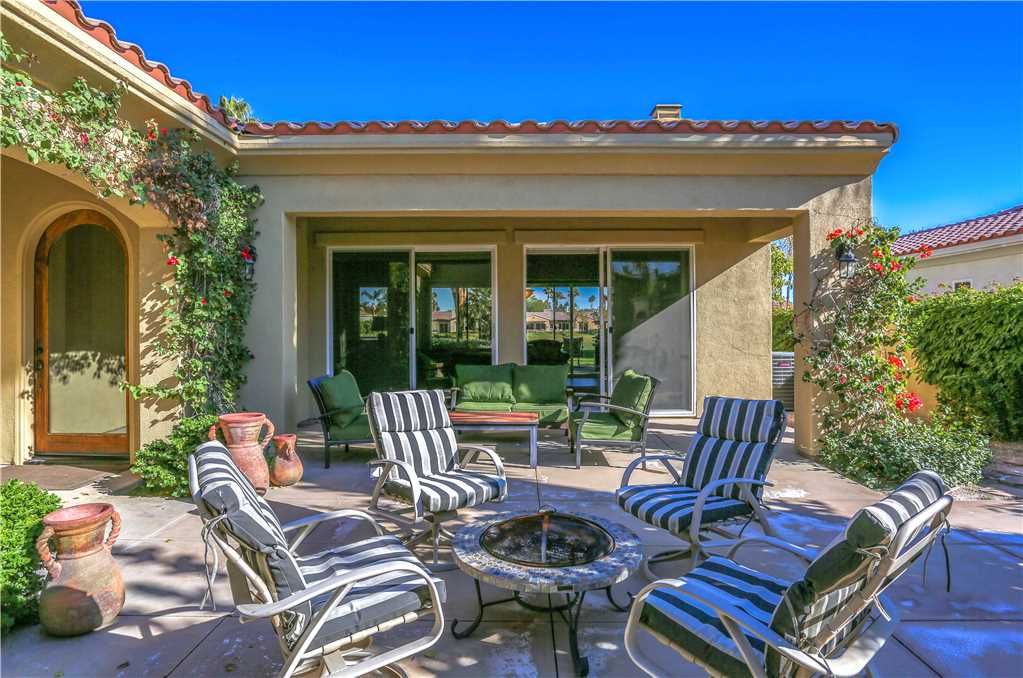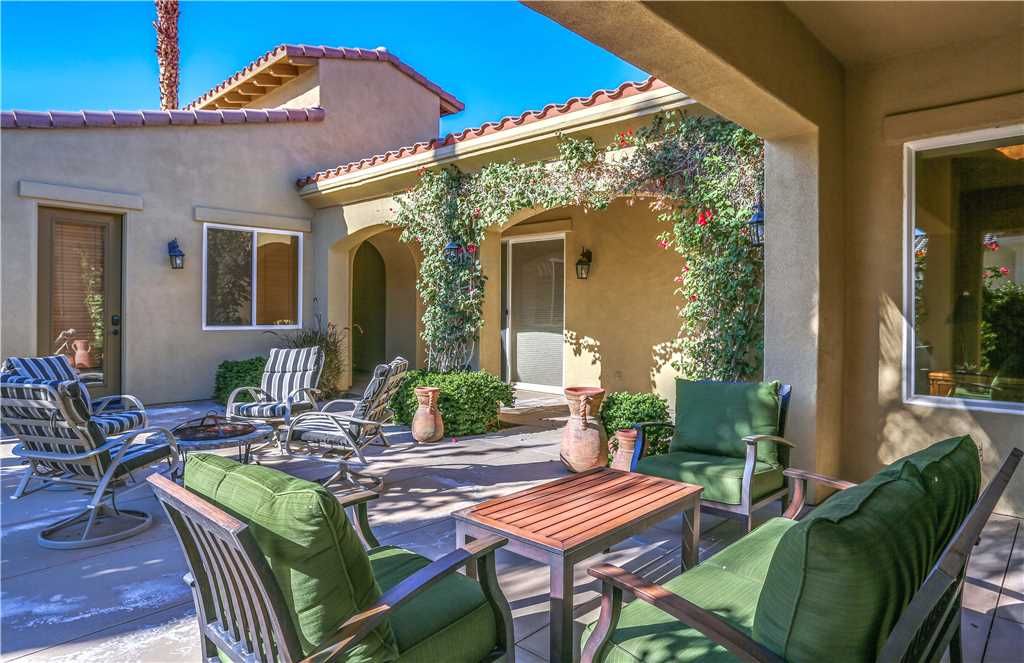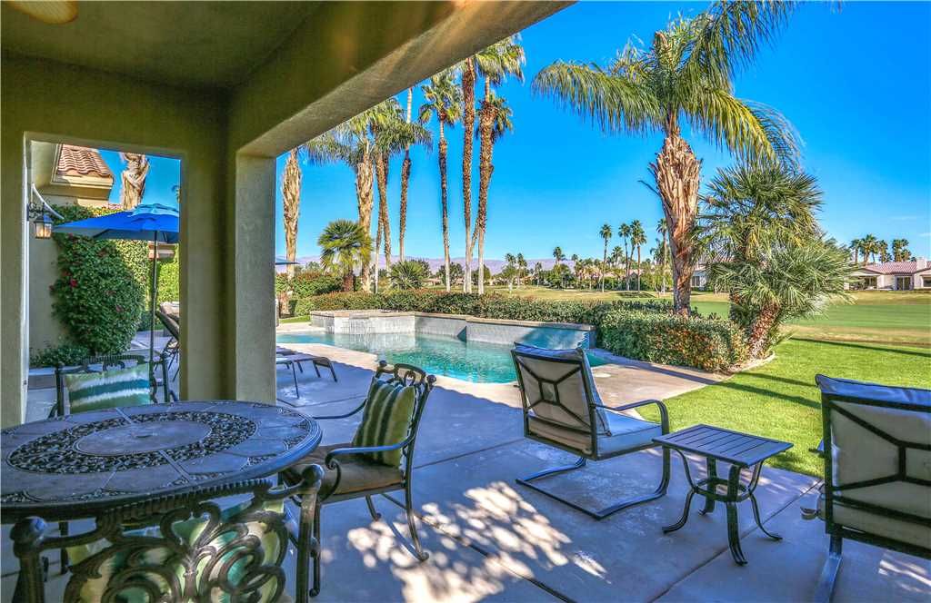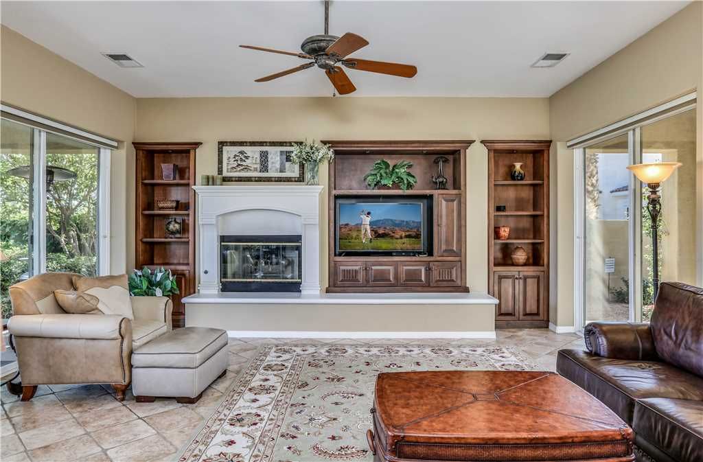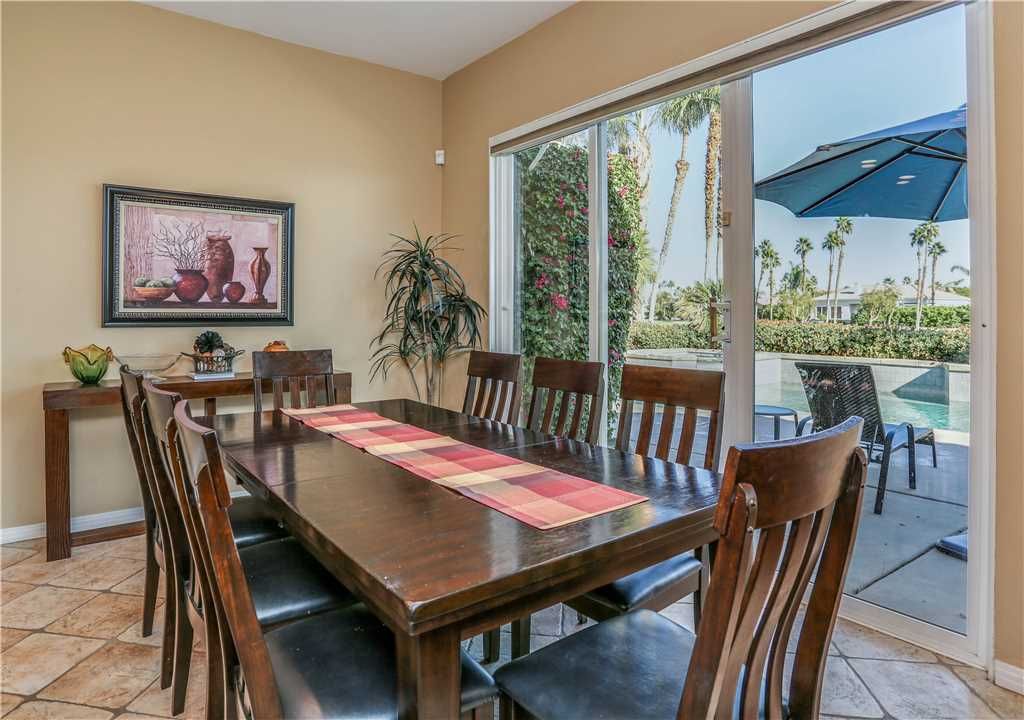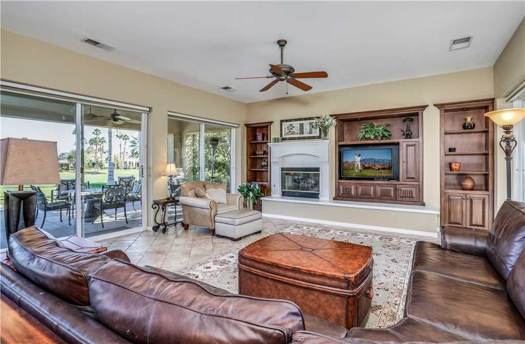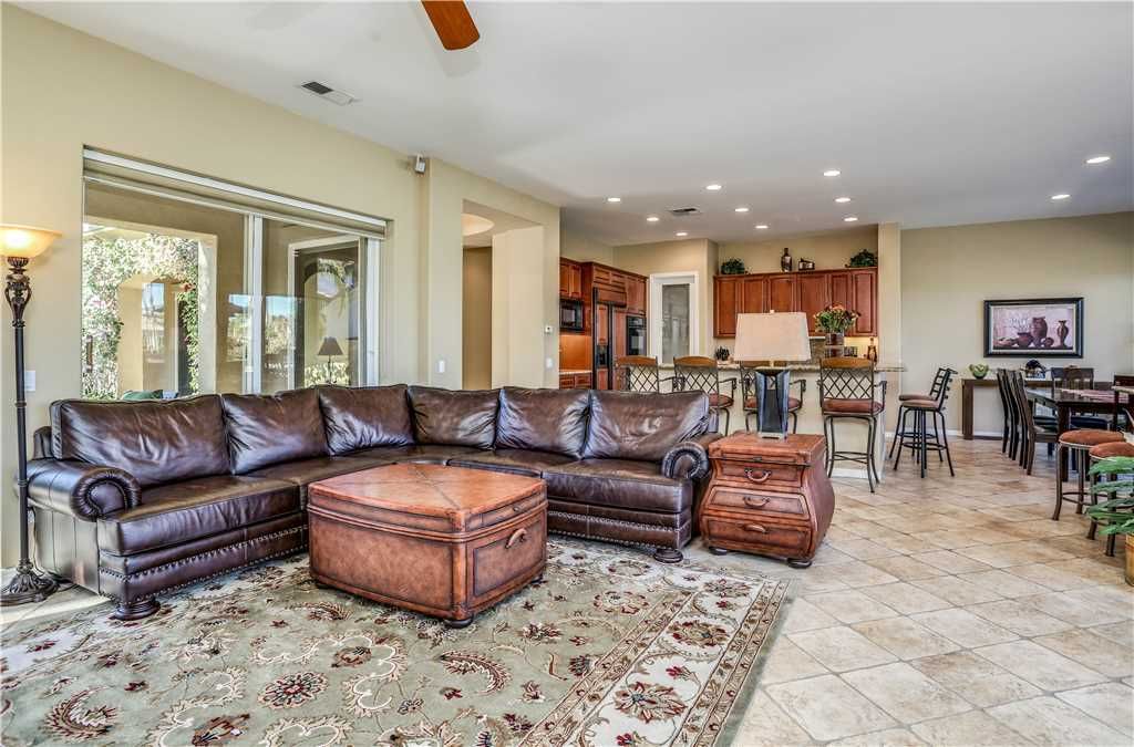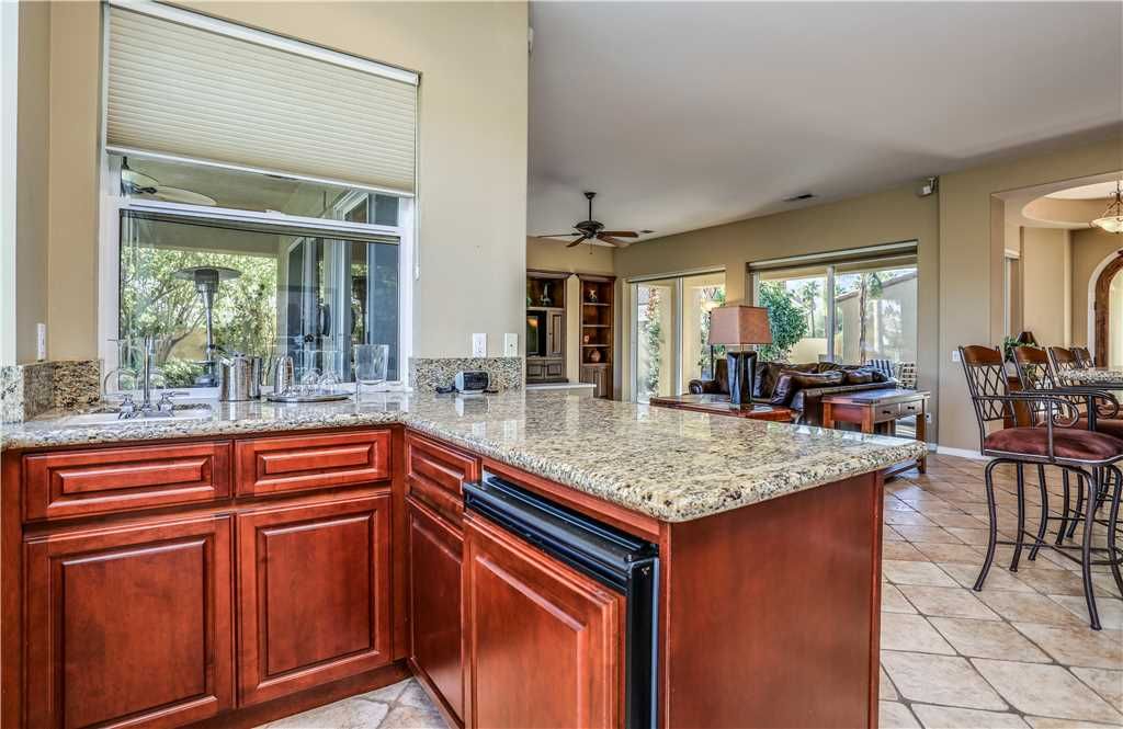 Indoors: The upgrades are all here in the gourmet kitchen including a 5 burner gas stove, double ovens, fridge, dishwasher, slab granite and rich custom cabinetry. The oversized center island is at the heart of this kitchen, with raised bar seating for 6. The dining space is just off the kitchen with seating for 6-8 and gorgeous views of the golf course. Just off the dining space is a wet bar with wine fridge and bar seating for 2. The living room is open to the kitchen for entertaining purposes and features a sofa, two comfy chairs, gas fireplace, and HDTV. The spacious courtyard and backyard connect when the wall of sliding glass doors open on each side of the living room creating a great breezeway and an open space for entertaining.