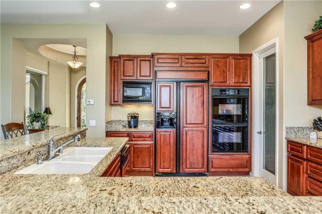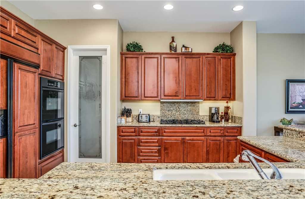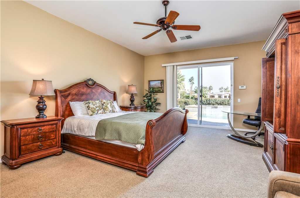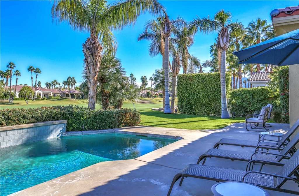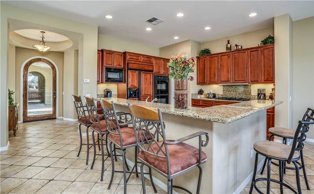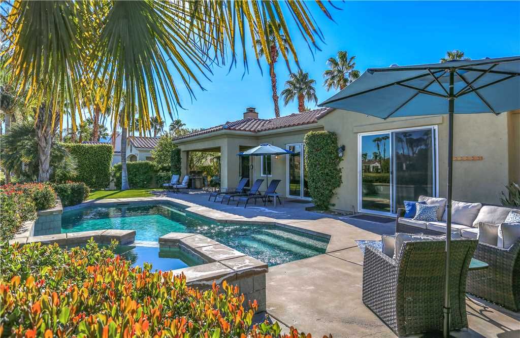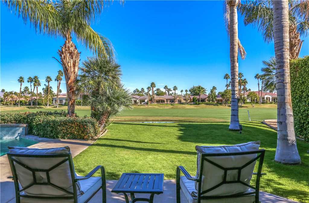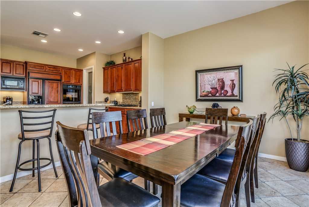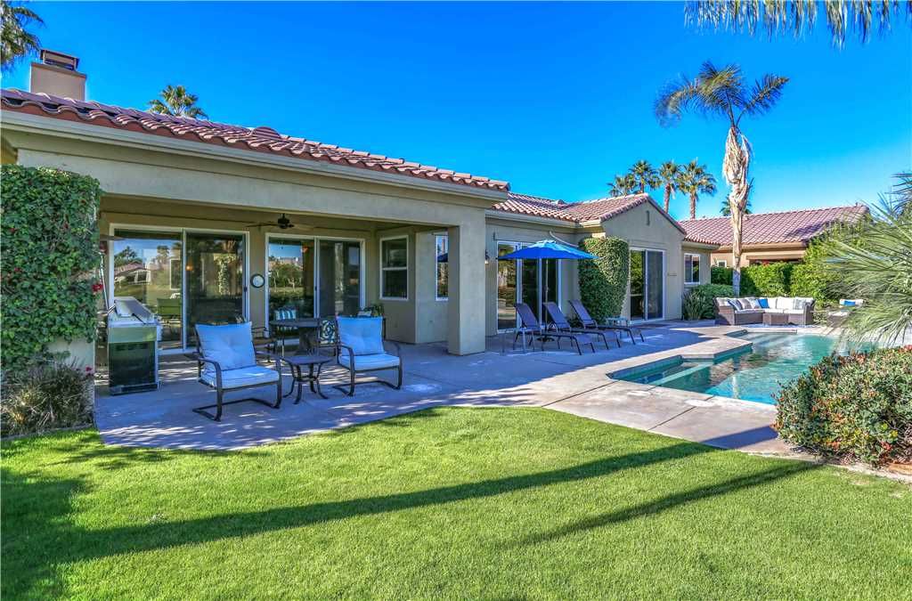 Indoors: The upgrades are all here in the gourmet kitchen including a 5 burner gas stove, double ovens, fridge, dishwasher, slab granite and rich custom cabinetry. The oversized center island is at the heart of this kitchen, with raised bar seating for 6. The dining space is just off the kitchen with seating for 6-8 and gorgeous views of the golf course. Just off the dining space is a wet bar with wine fridge and bar seating for 2. The living room is open to the kitchen for entertaining purposes and features a sofa, two comfy chairs, gas fireplace, and HDTV. The spacious courtyard and backyard connect when the wall of sliding glass doors open on each side of the living room creating a great breezeway and an open space for entertaining.