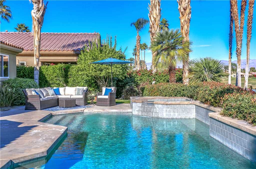 Outdoors: This spacious and inviting yard is the perfect setting to entertain friends and family with gorgeous golf course views of the 16th fairway. Majestic mountain views in every direction, and the privacy to enjoy it all while being slightly elevated off the course provides an outstanding place for family enjoyment. The beautiful saltwater pool and spa with tranquil spillover water feature are the centerpiece to the entertaining space, which also features 5 lounge chairs, and a covered patio with outdoor dining for 4 and BBQ. Spend your days in the backyard around the pool, and your nights in the intimate courtyard with a second dining space for 4, and an outdoor seating area with sofa and two chairs. The courtyard is the perfect outdoor lounging area for quiet time to curl up with a great book, or with your morning cup of coffee.
