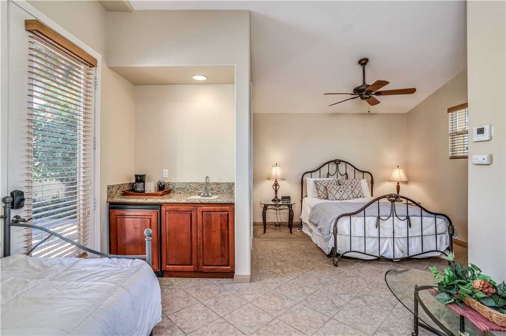 Suite 2 features a Cal King bed, reach-in closet, HDTV, and en-suite bathroom featuring a sink, and a large tiled shower. Suite 2 also features a Twin sleeper sofa. Suite 3 features a Queen bed, reach-in closet, HDTV, and a private en-suite bath with sink and tub/shower. Suite 3 also has a sliding glass door that leads to the front courtyard. Suite 4 is located in the detached casita that can be accessed through the front courtyard of the home. The casita features a Queen bed, kitchenette with sink, mini fridge and coffee maker, a walk-in closet, and a twin bed with twin trundle underneath with HDTV. The casita also has a private bathroom with sink and shower.