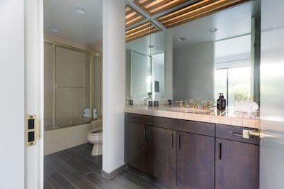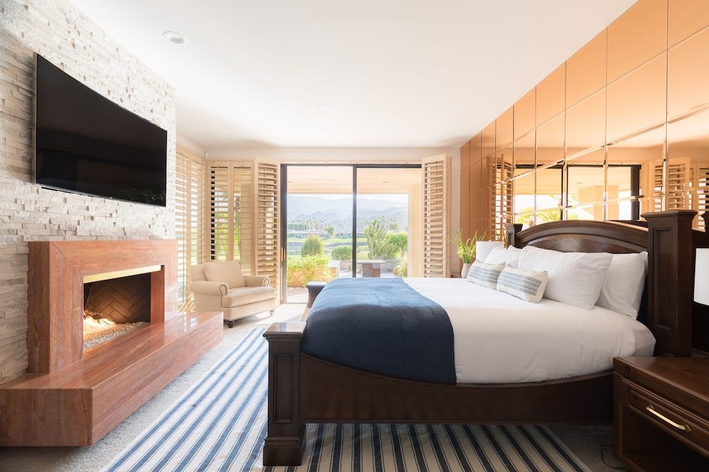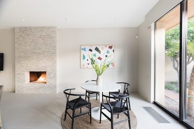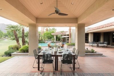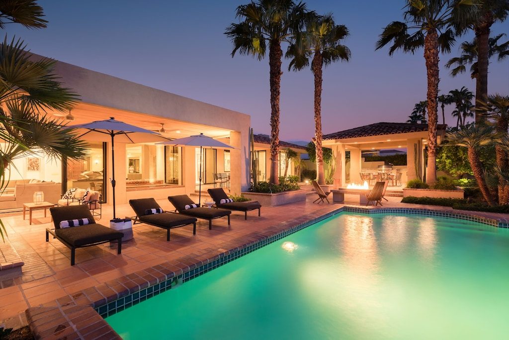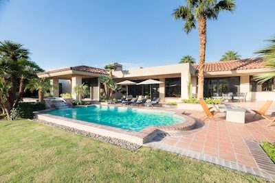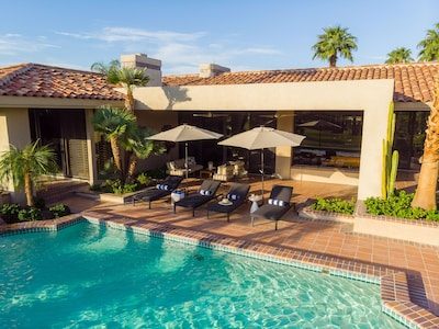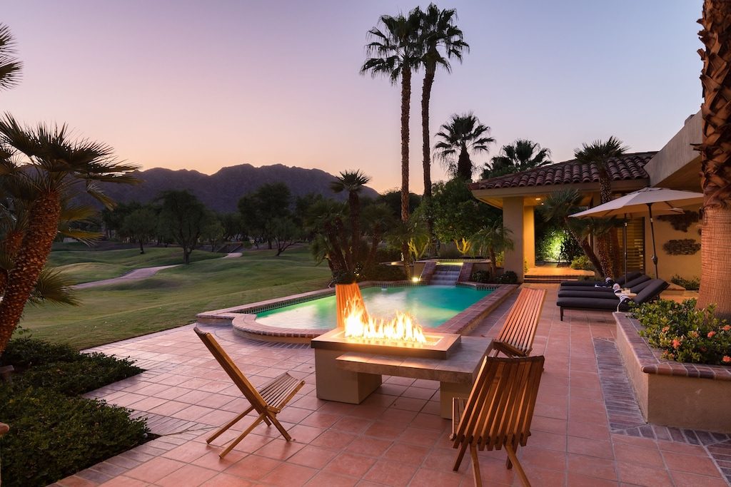 Welcome to Gokchy. This chic, contemporary residence with panoramic views of the stunning Santa Rosa Mountains is the perfect getaway for those looking to unwind in style. Situated on the PGA West Golf Course, this retreat allows guests to lounge by the pool after a day of golf, curl up with a book in the den, or sip cocktails by the fire pit during sunset. Interested in hosting a gathering? Moonshine is the perfect space. An entertainer's delight, this property provides ample accommodations for a company with plenty of indoor seating, a wet bar, foosball, and a full outdoor kitchen and seating area.