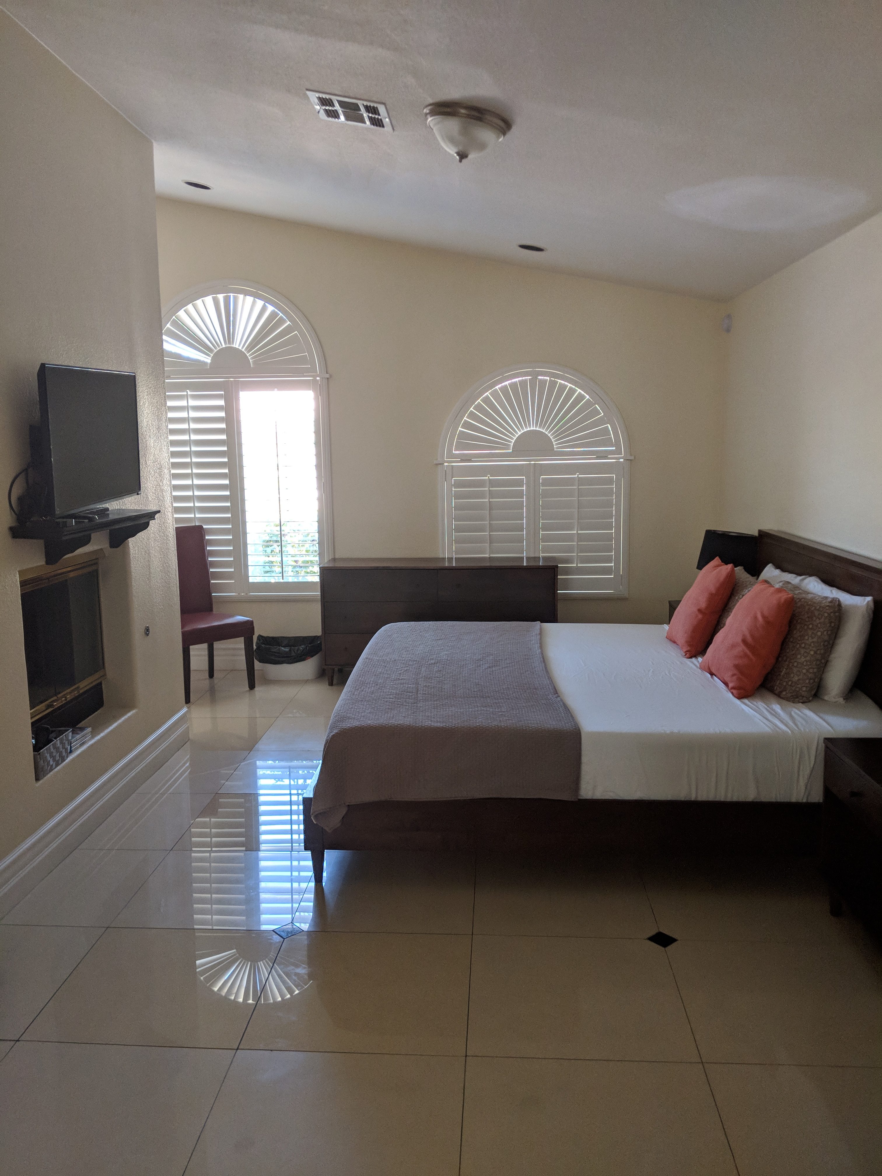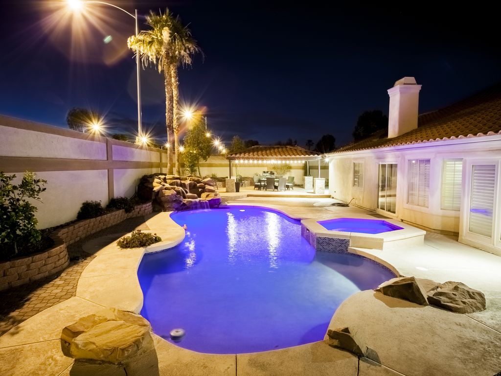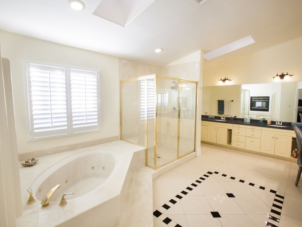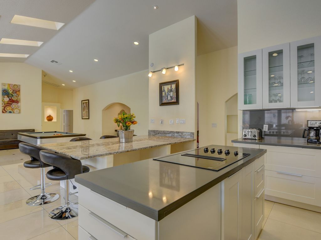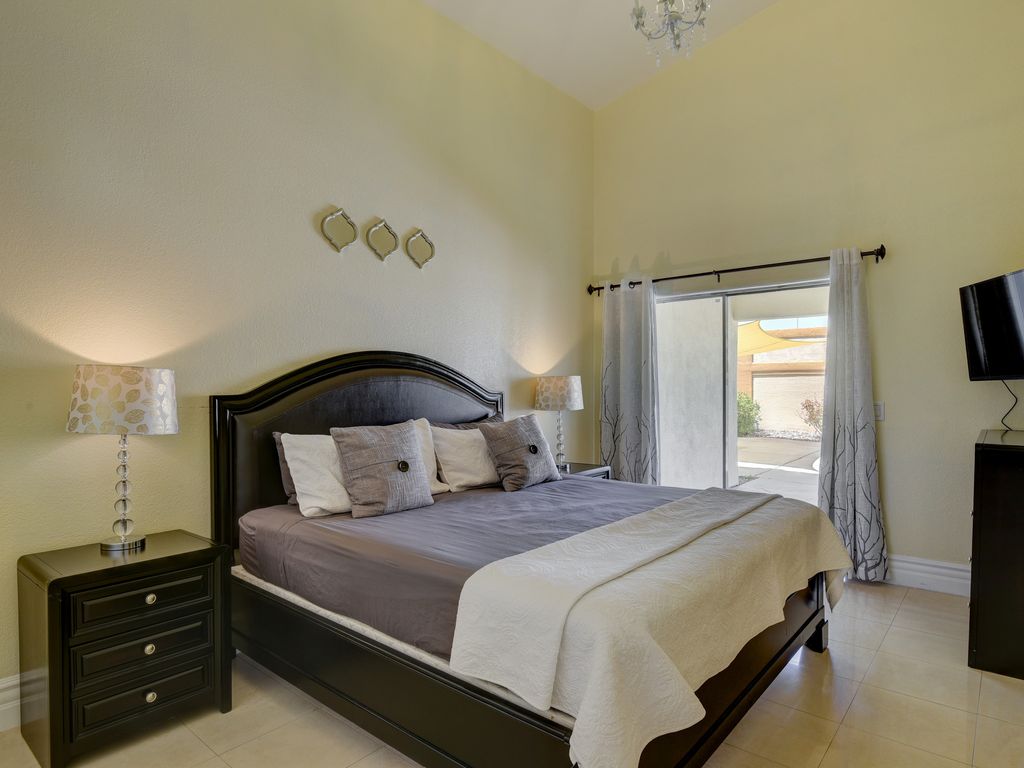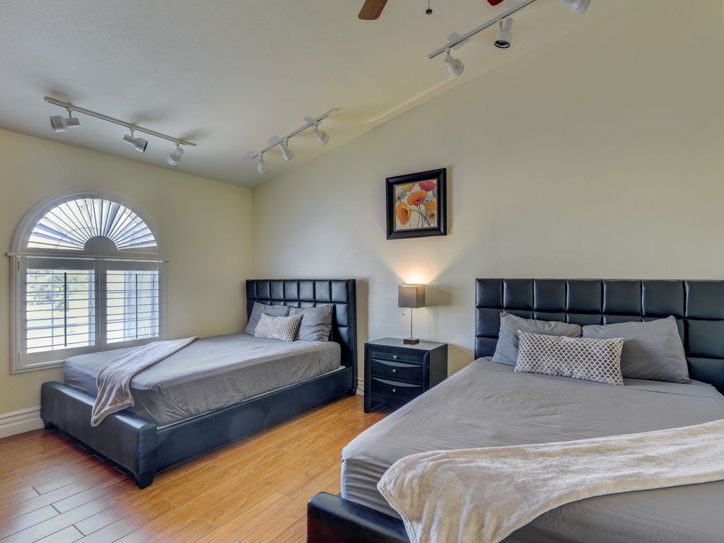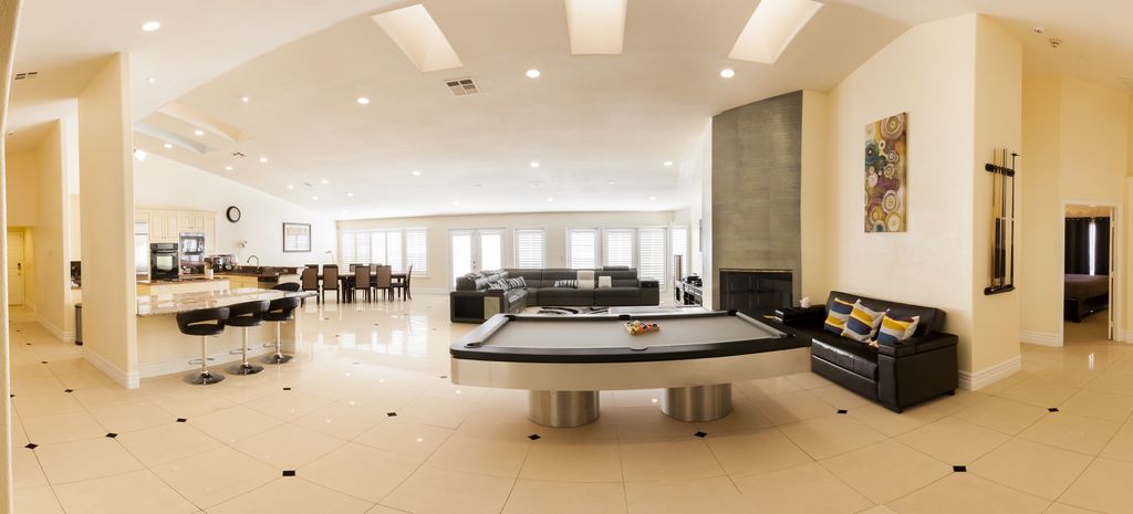 The Grand Villa, approx. (4,085 sqft of indoor space, 2,000 sqft of outdoor space, 756 sqft of garage space, for a total of 6,100 sqft of living space indoor and outdoor space plus a garage on a .5 acre property). We want you to feel like at home. Because it is your home, its our shared home. When you enter our home you feel welcomed right away by the spacious living room. 3 sofas, 65 inch TV, a pool table, a marble island counter table (sits 6), a formal dining table. The modern brand new kitchen with dinnerware for 18, all the cooking & bakeware, so you can prepare a nice dinner. The Grand Villa offers a total of 8 bedrooms, 3 bedrooms have walk in closets, 3.5 bath. The bedding is Beauty Sleep & Tulo high quality mattresses, sheets are 600 counts Egyptian cotton.