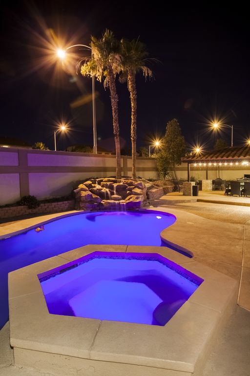 Outdoor: fire pit, 5 sun beds, a cover patio with a fan and lights, outdoor dinner table (sit 6) with extra chairs if needed, a Weber Summit BBQ, pool with cascade, jacuzzi, basket ball hoop and much more along with an outdoor ping pong table.